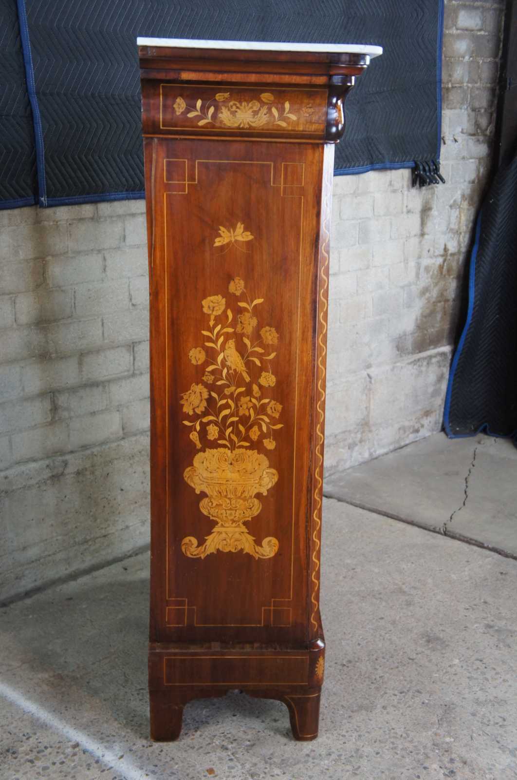 Antique Dutch Marquetry highoy chest of drawers, circa 1820s. Made of fruitwood veneers and mahogany with flame mahogany drawer fronts. Features highly detailed inlays of floral, ribboned and geometric accents. Brass drawer hardware and a white marble top. Examine closely to see the captivating bird and butterfly jardiniere motif along each side.