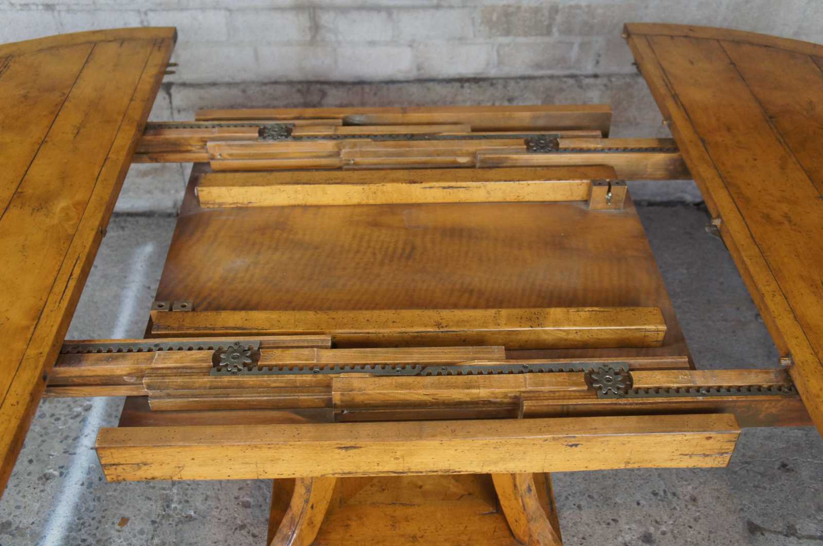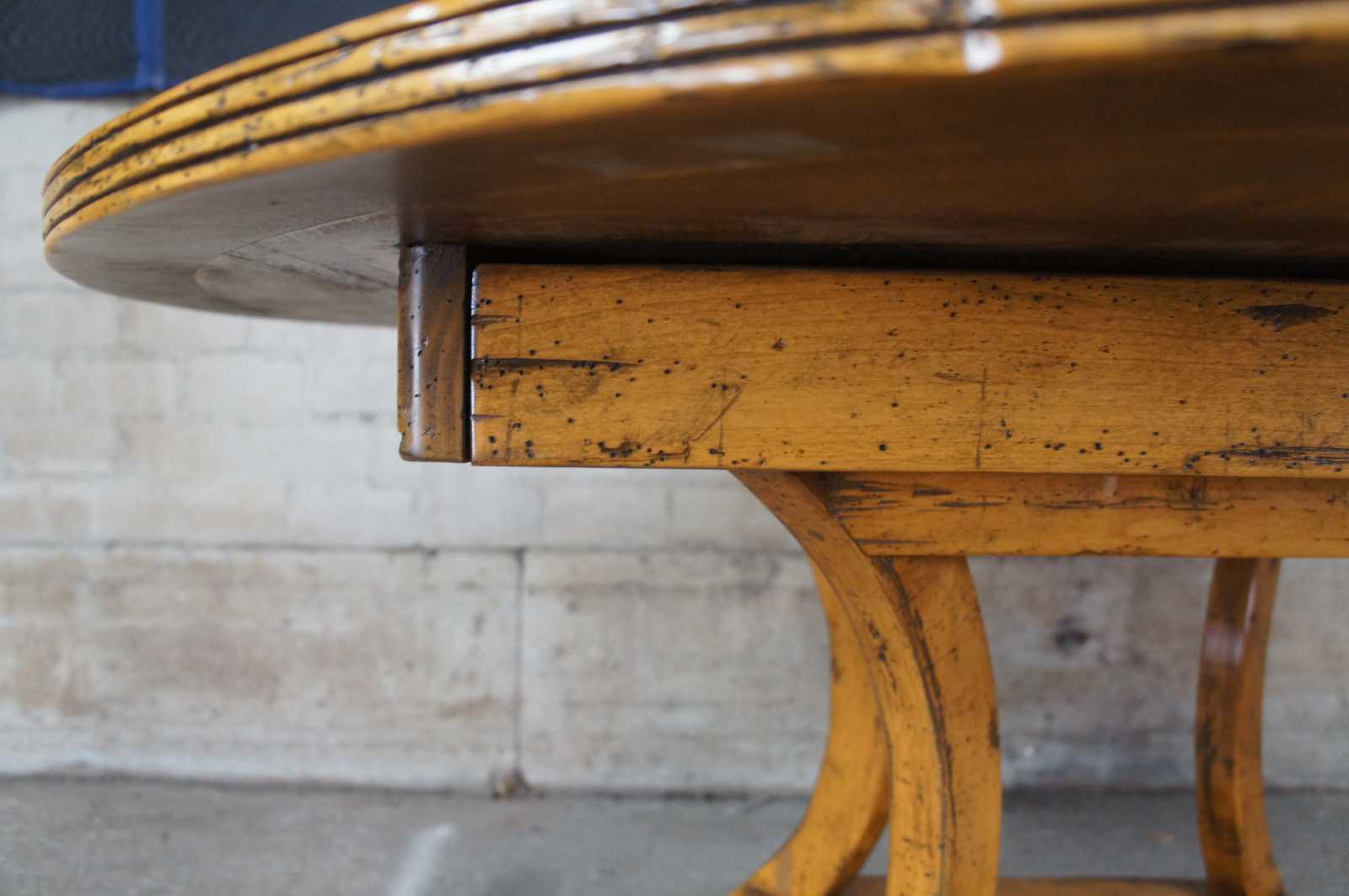 Guy Chaddock Dining Table. Distressed pine plank style top over long saber legs and brass capped feet. Circa 1999