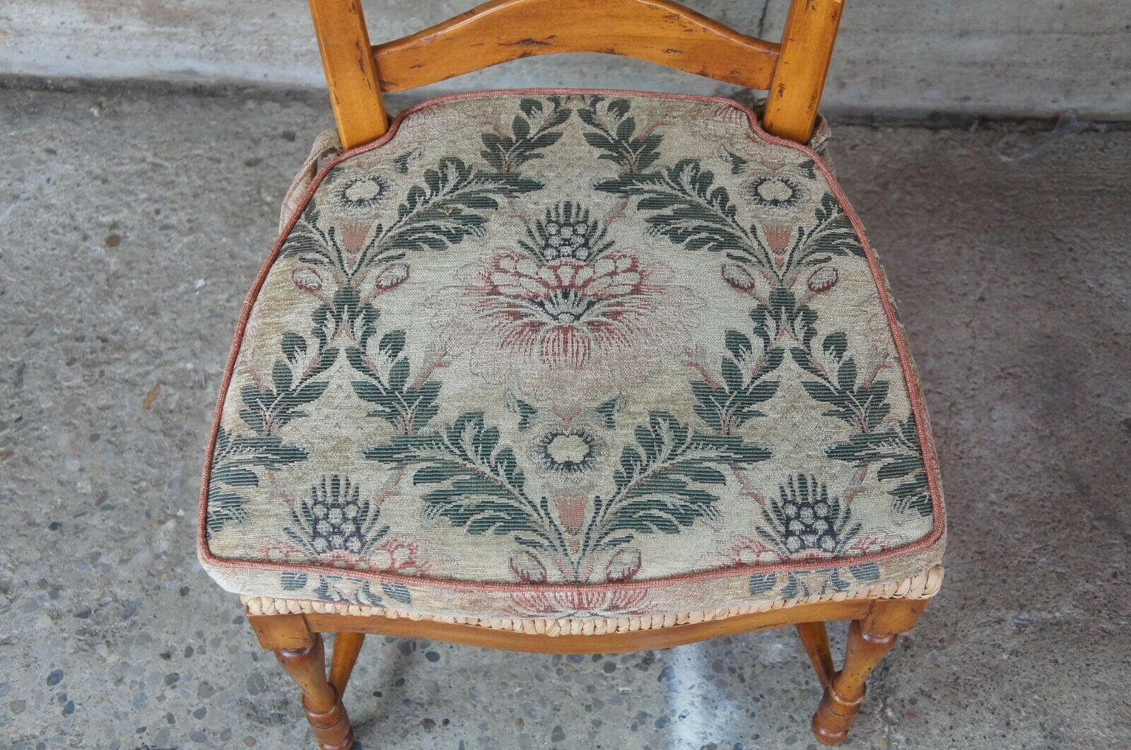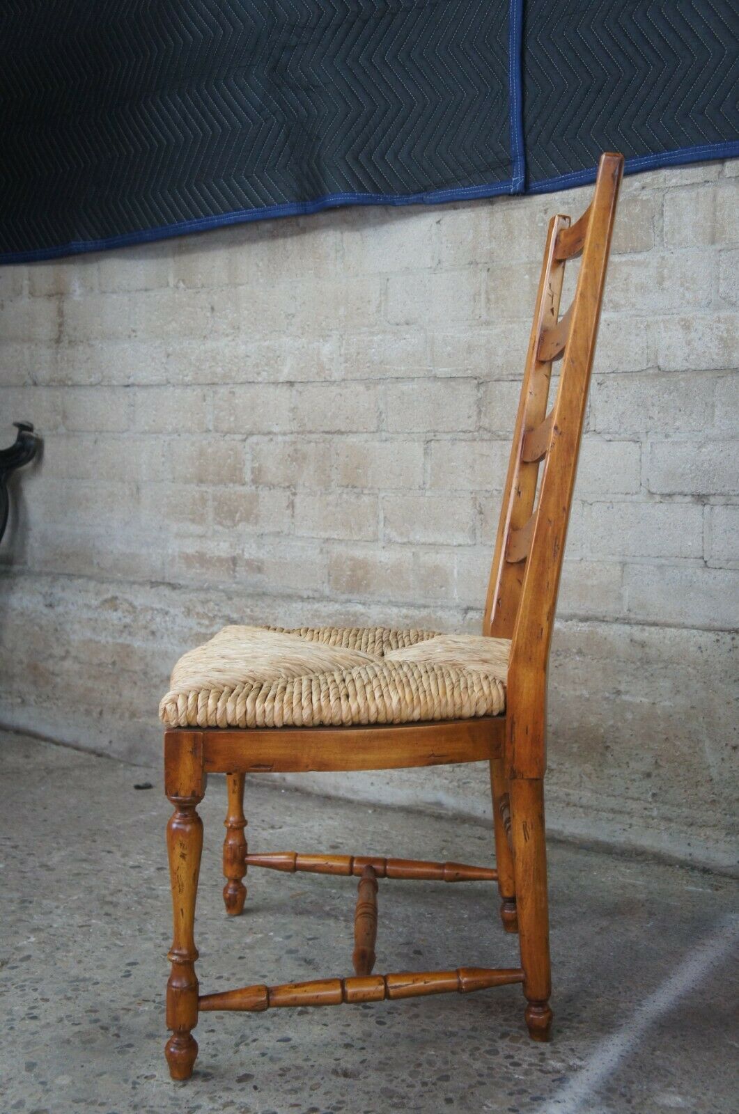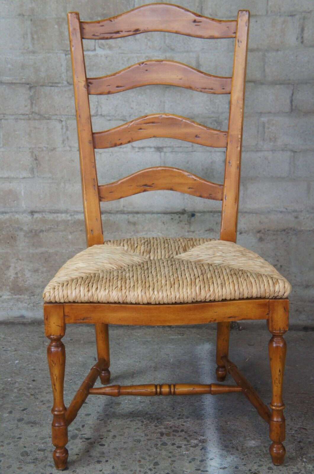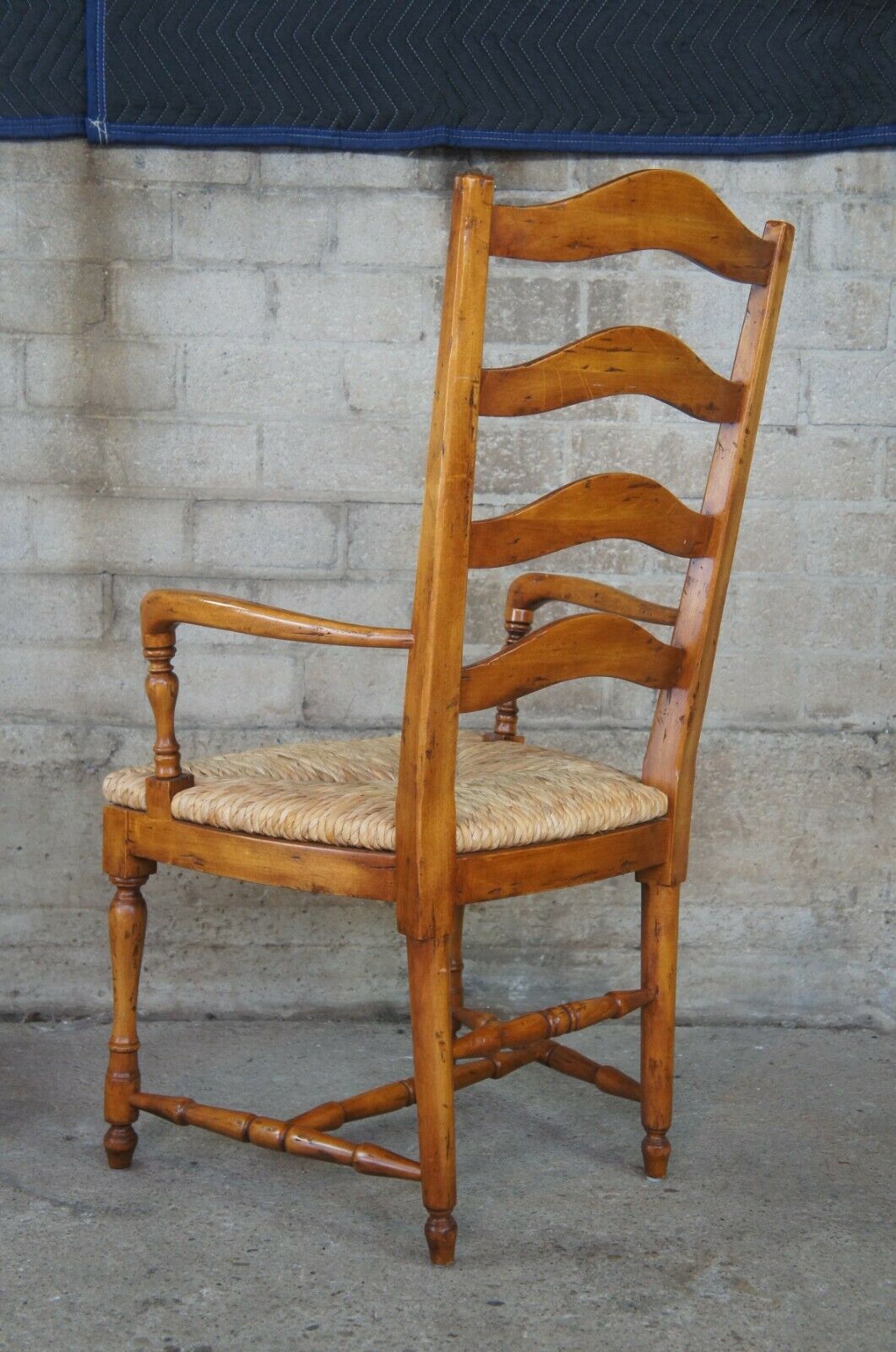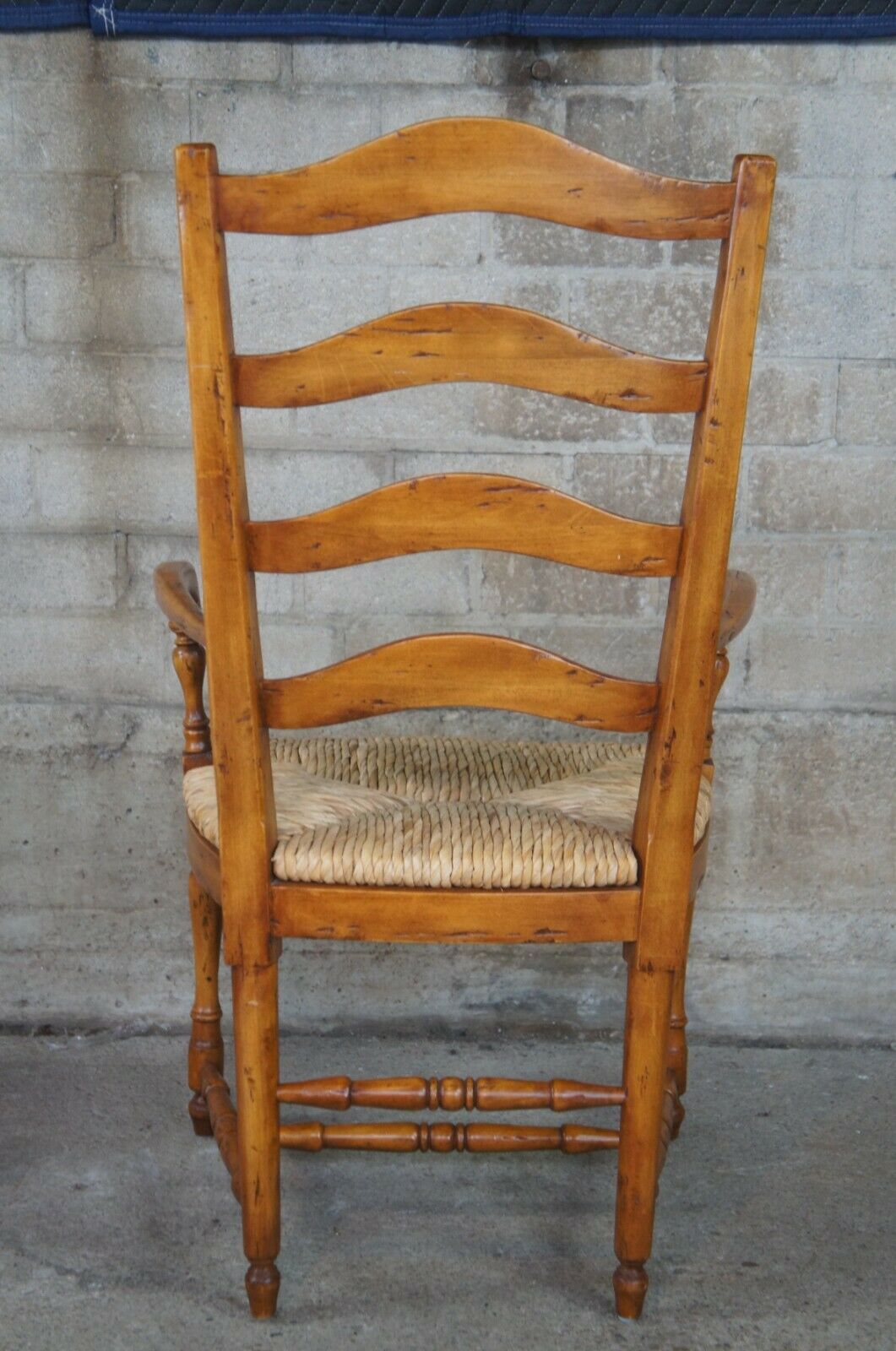 Guy Chaddock Ladderback Rush Seat Dining Arm & Side Chairs, 13301/0 UC3001. Features a distresssed hardwood frame with turned supports. Includes removable cushions.