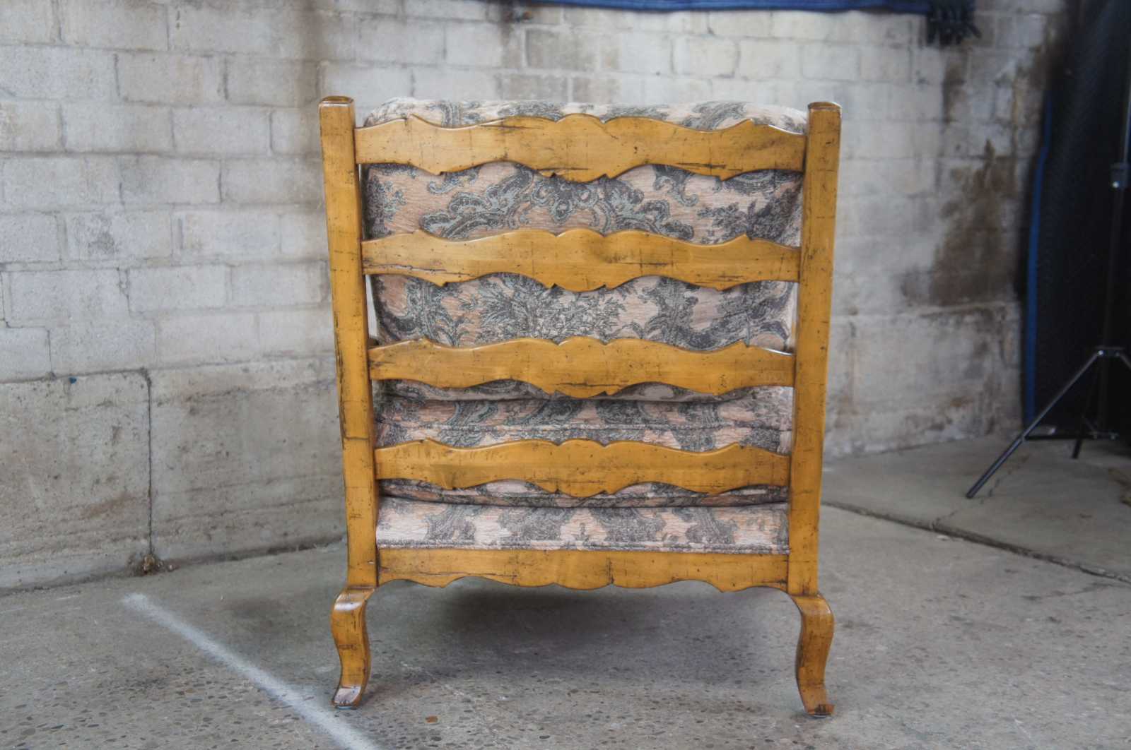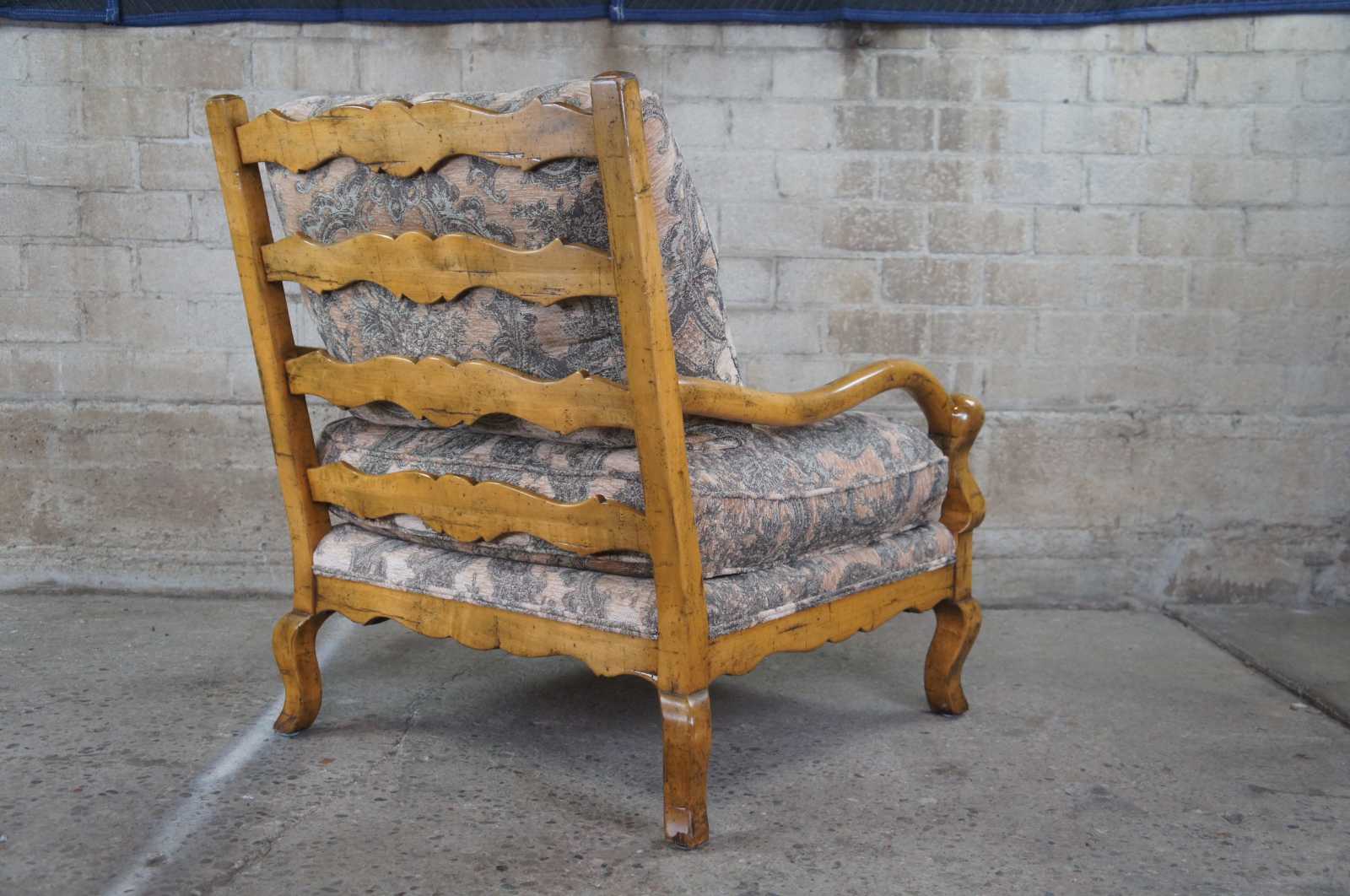 Guy Chaddock Upholstery Collection Knuckle Lound Chair, UC3001. Features a distresssed hardwood frame with smooth sloping arms, ladderback, serpentine apron and cabriole legs. Upholstered in a brocade style fabric with matching throw pillow.