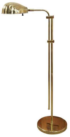 Mid century modern vintage brass floor lamp with adjustable height and clam shell shaped shade.