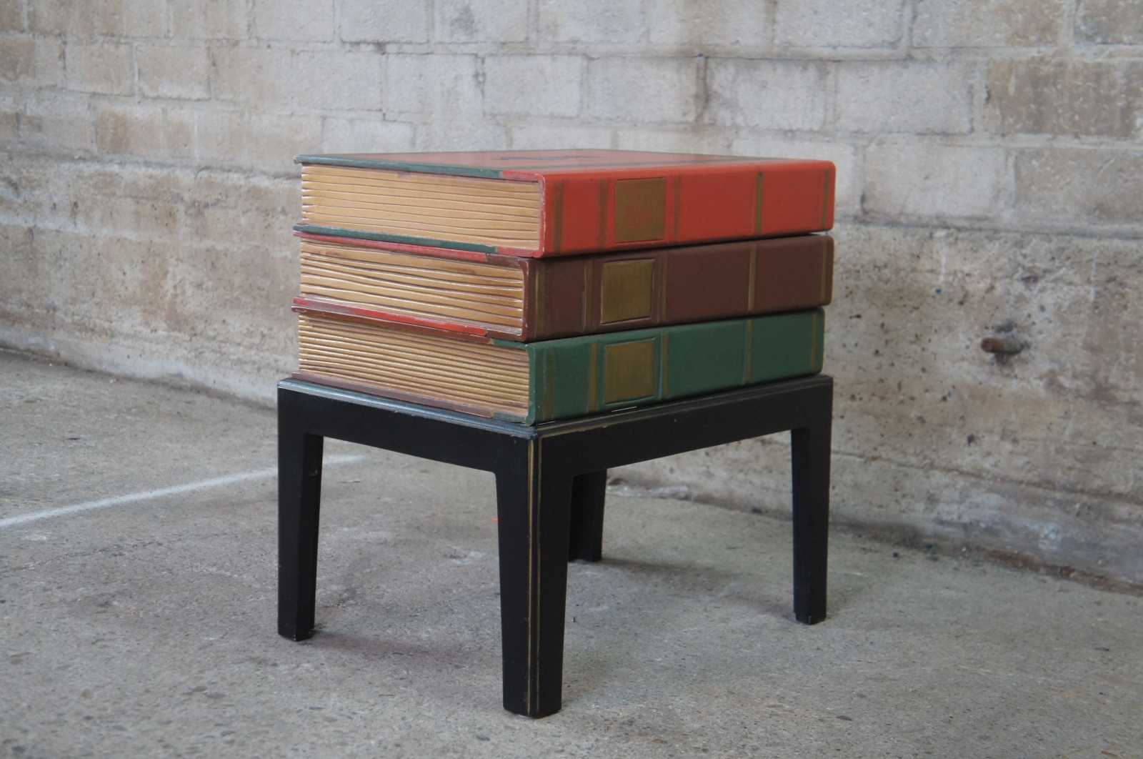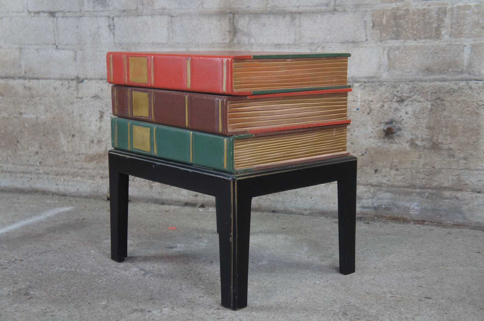 Vintage stacked book table. Features a trio of faux leather books with gold pages and black base. The top book has a neoclassical style urn motif.