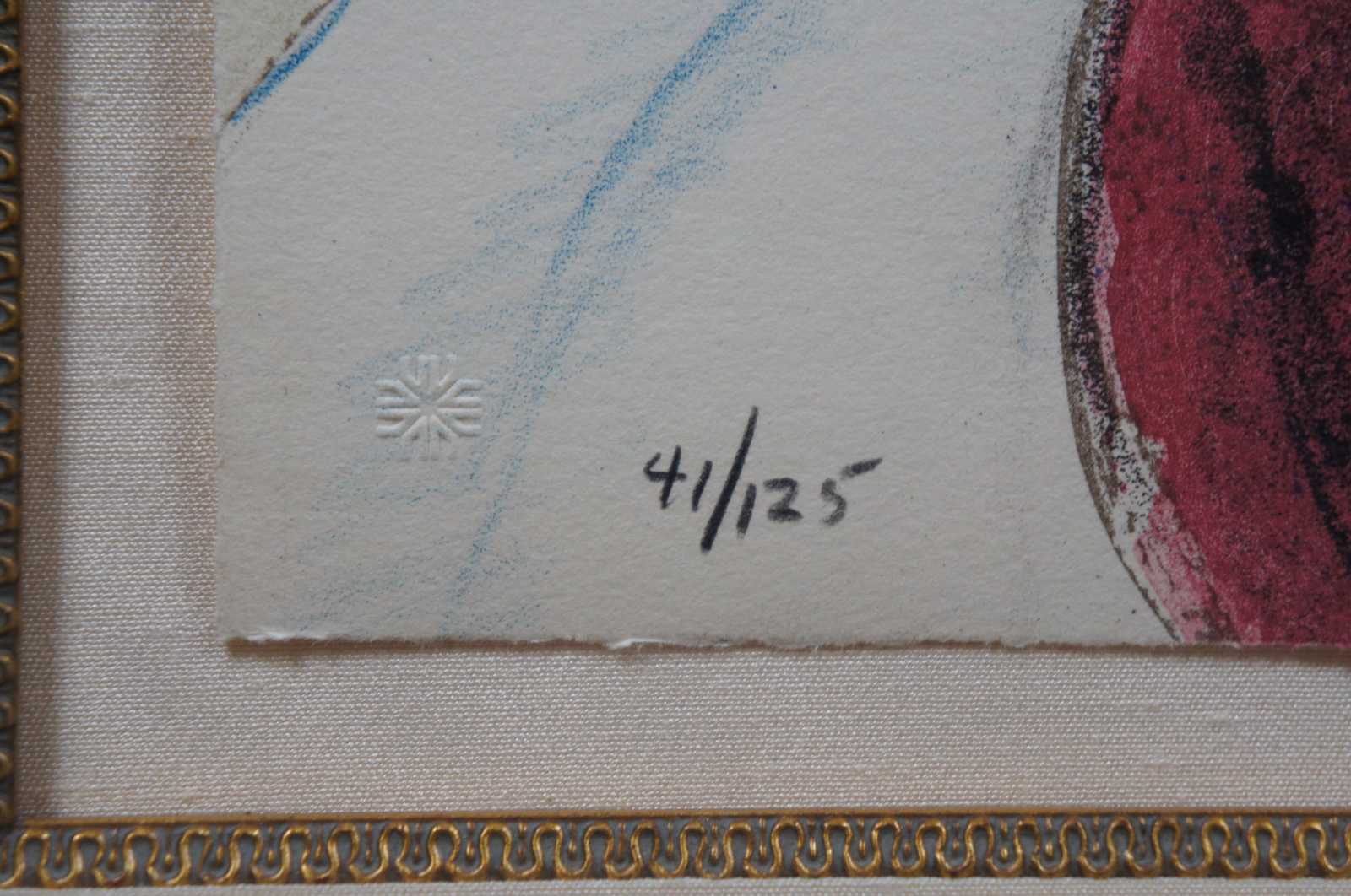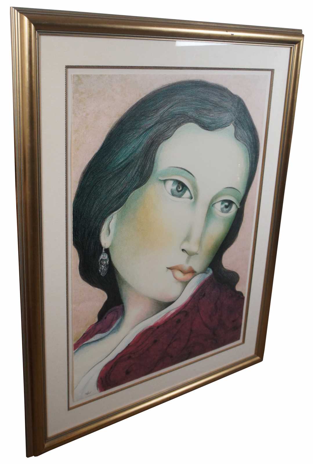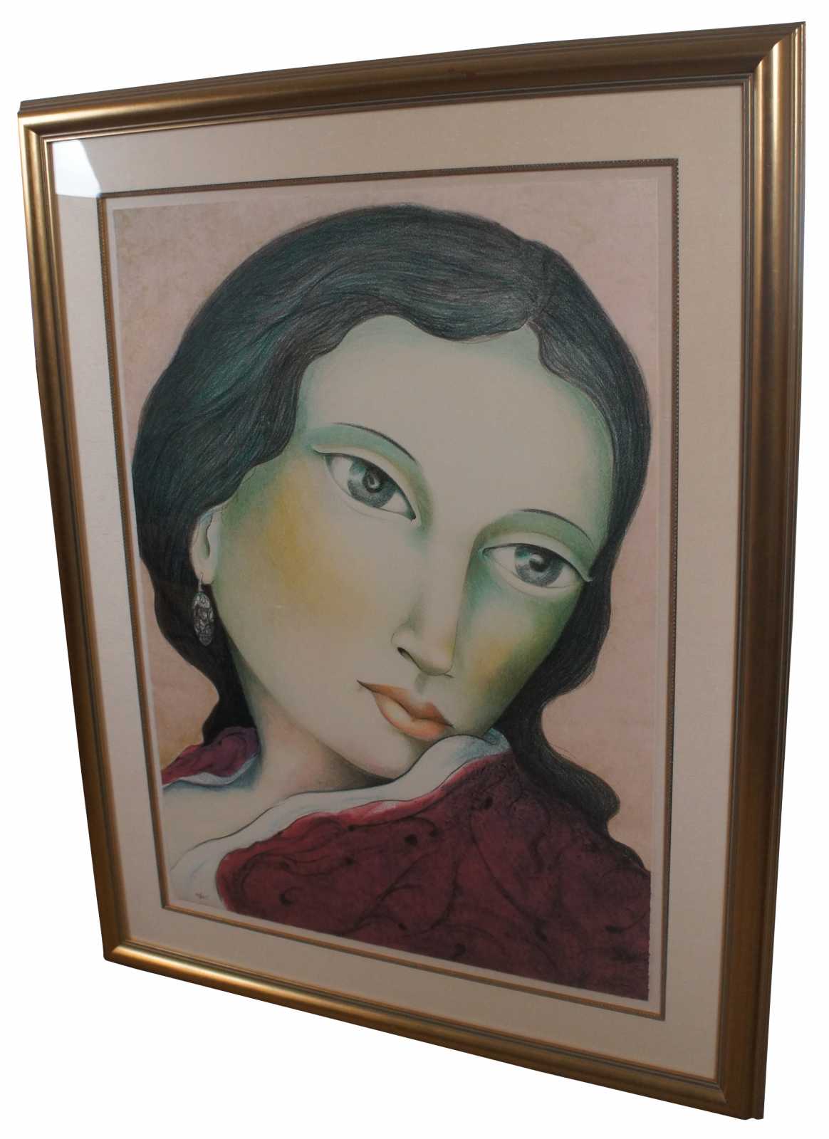 Large portrait of a woman in burgundy lithograph print titled “Dominique” by Miguel Martinez, signed and numbered 41/125. “The youngest son of Hispanic parents, Miguel Martinez was born in New Mexico in 1951.
