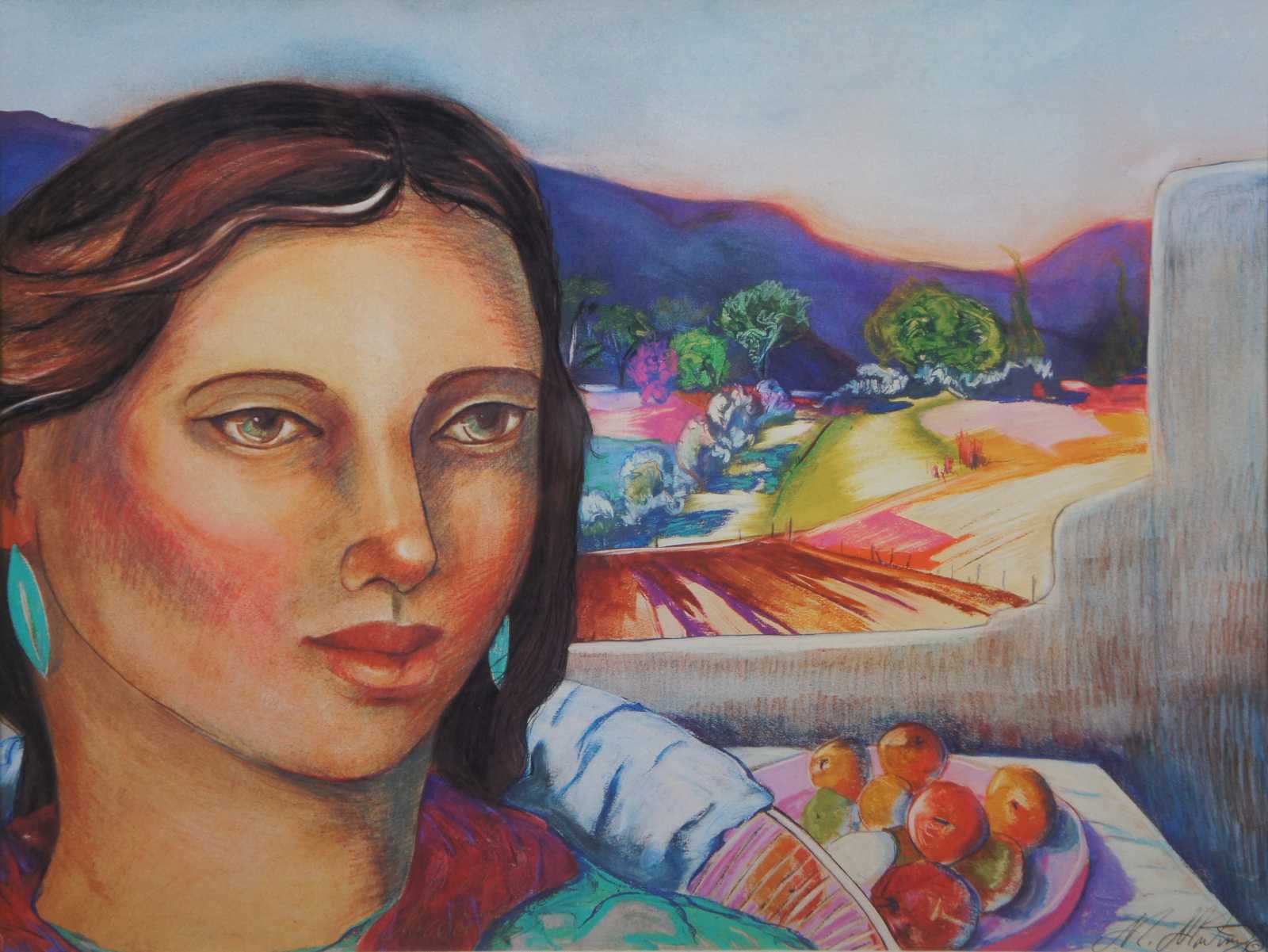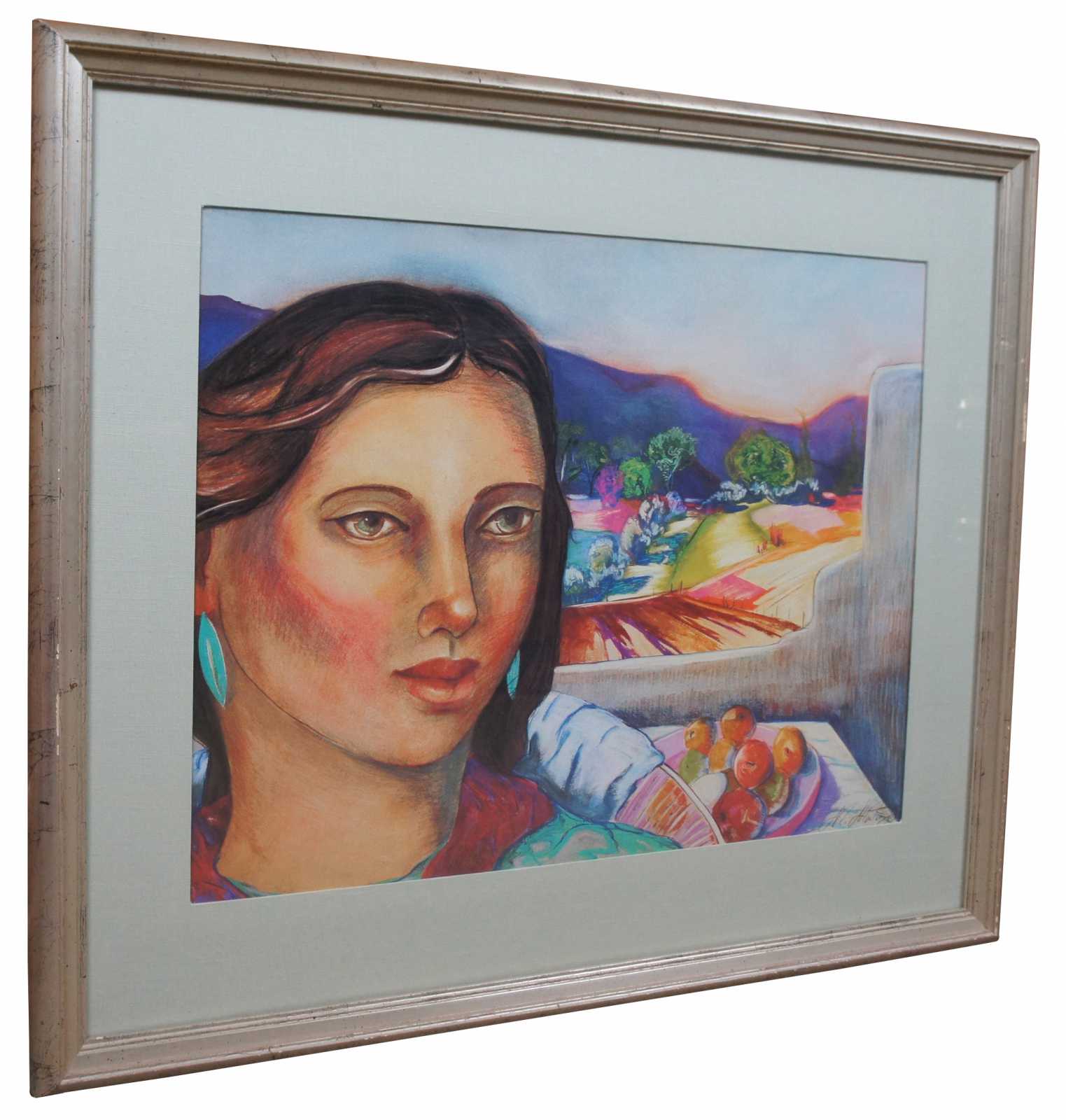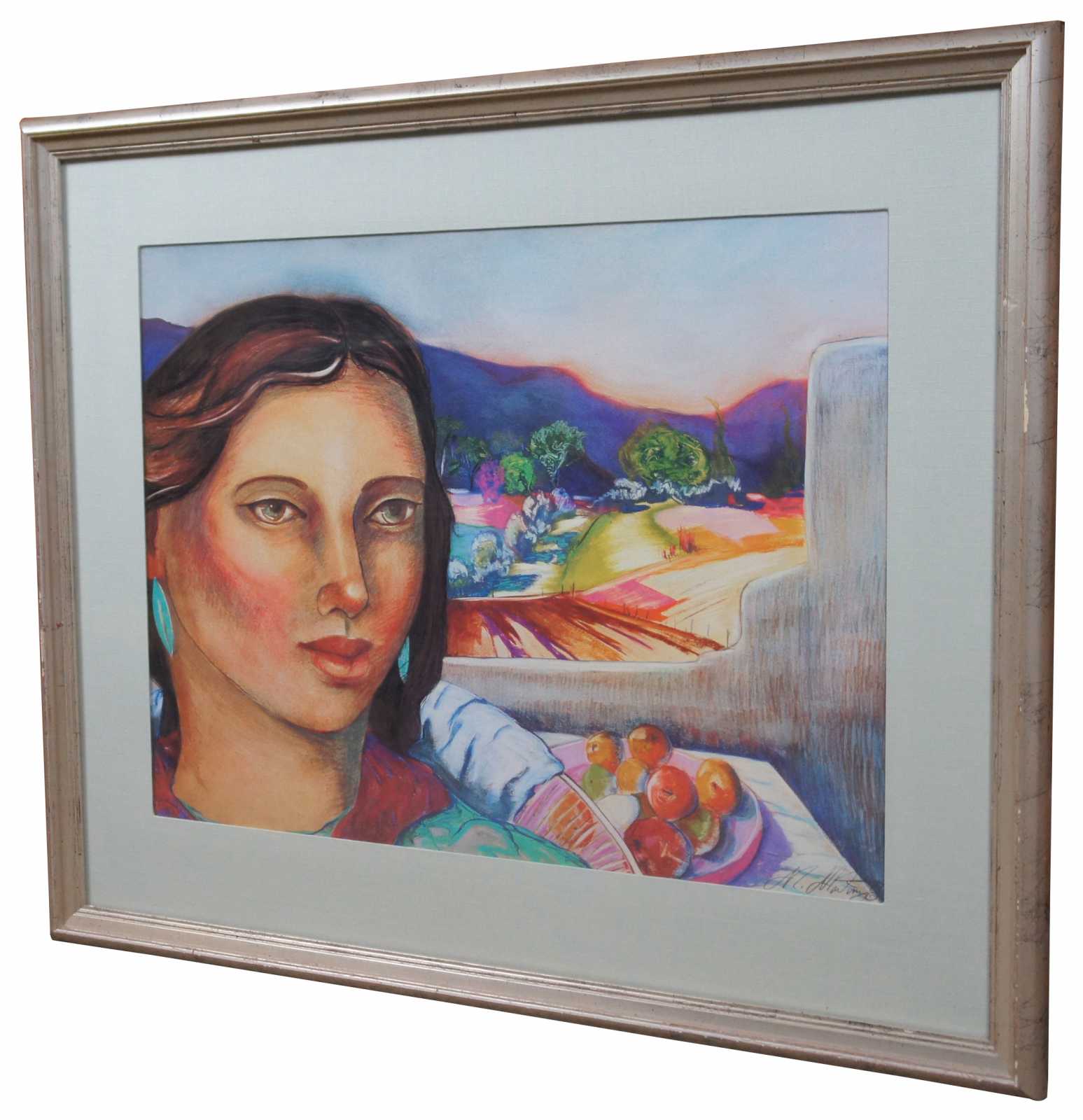 Vintage 1987 lithograph print signed by artist Miguel Martinez, showing a woman on a balcony with a southwestern landscape of fields and hills and fruit. “The youngest son of Hispanic parents, Miguel Martinez was born in New Mexico in 1951.