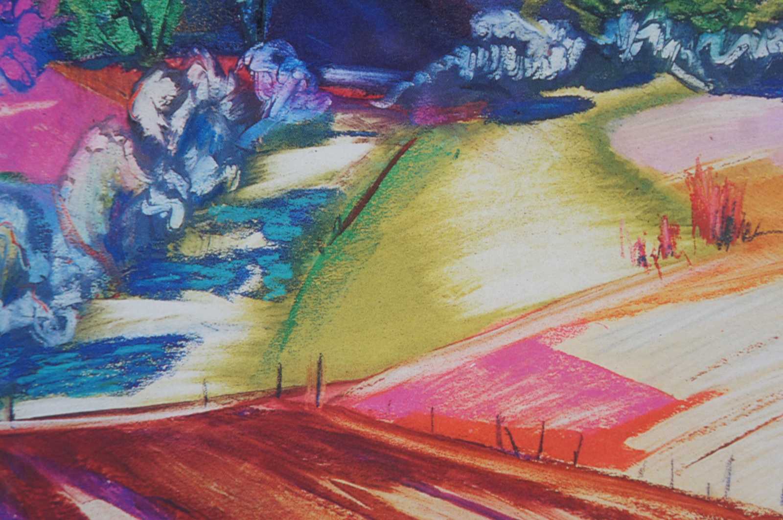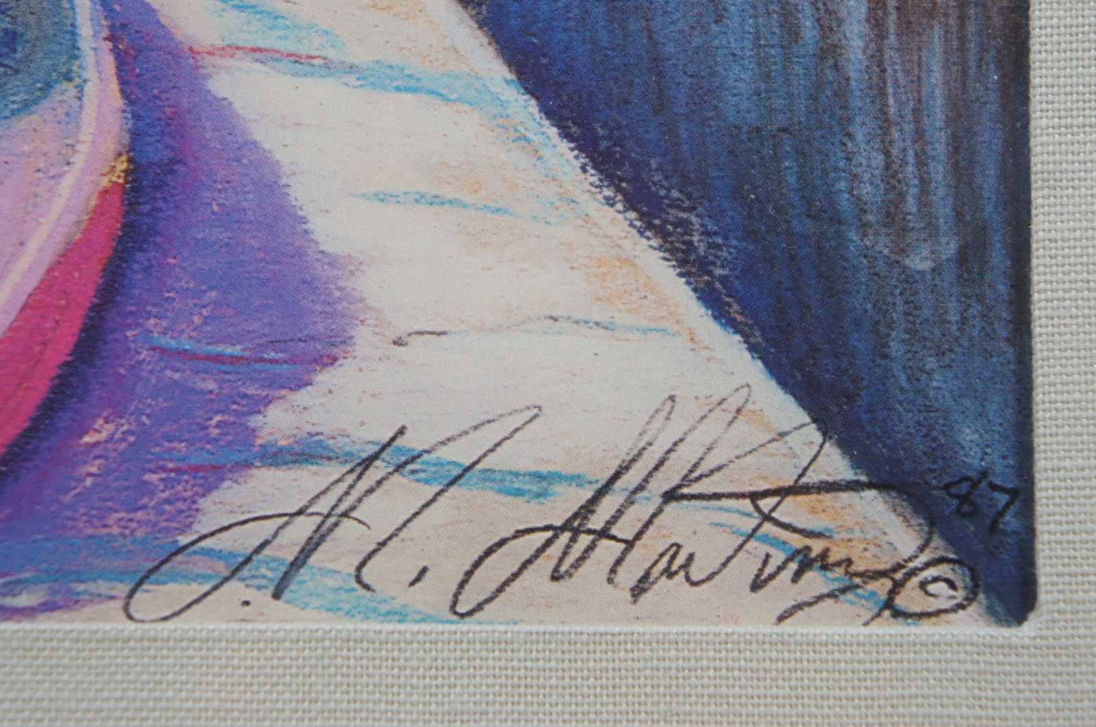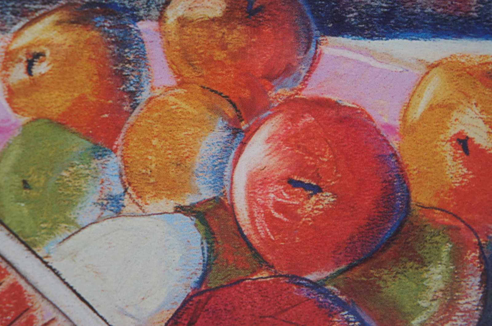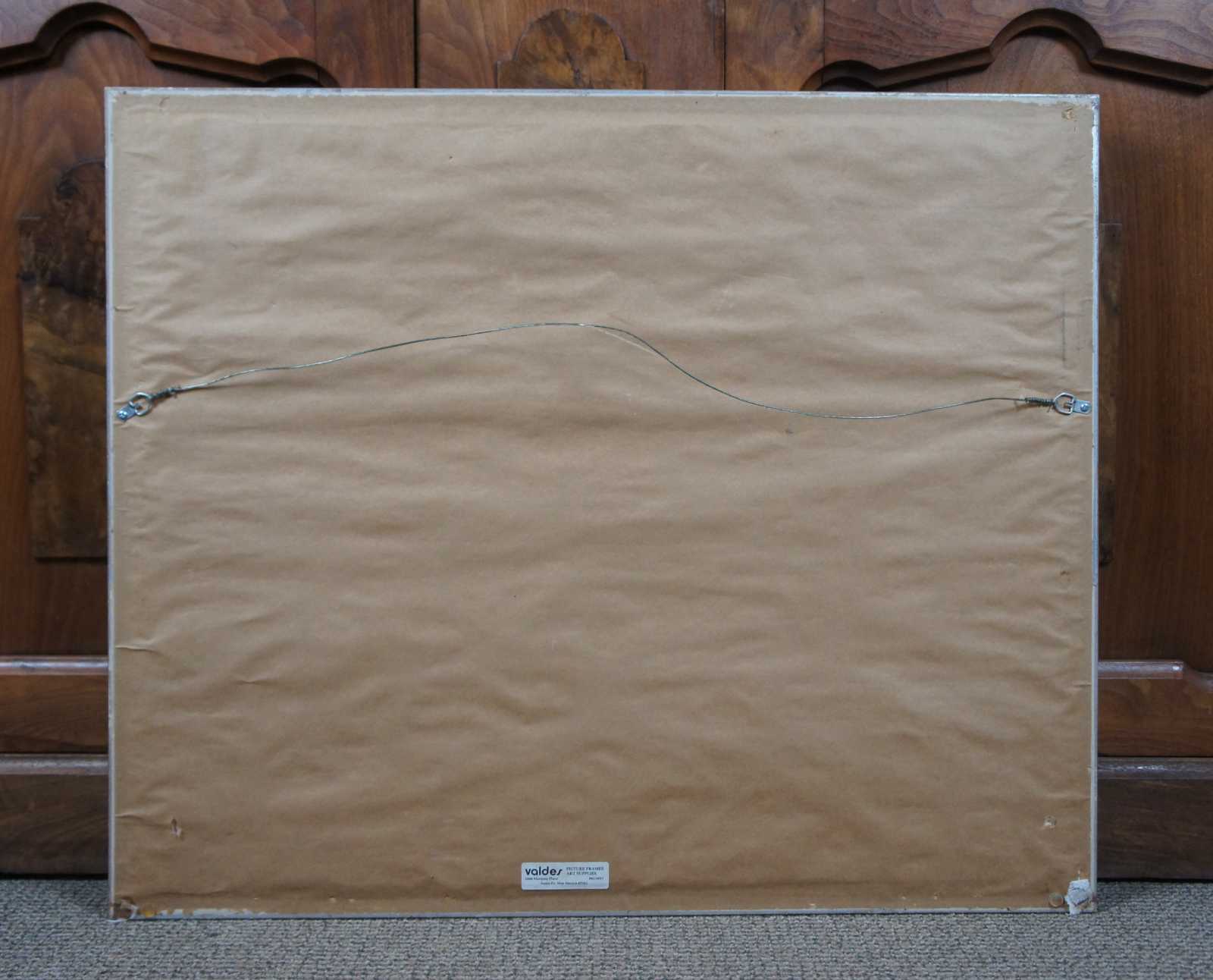 Vintage 1987 lithograph print signed by artist Miguel Martinez, showing a woman on a balcony with a southwestern landscape of fields and hills and fruit. “The youngest son of Hispanic parents, Miguel Martinez was born in New Mexico in 1951.