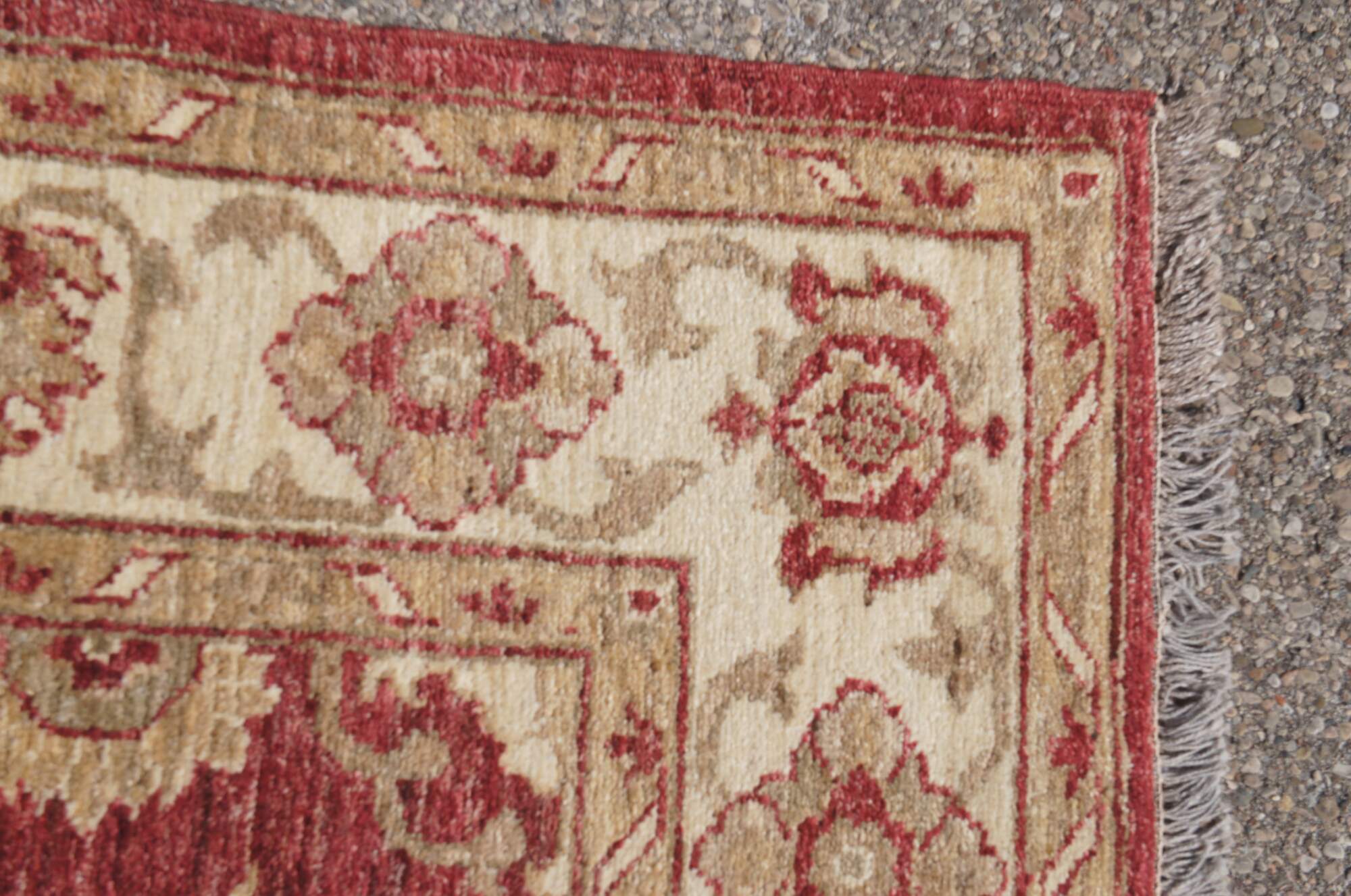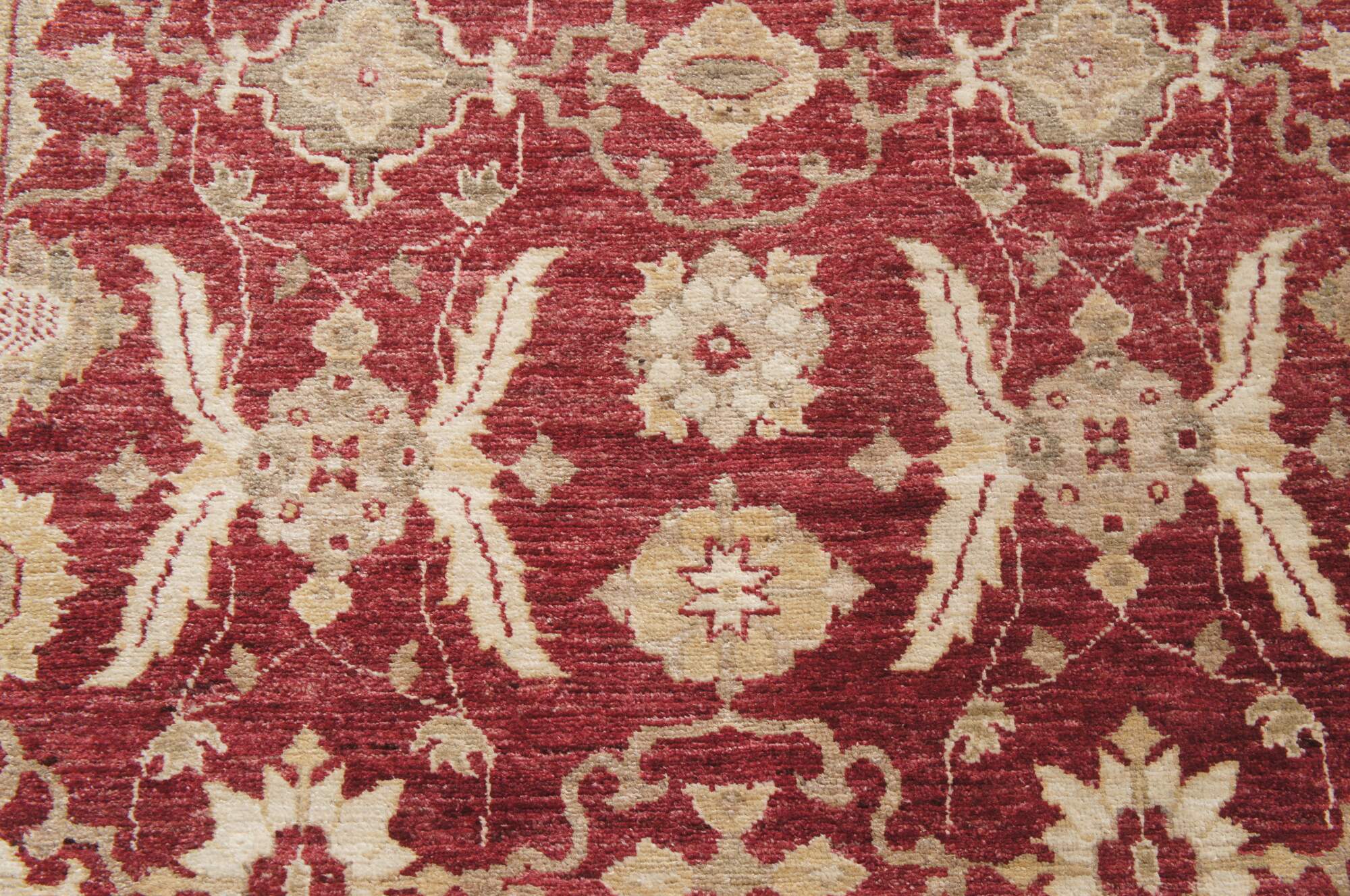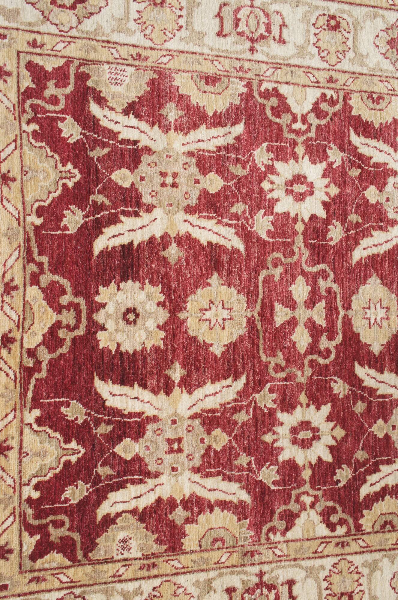 An exceptional floral area rug. Hand spun with natural dyes in Turkey. Beautifully designed with an eye catching geometric pattern. Features Reds and beiges