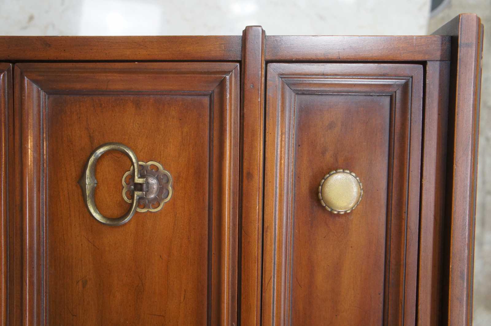 Circa 1960s Drexel Heritage Modavanti Mediterranean Collection Dresser, 14-153-30. Drawing inspiration from early Renaissance, Italian, classical and other European designs. A rectangular form made from fruitwood with nine dovetailed drawers featuring brass hardware. The dresser is supported by square tapered feet.