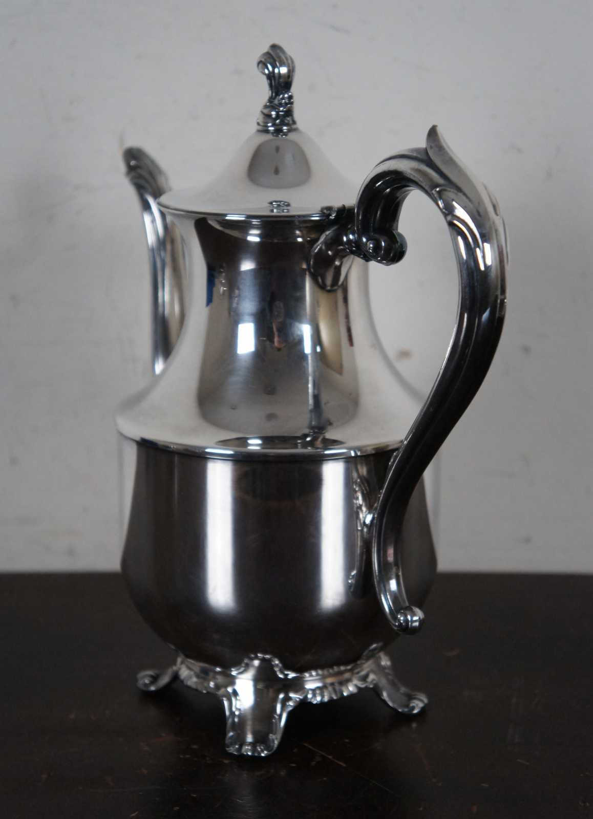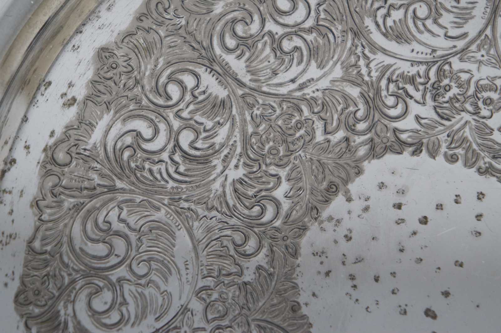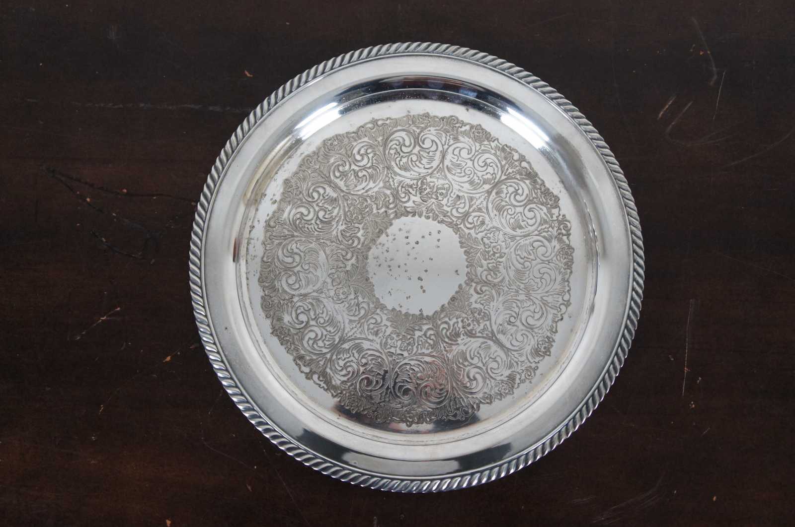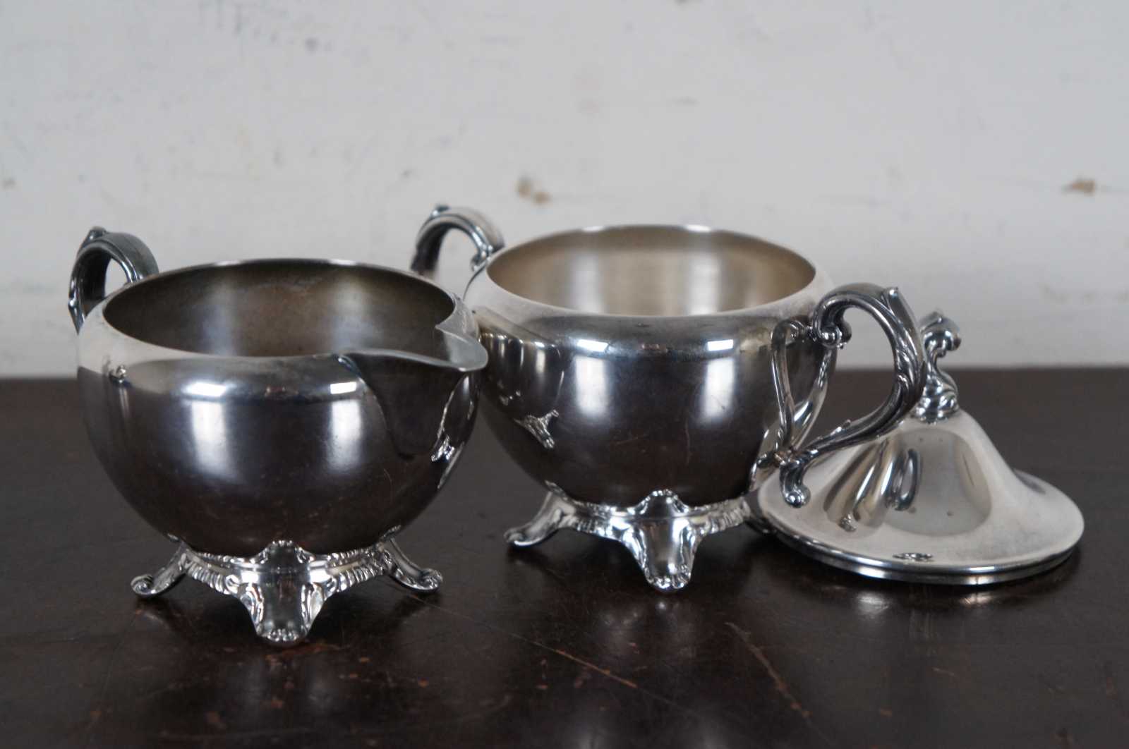 Vintage WMA Rogers silver plate tea set including a round tray, teapot, creamer and lidded sugar bowl.