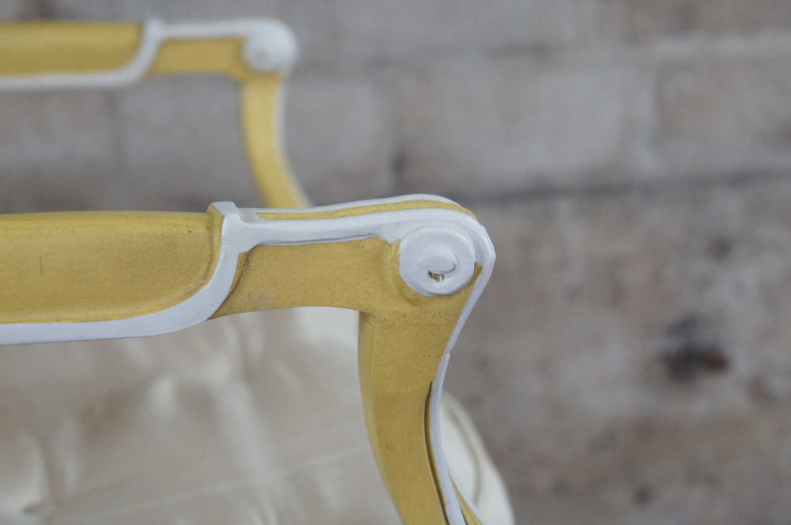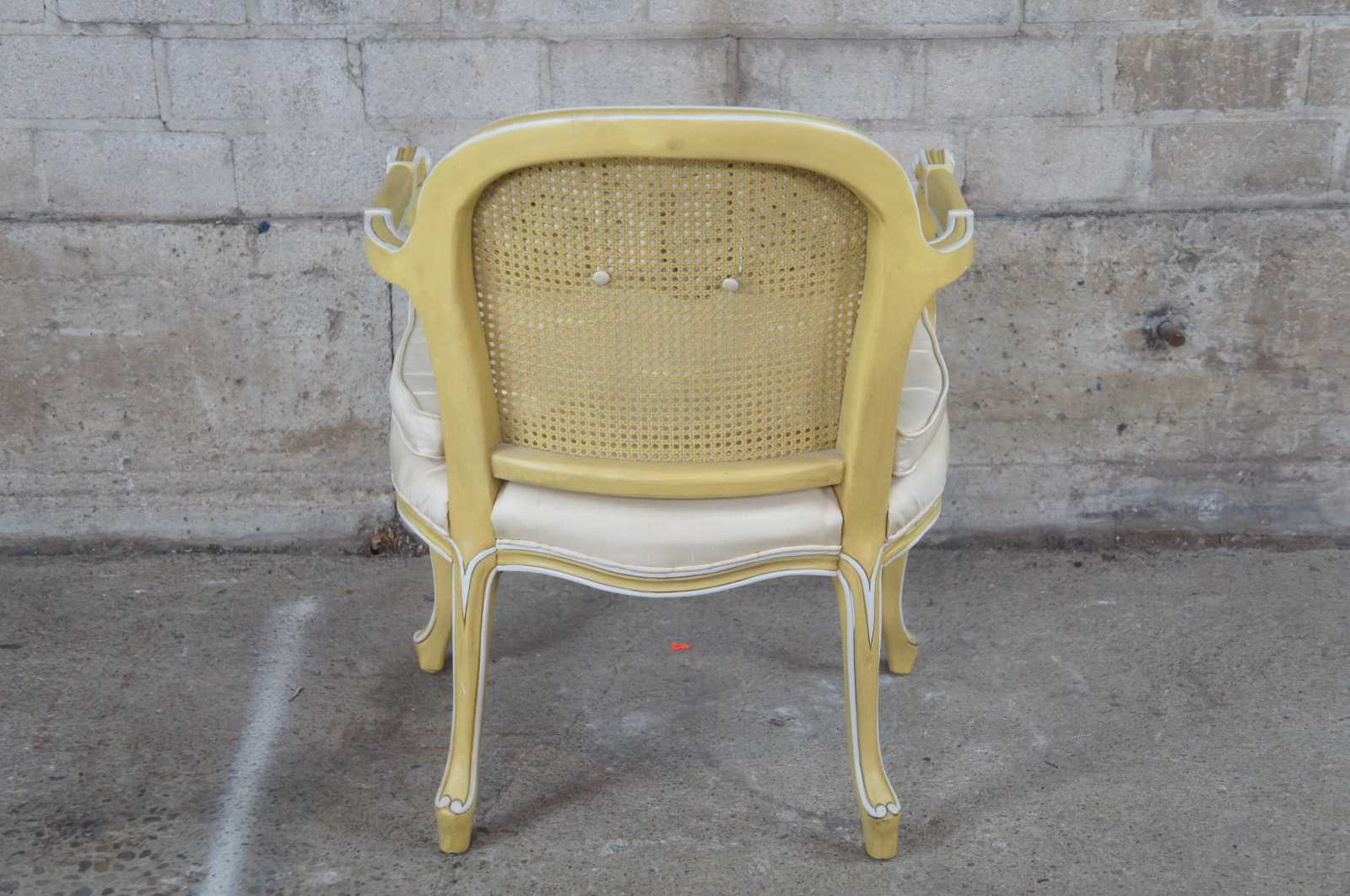 Mid Century 1966 Hibriten arm chair featuring French Provincial styling with caned drapery back, serpentine shape, and cabriole legs.