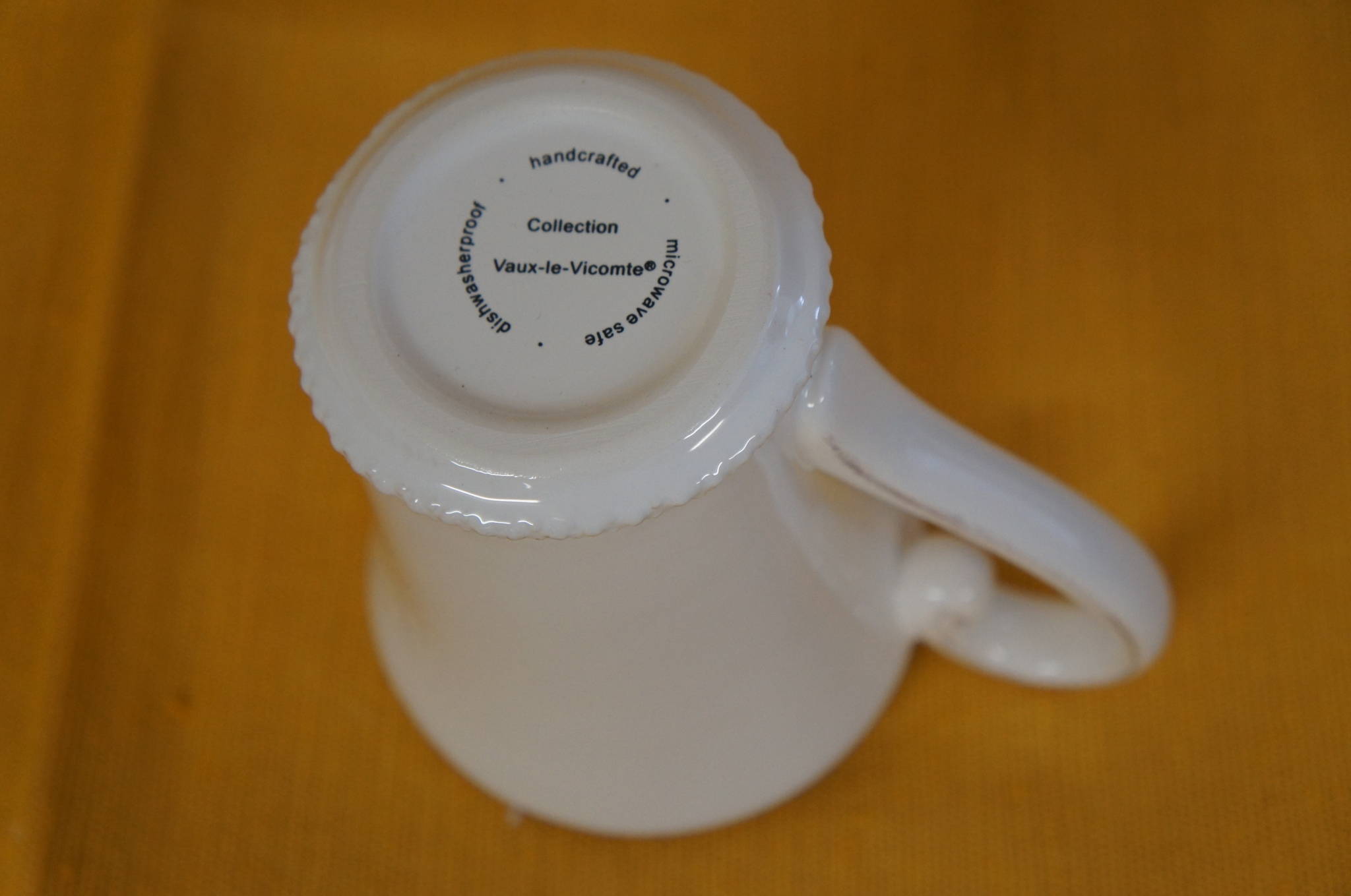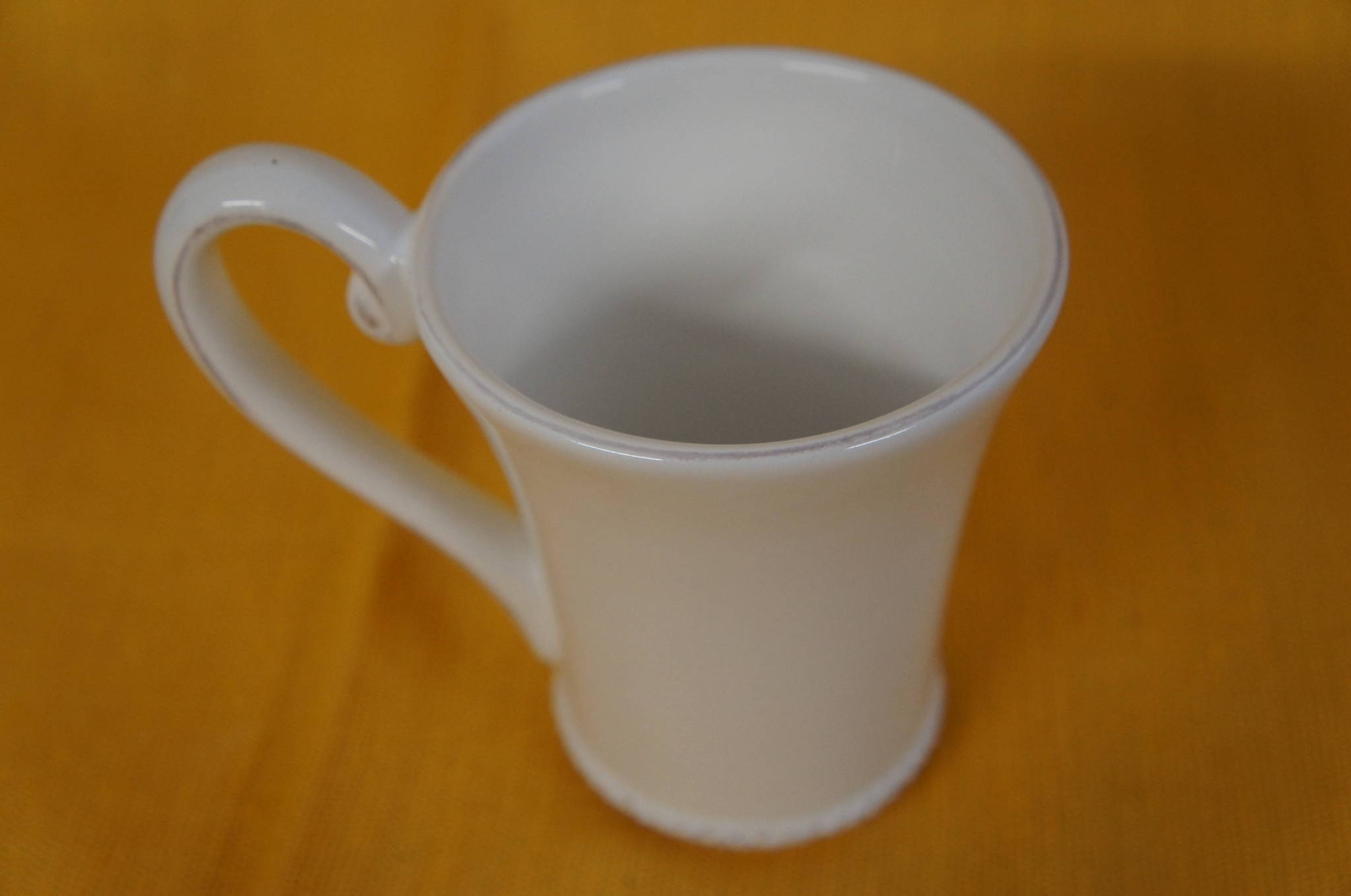 Set of 4. A pleasing handcrafted white mug with subtle decorativeembellishments. Dishwasher and microwave safe.