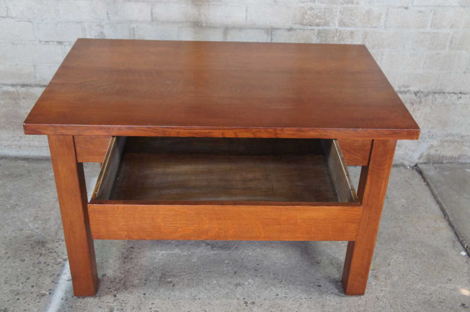Antique Imperial Funtiure library table or writing desk. Made of quartersawn oak featuring one large drawer, squared legs and trestle base. Marked on underside, Imperial Furniture, Grand Rapids, Michigan. circa 1939-1940s.
