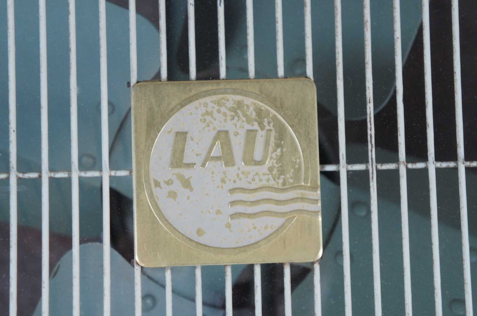Vintage Industrial Lau Box Fan Table. Square form with adjustable legs and a glass top