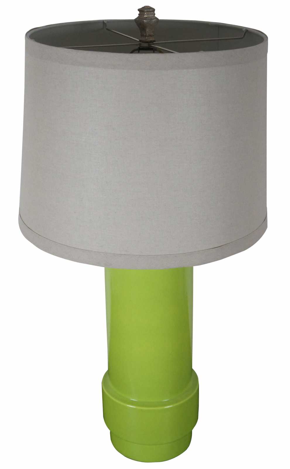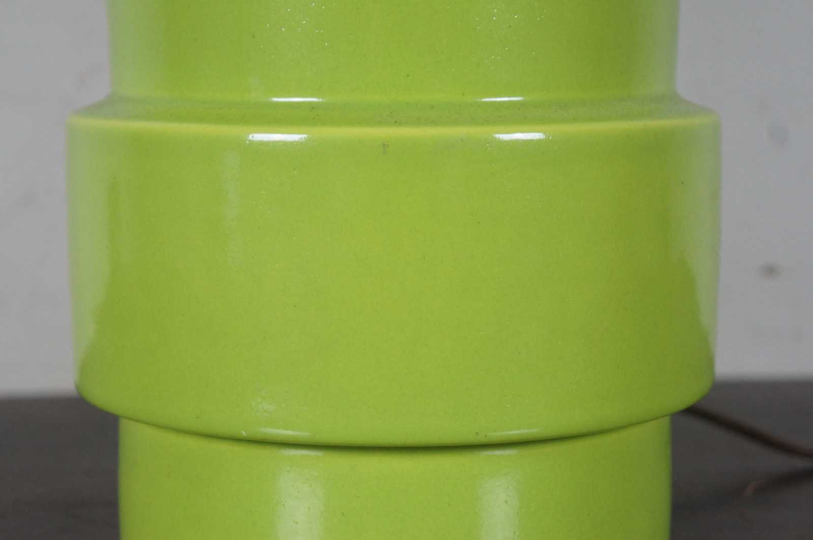 Mid century modern lime green porcelain table lamp with linen shade and resin finial.