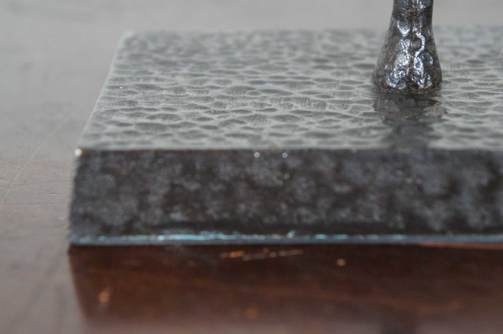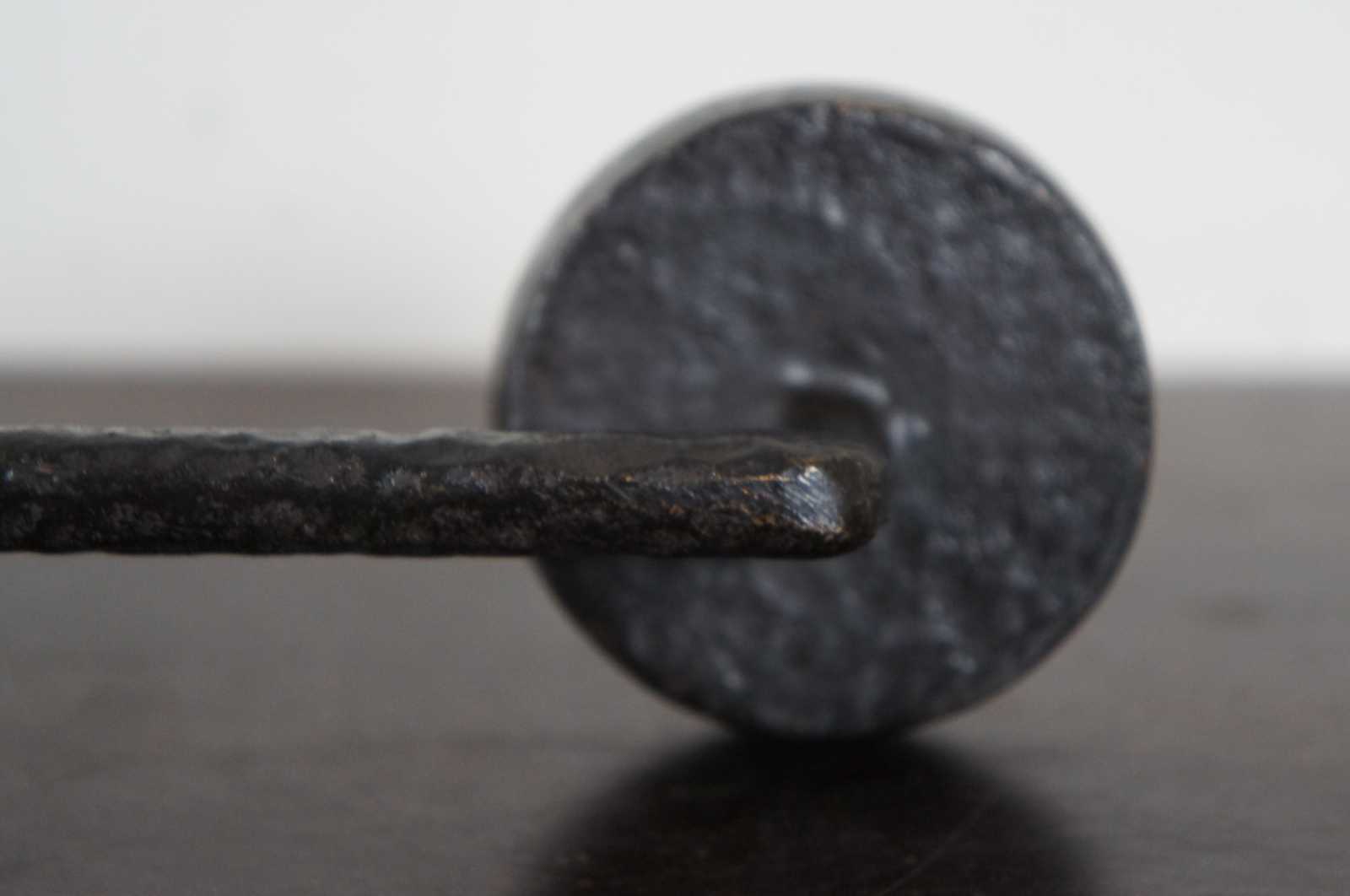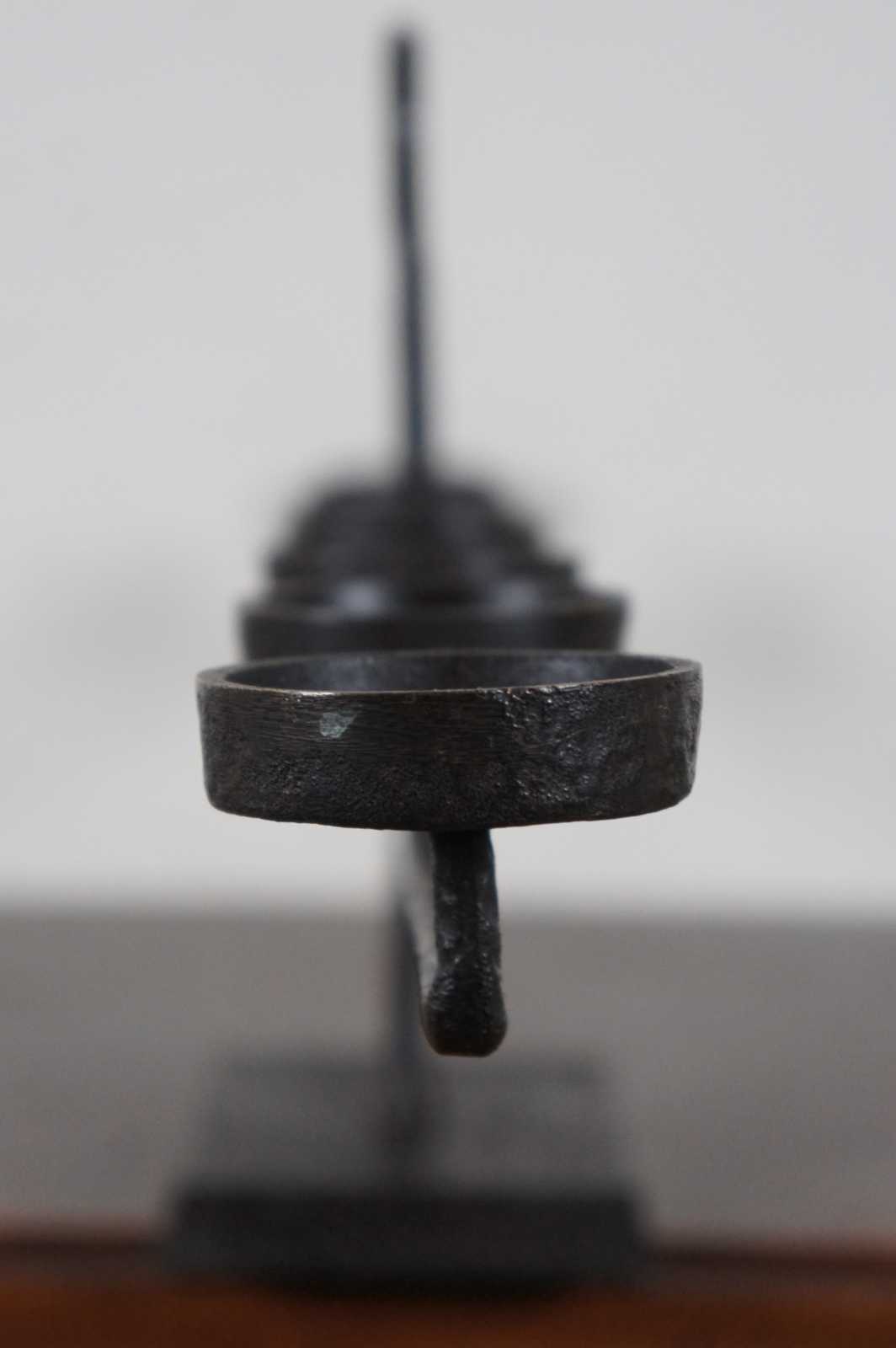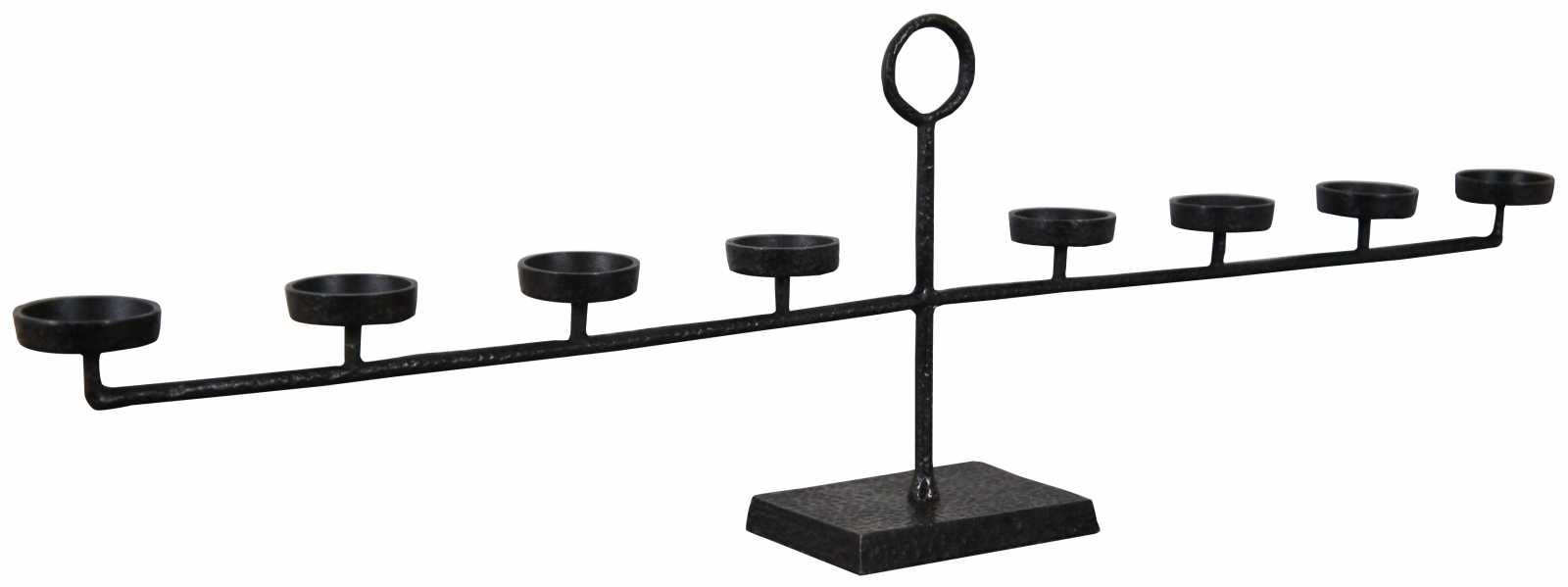 Pottery Barn rustic farmhouse hammered iron and footed fireplace candle holder with spots for eight votive or tealight sized candles.