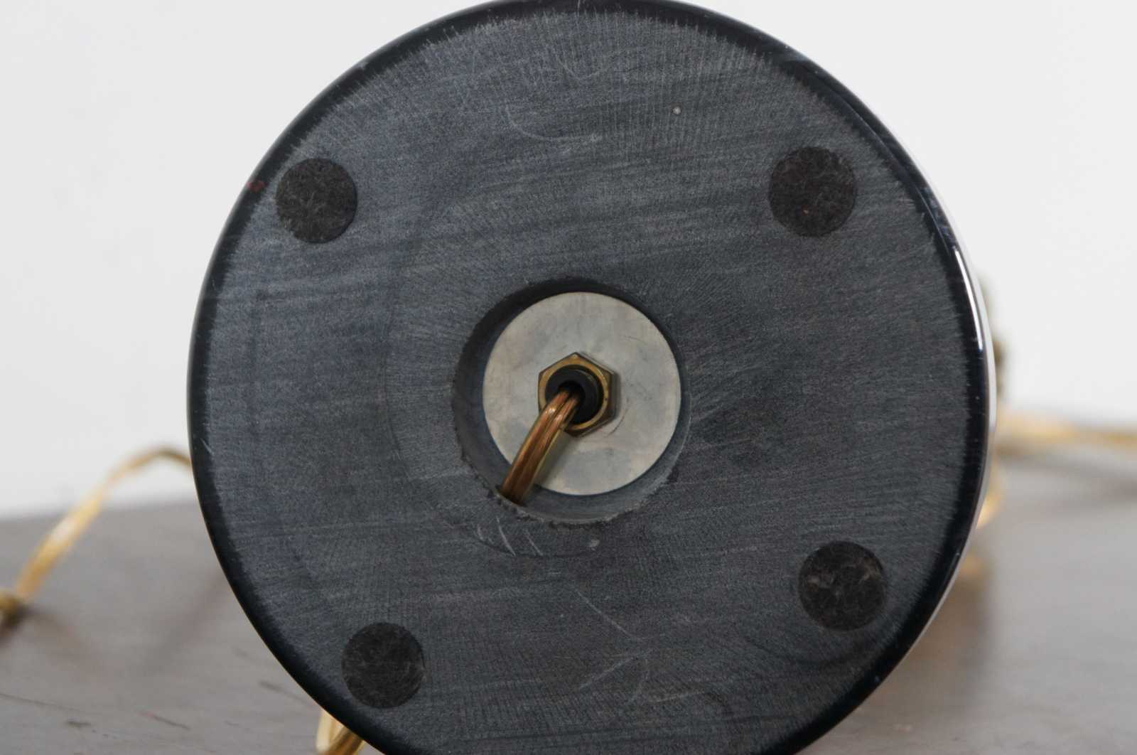 Pair of skinny brass candlestick shaped table or buffet lamps with black marble bases.
