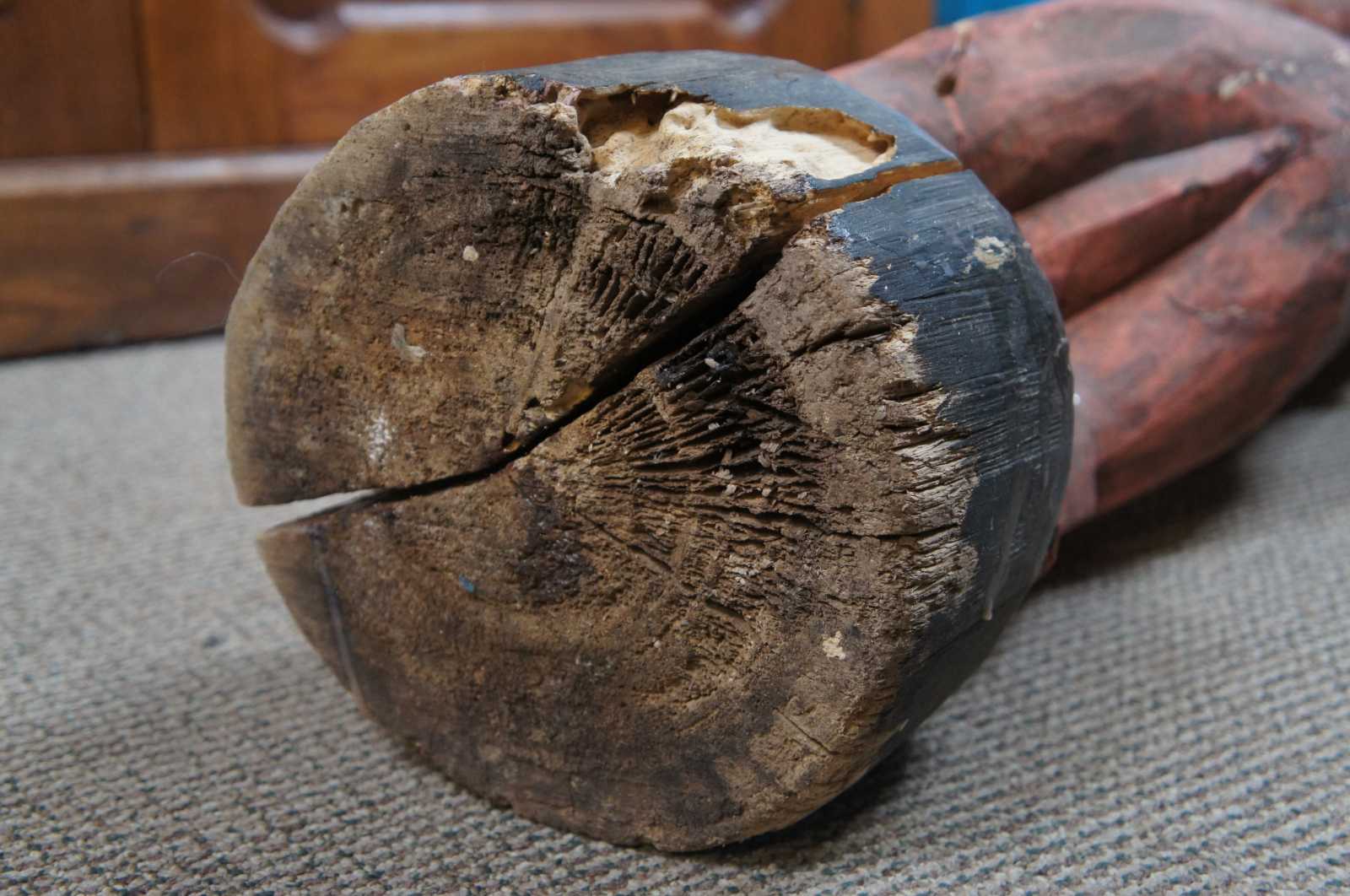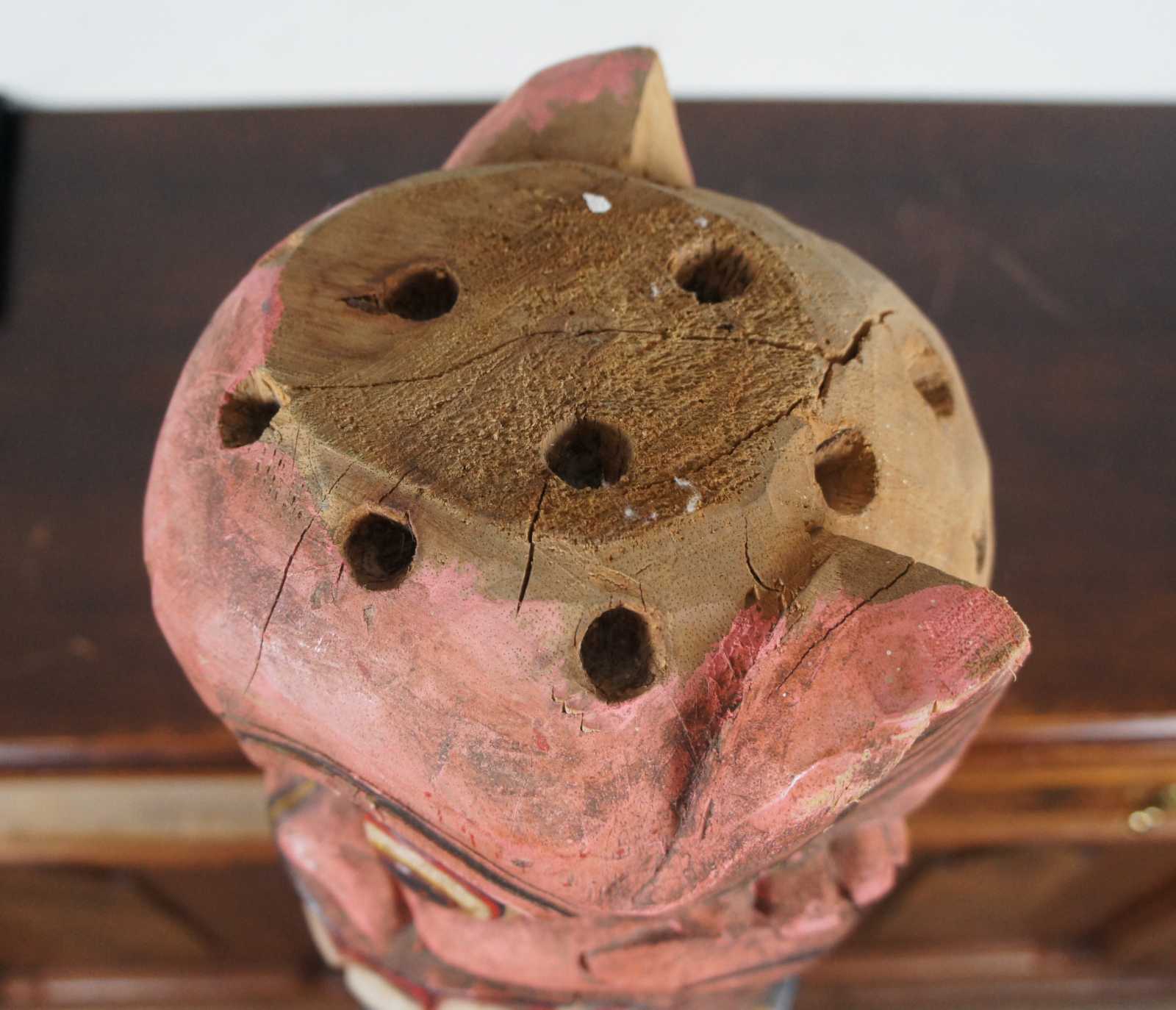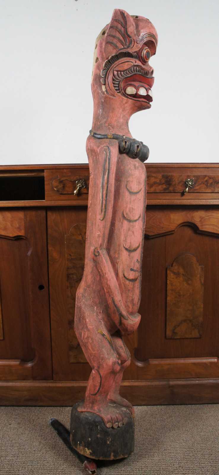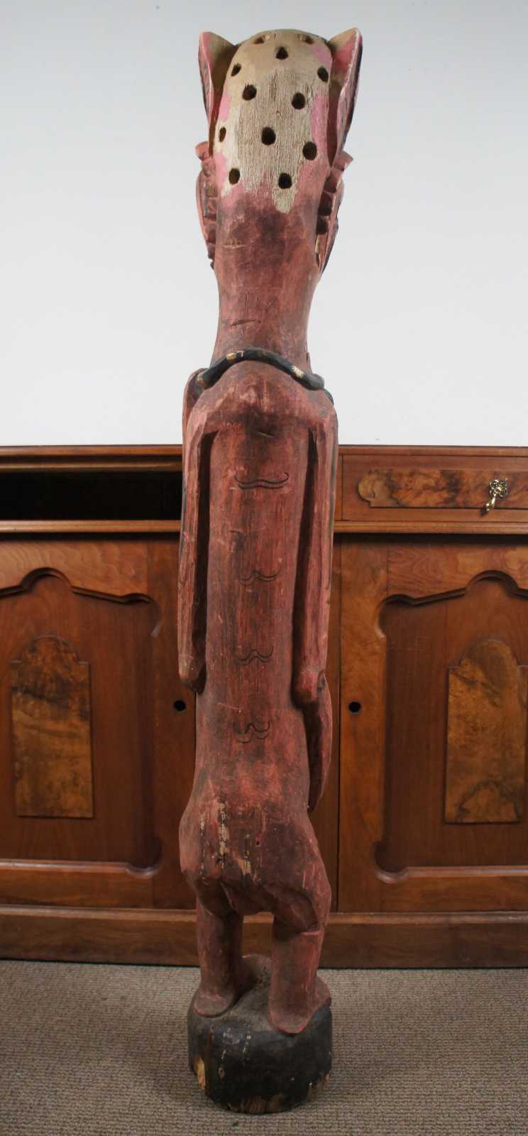 Vintage Indonesian hand carved wooden slit drum / tribal fertility figure painted in red and black with bells around it’s neck and open space in the torso to store the detachable phallus / penis.