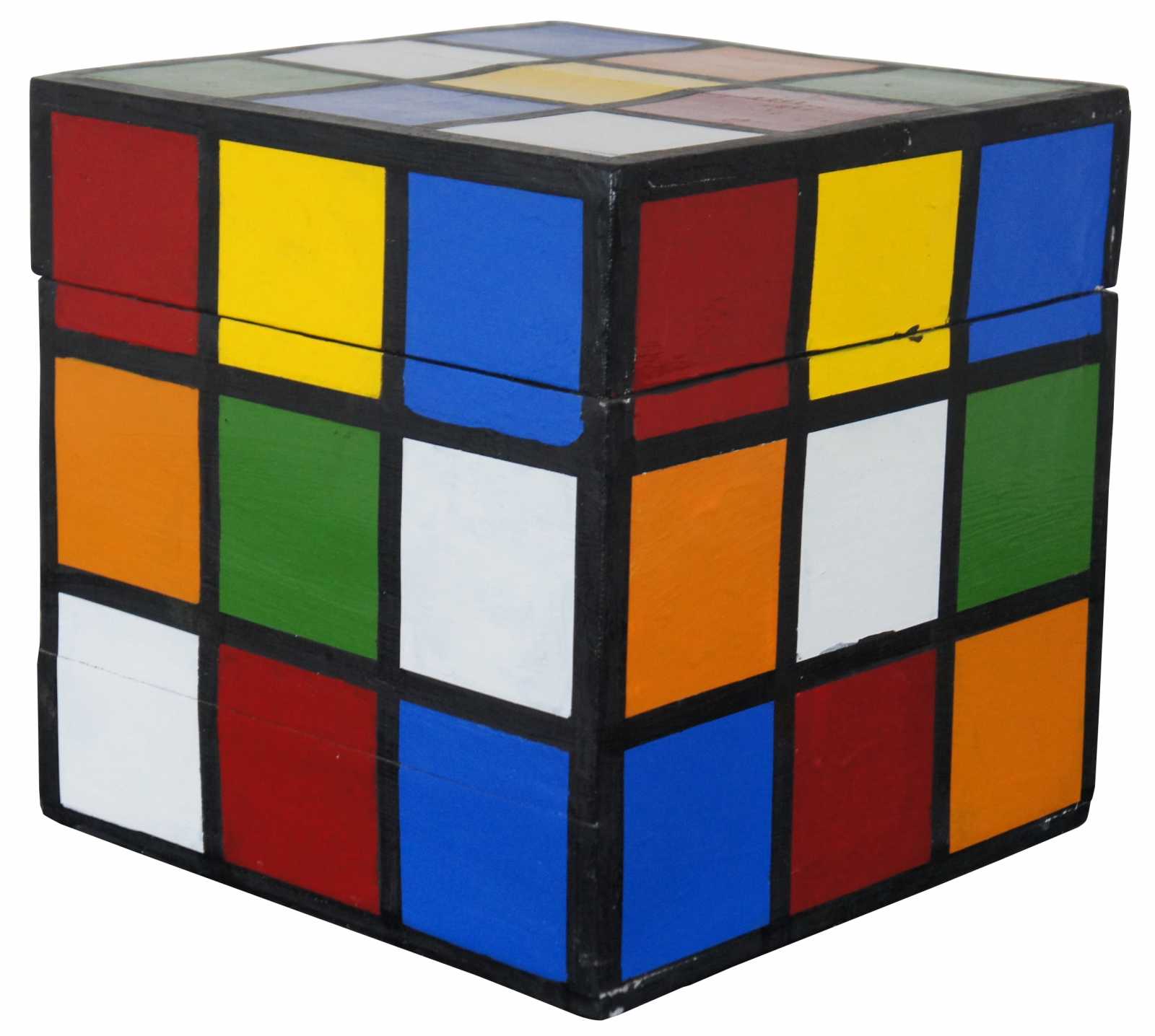 Vintage handmade square wooden box painted to resemble a Rubiks cube puzzle.