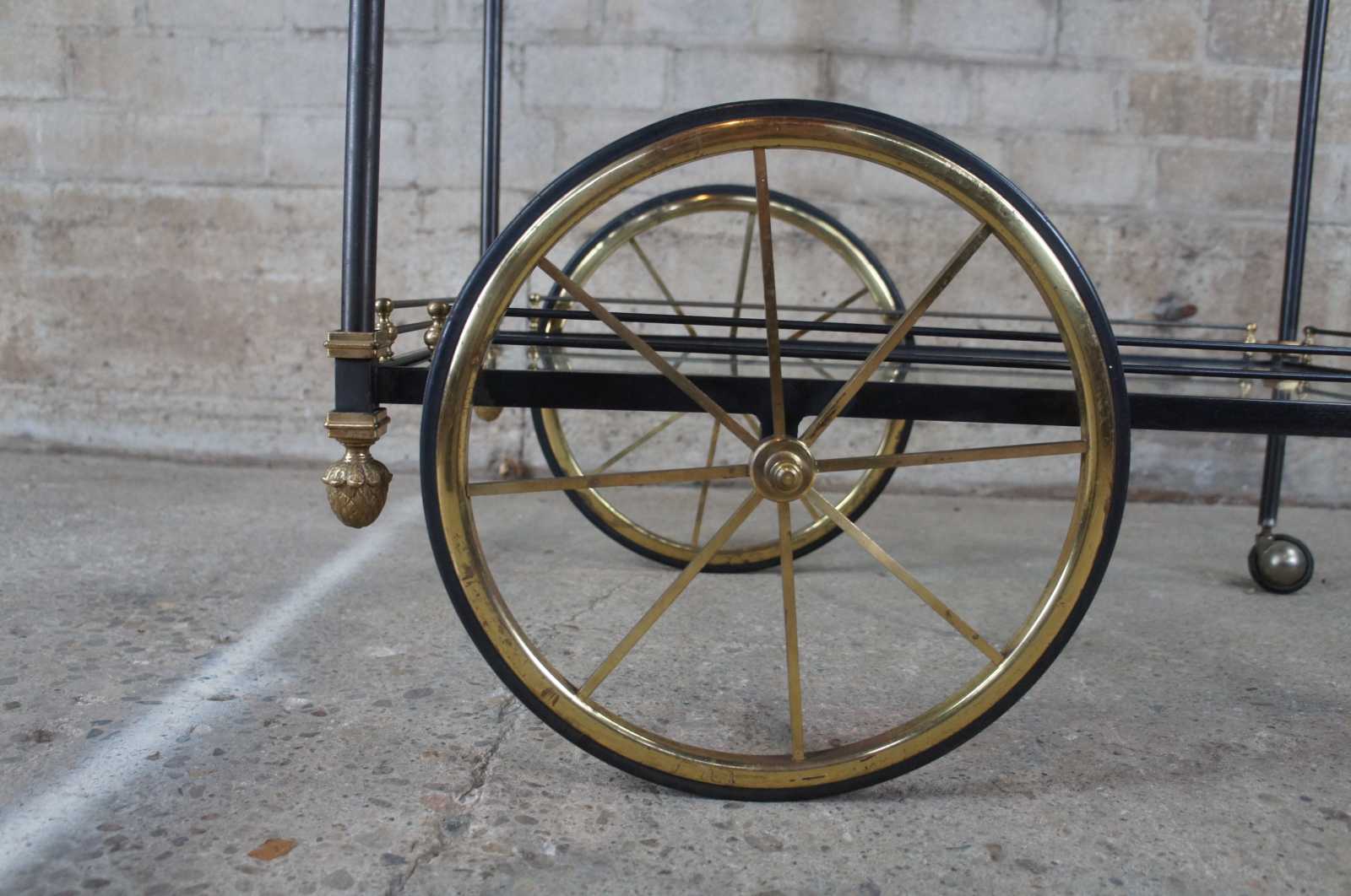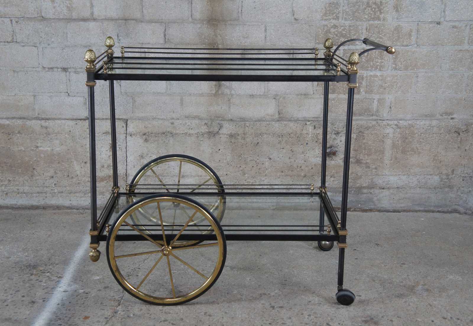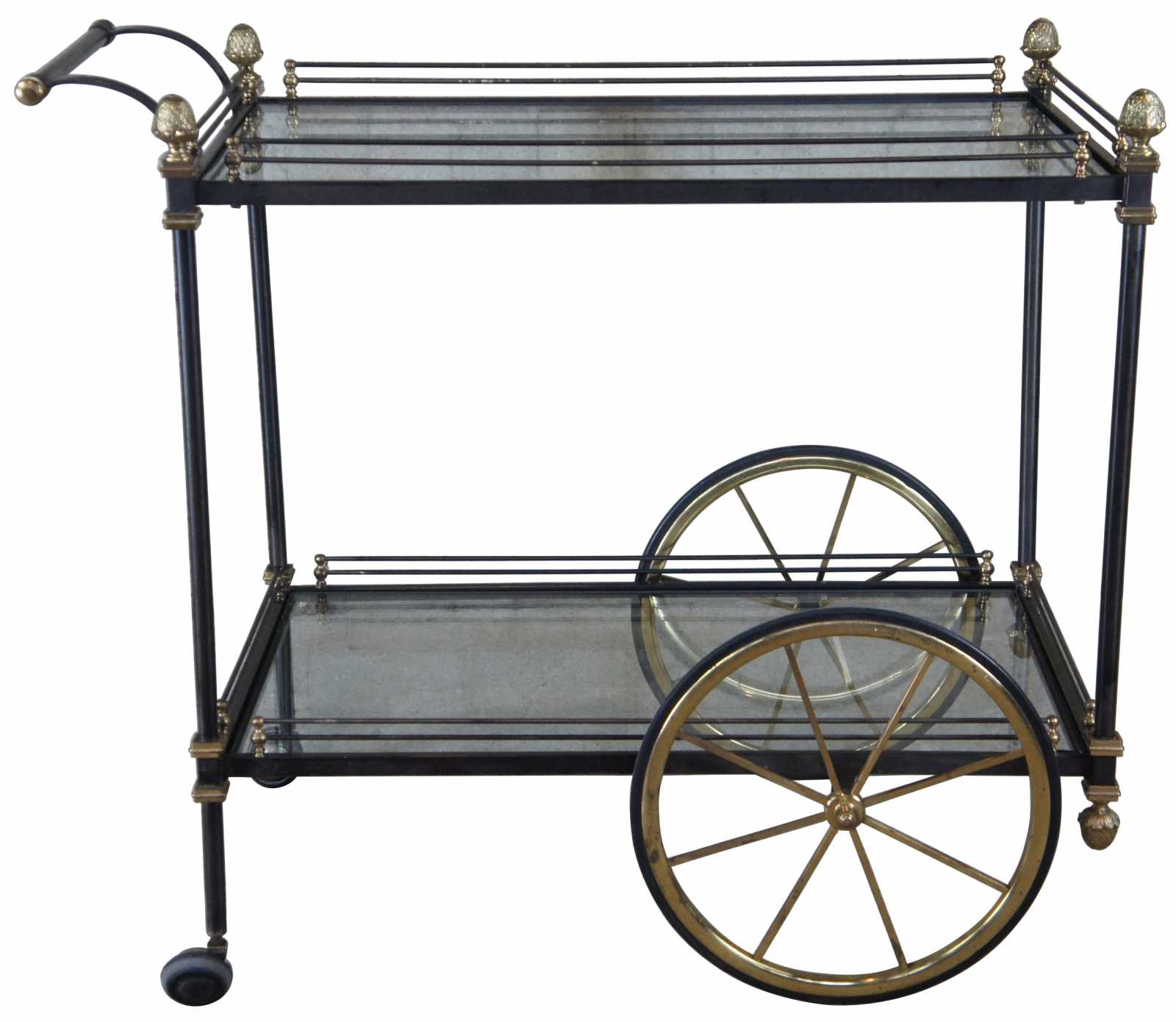 Mid 20th century Italian Neoclassical or Regency bar cart. Made of steel and glass featuring brass artichoke or "acorn / pineapple" finials and trim with large swivel castors. Maison Jenson Style