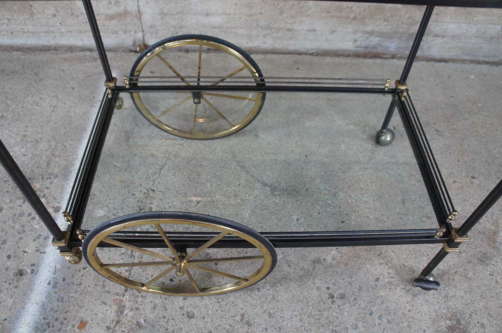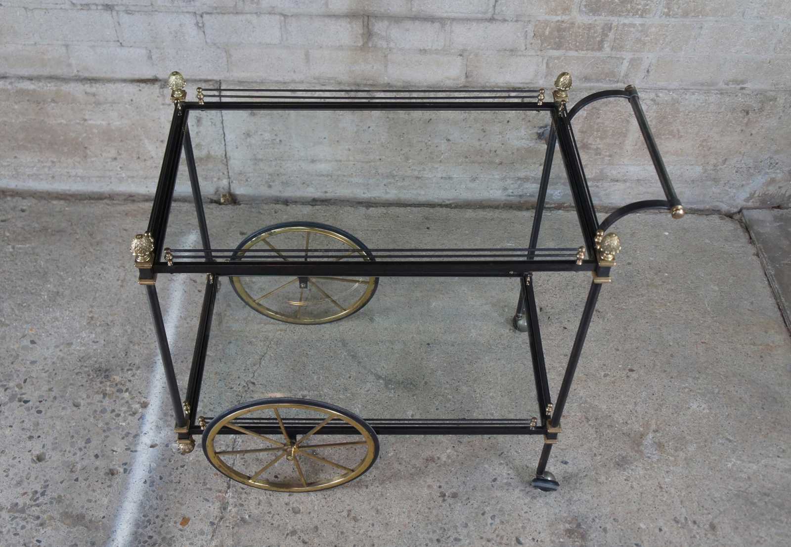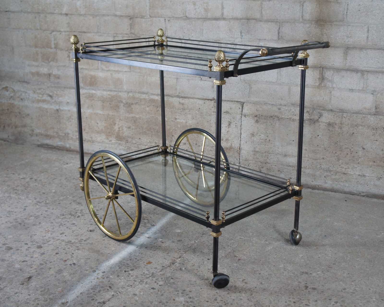 Mid 20th century Italian Neoclassical or Regency bar cart. Made of steel and glass featuring brass artichoke or "acorn / pineapple" finials and trim with large swivel castors. Maison Jenson Style