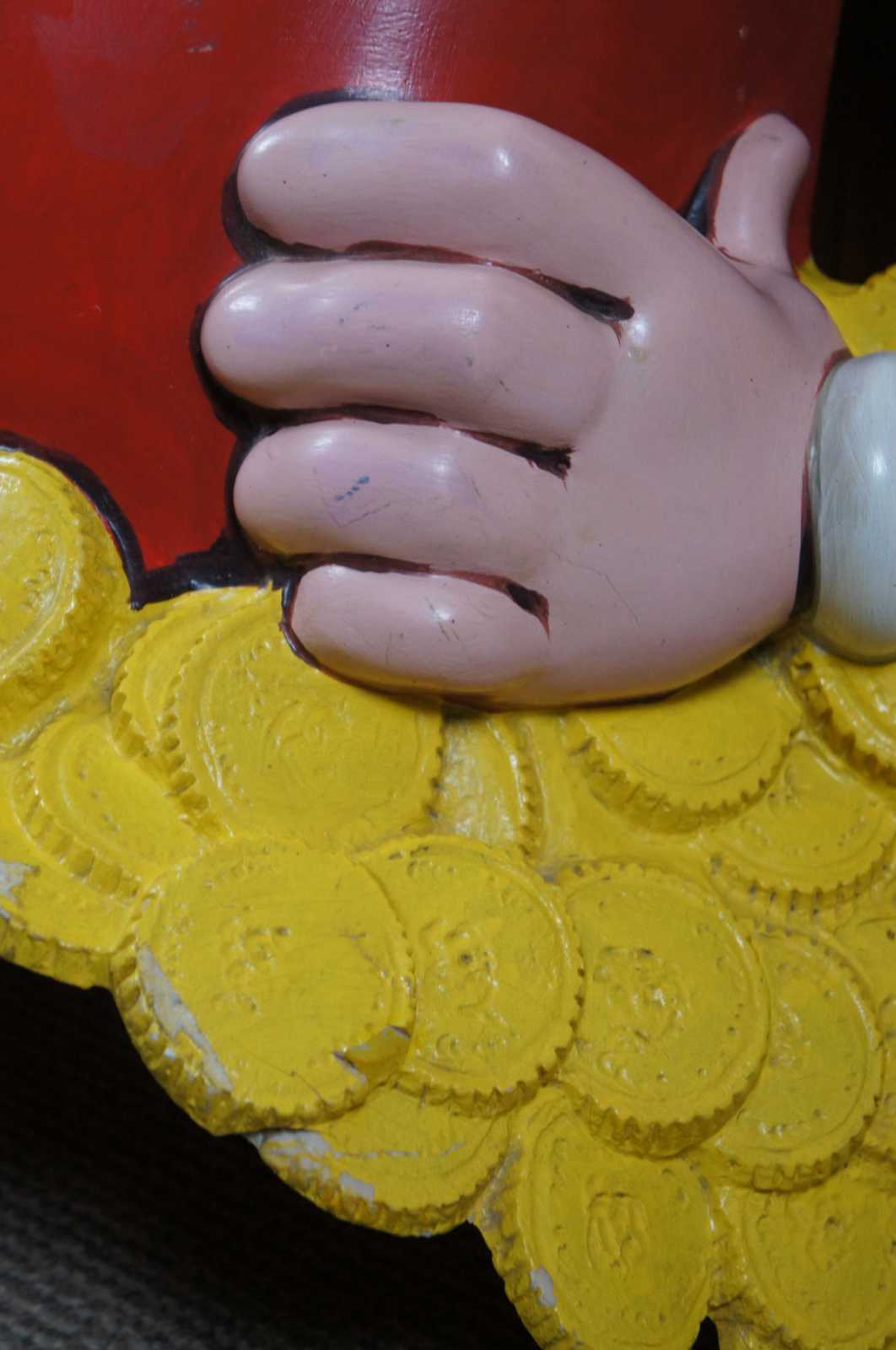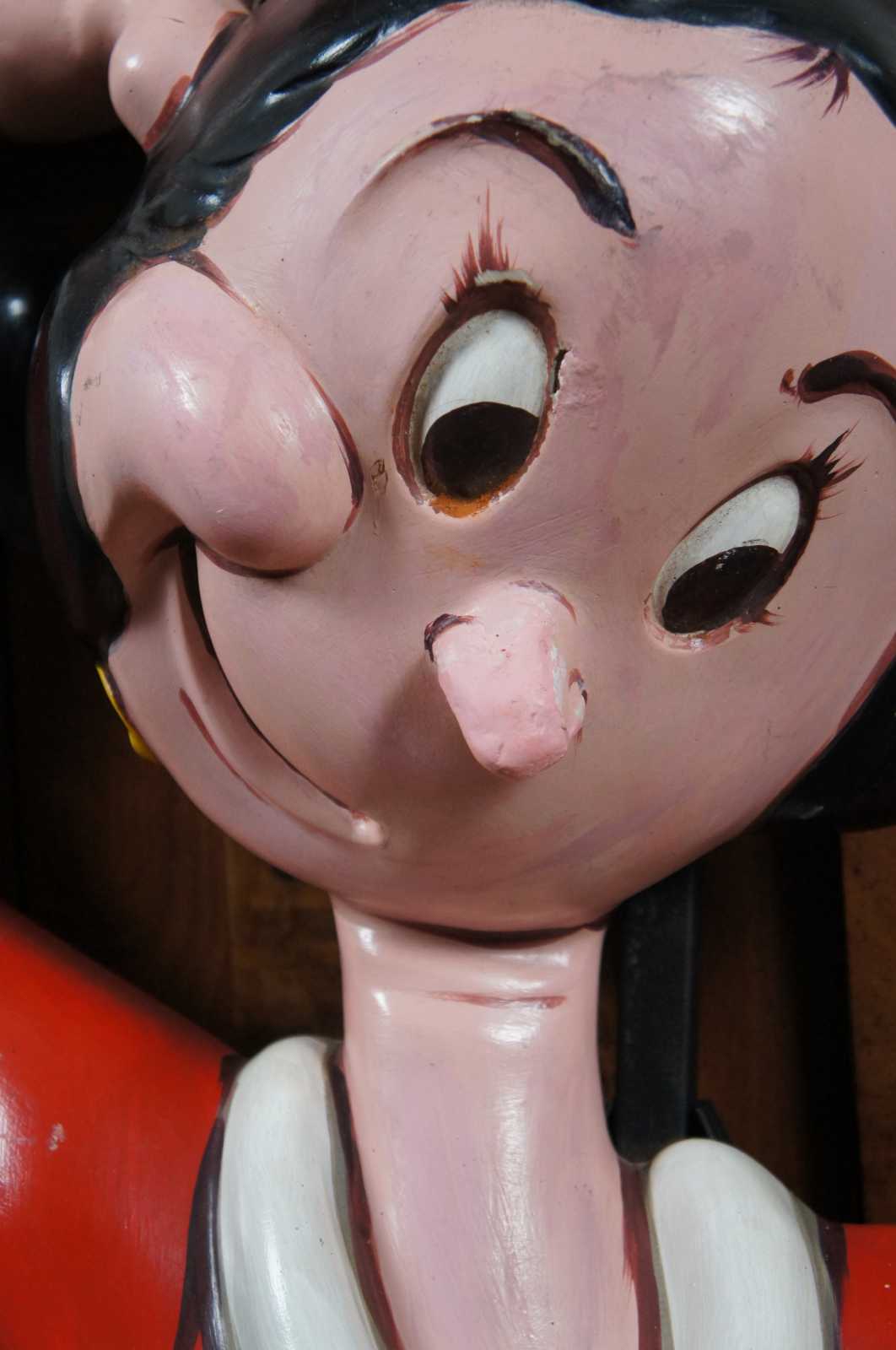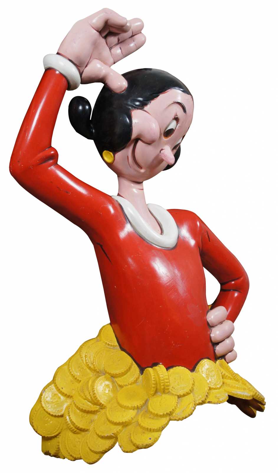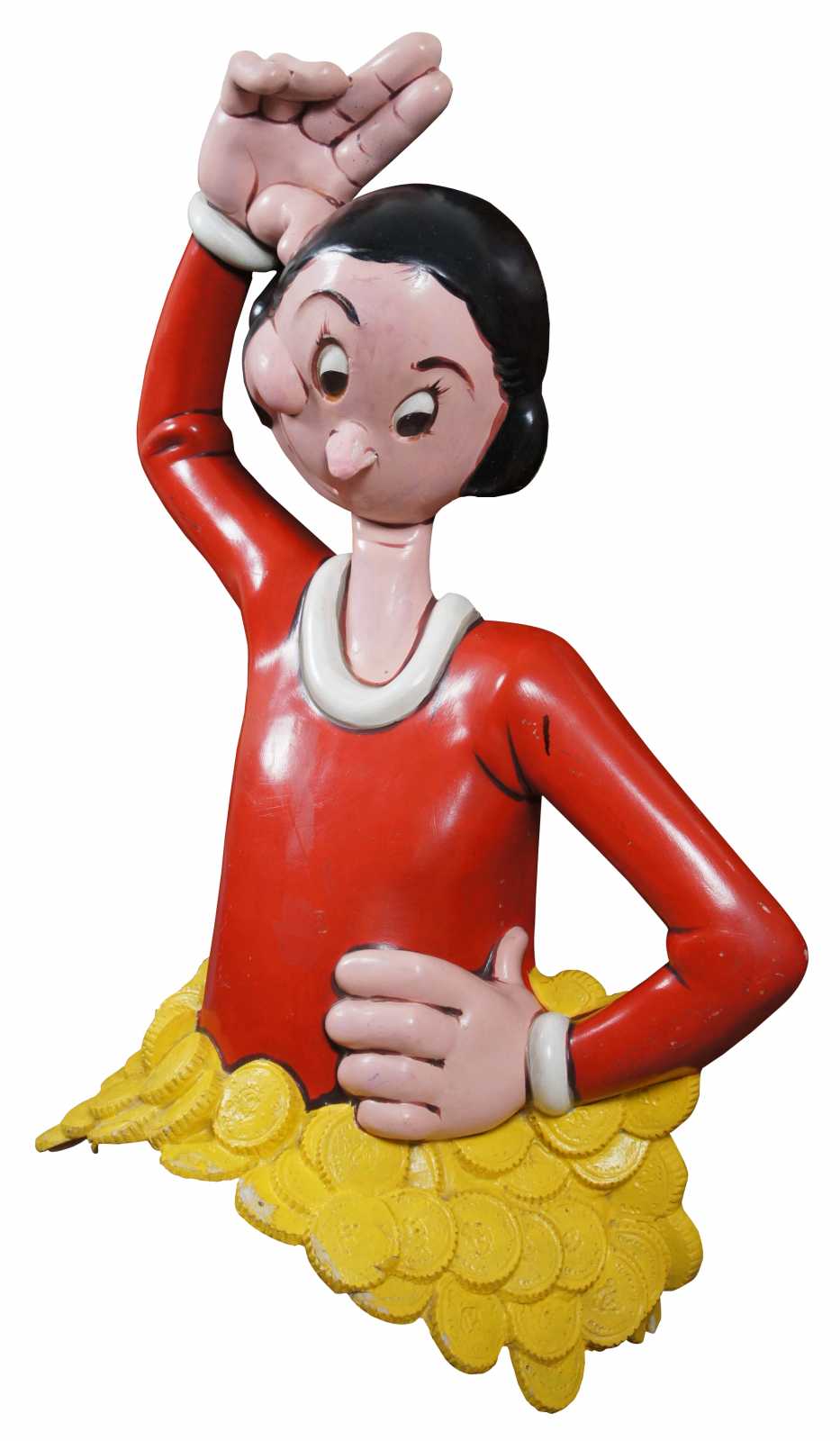 Large vintage fiberglass wall hanging sculpture or slot machine topper featuring Olive Oyl from the “Popeye the Sailor Man” comics and cartoons. Olive poses smiling with one hand on her hip and the other in the air, emerging from a pile of coins.