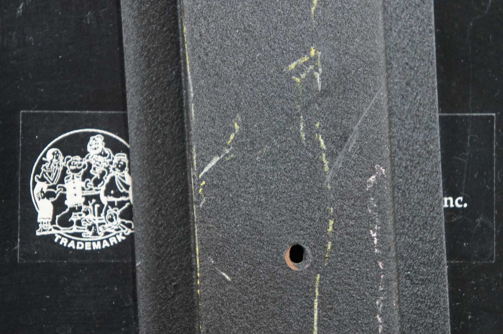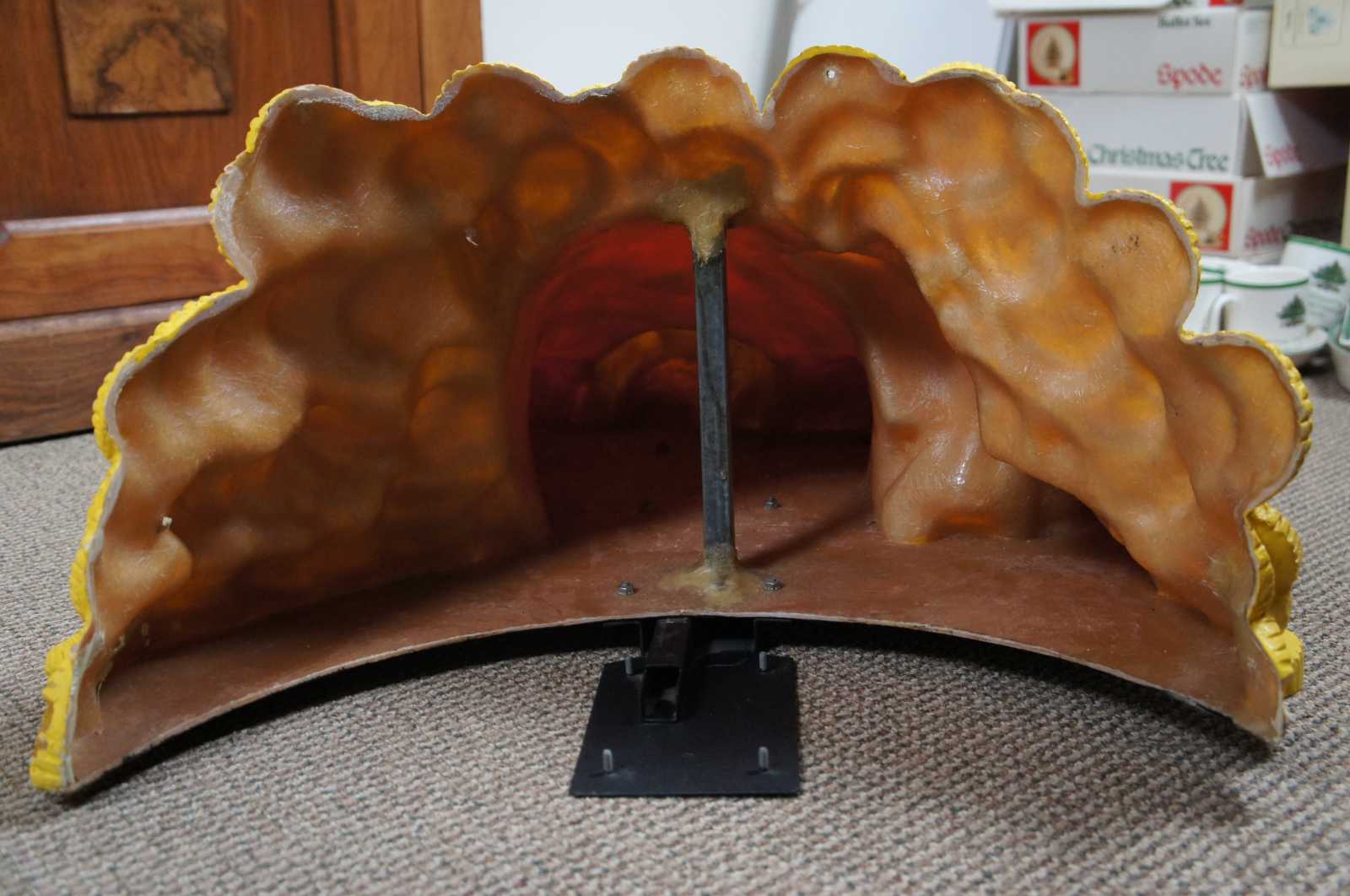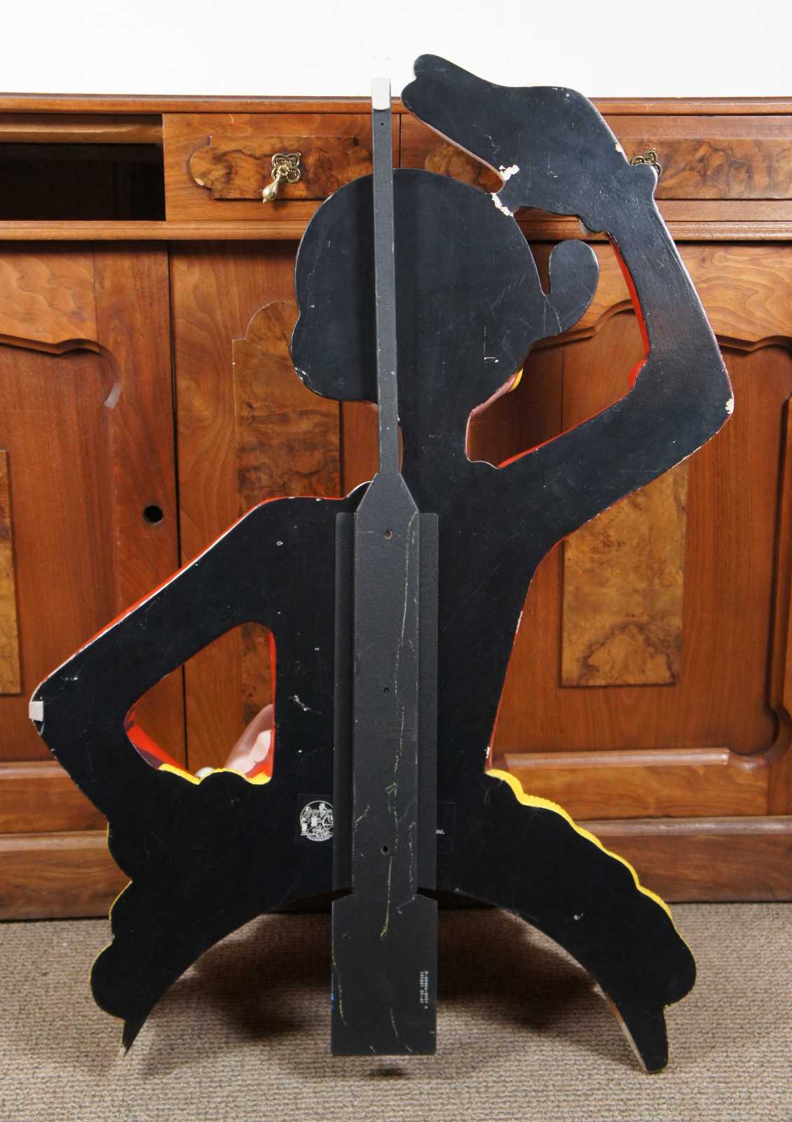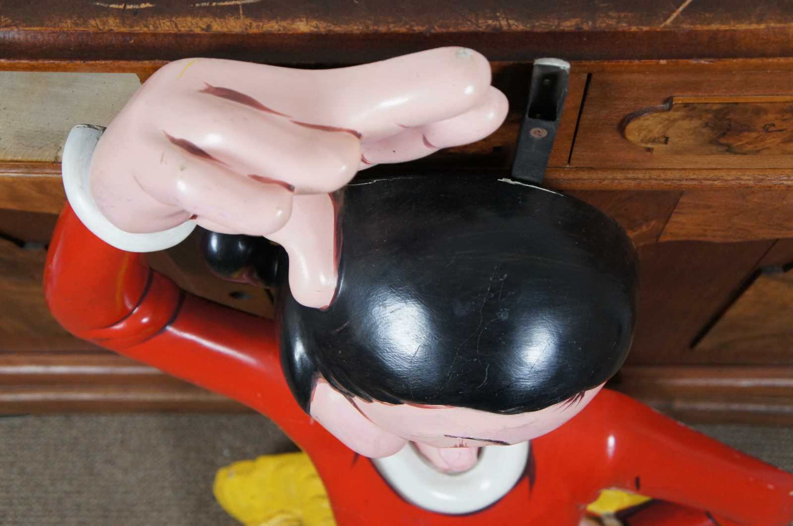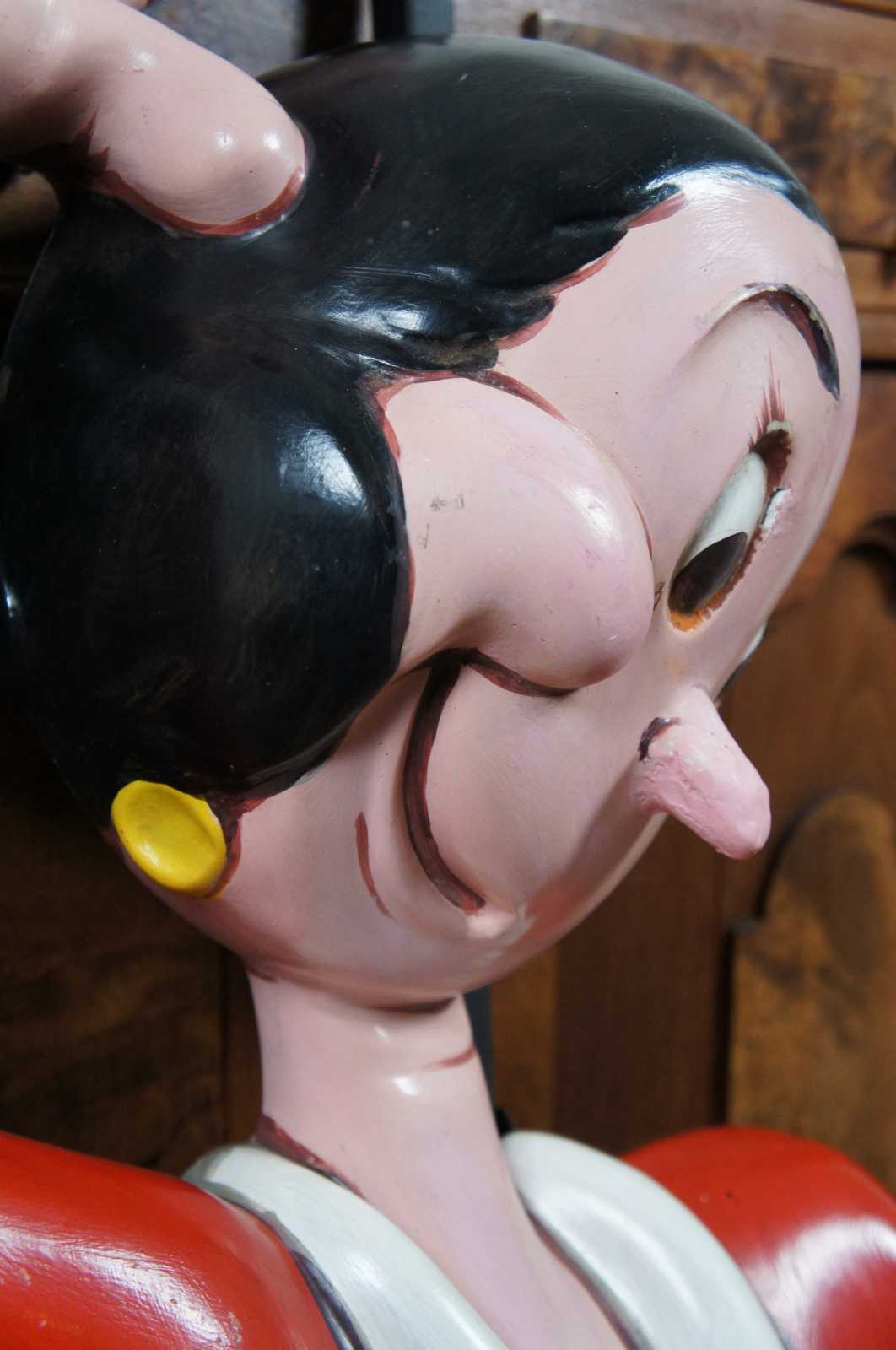 Large vintage fiberglass wall hanging sculpture or slot machine topper featuring Olive Oyl from the “Popeye the Sailor Man” comics and cartoons. Olive poses smiling with one hand on her hip and the other in the air, emerging from a pile of coins.