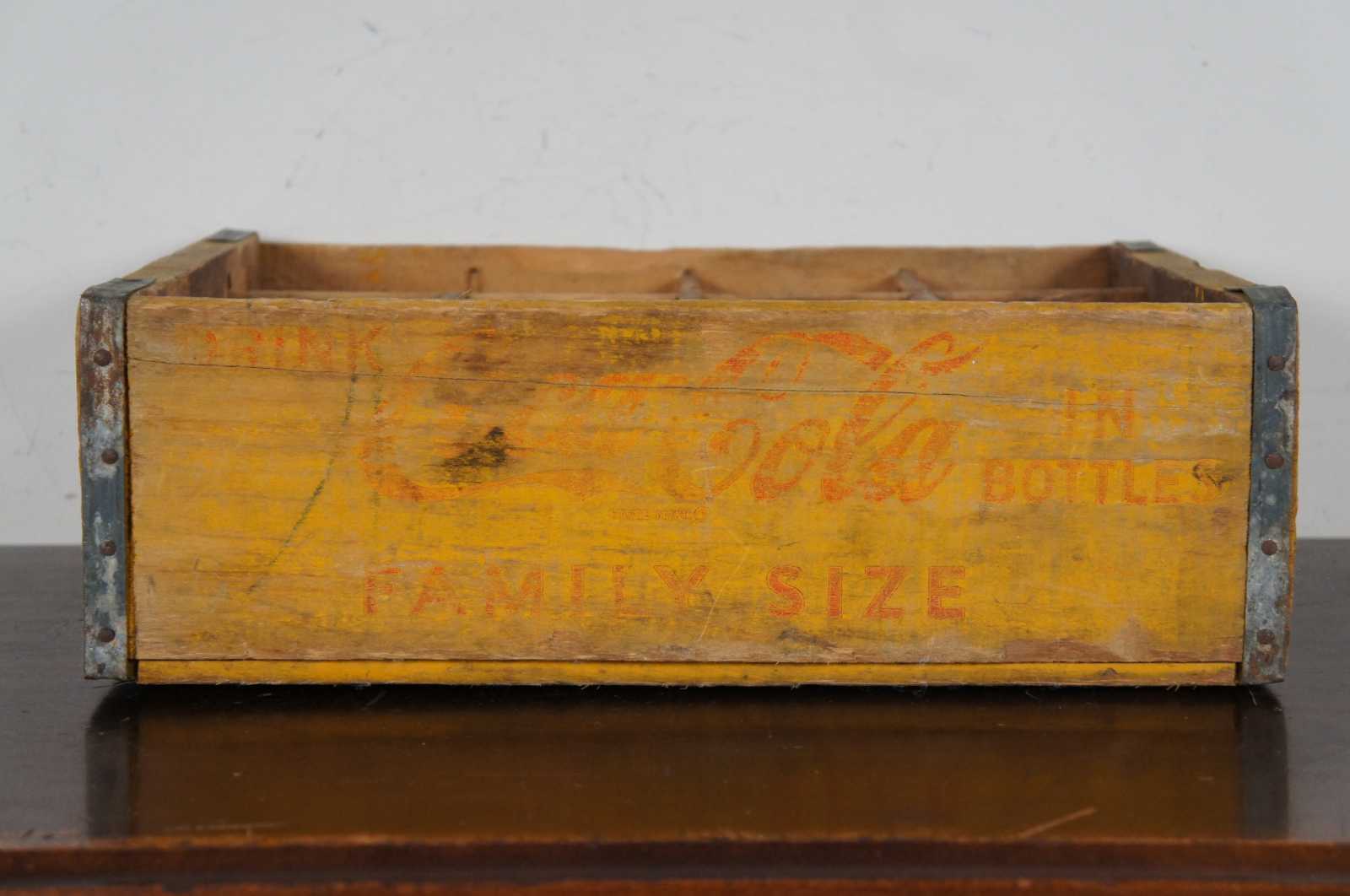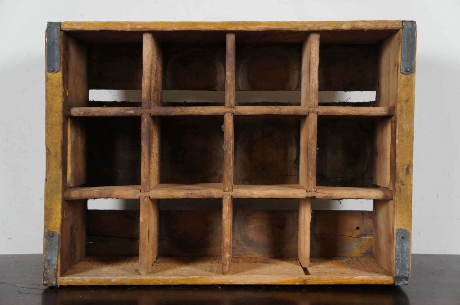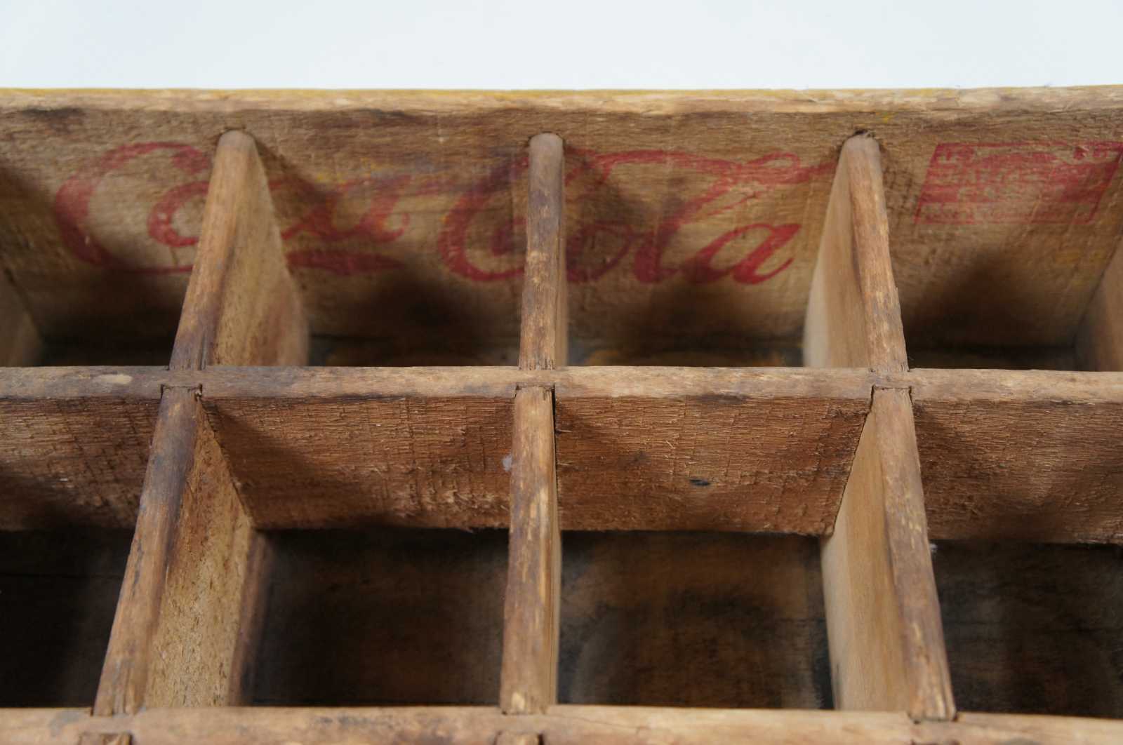 Vintage yellow and red painted wood Coca Cola carrying case with space for twelve bottles.