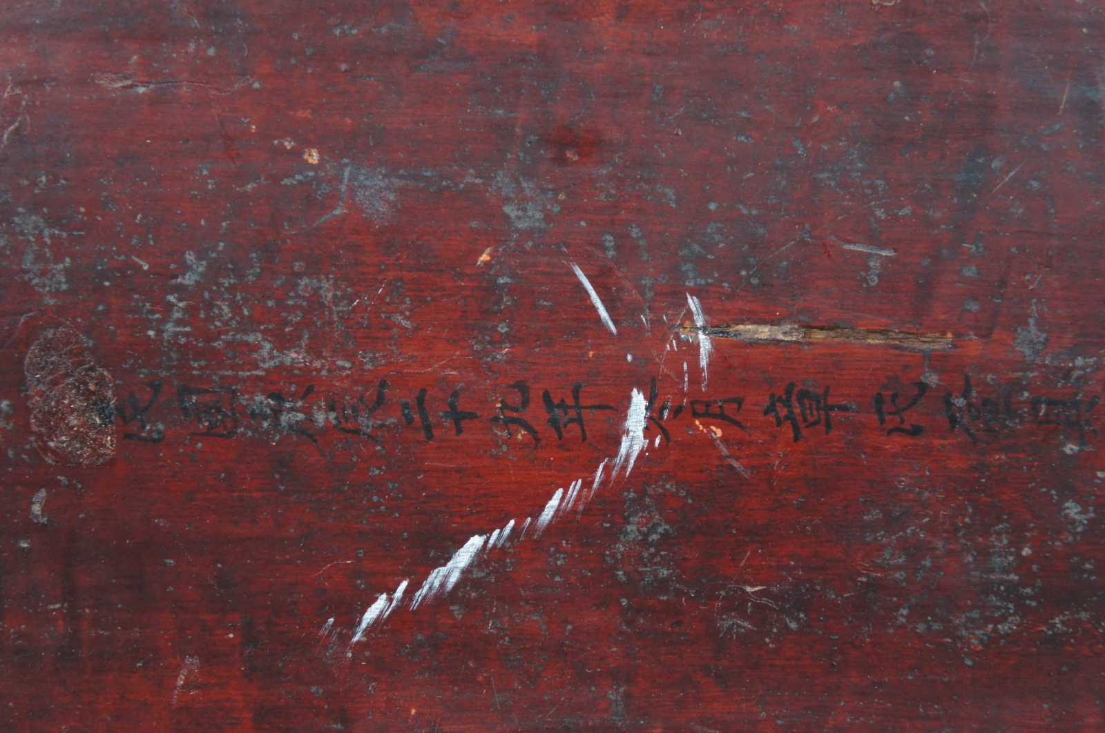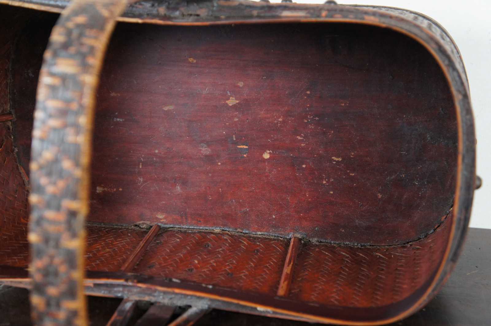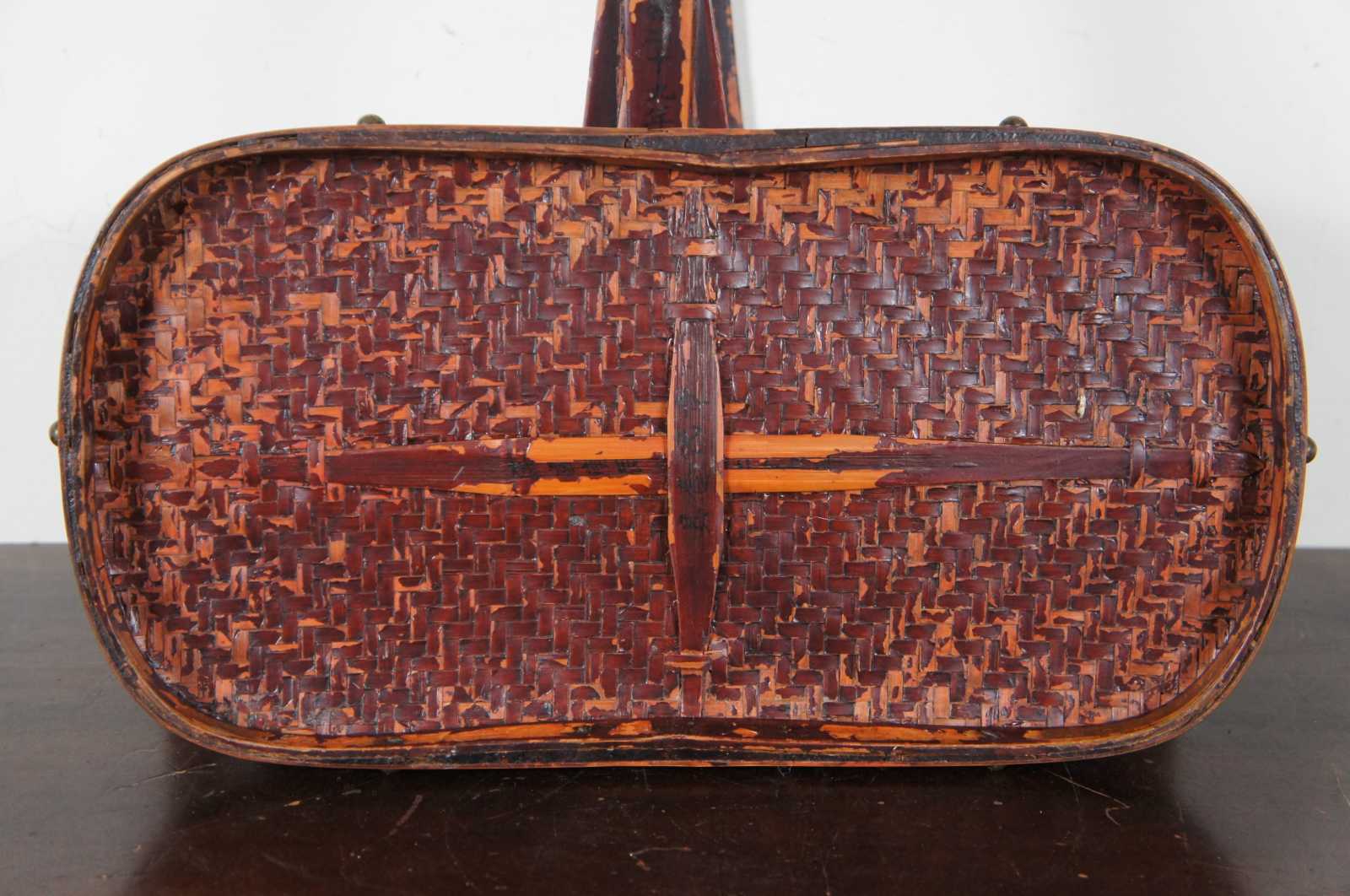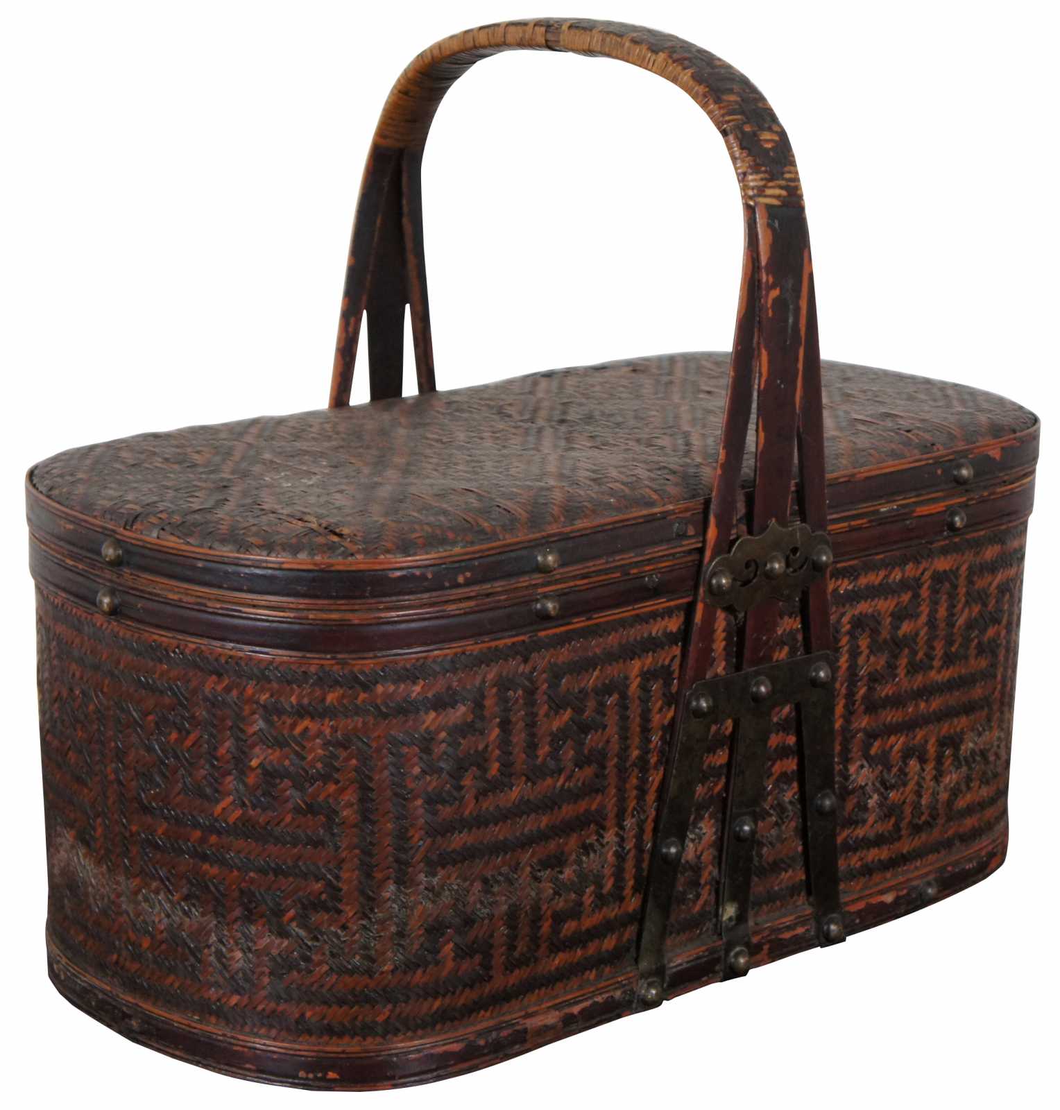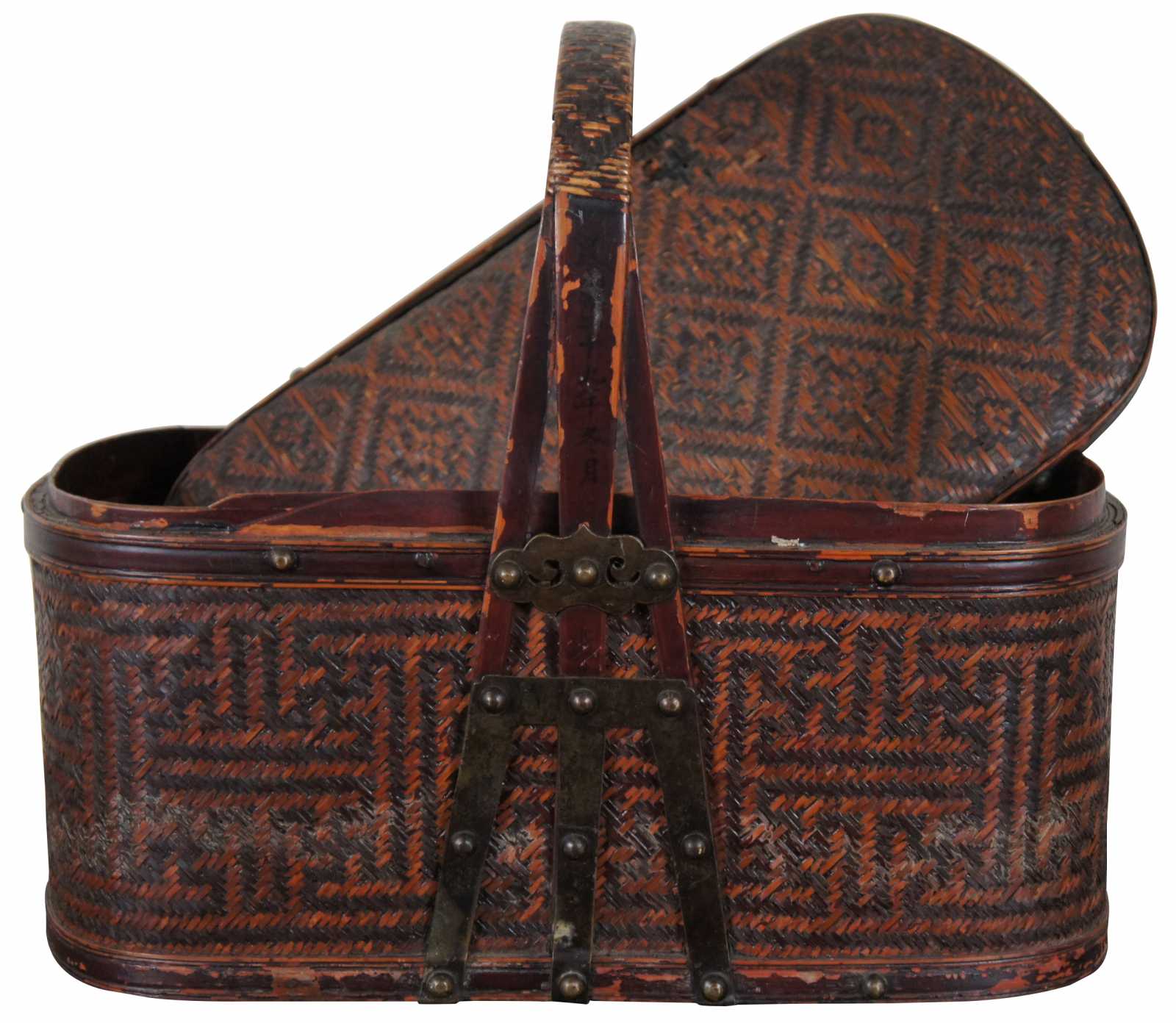 Vintage bamboo wicker rattan lidded picnic basket with brass supports for the handle and painted patterns and calligraphy.