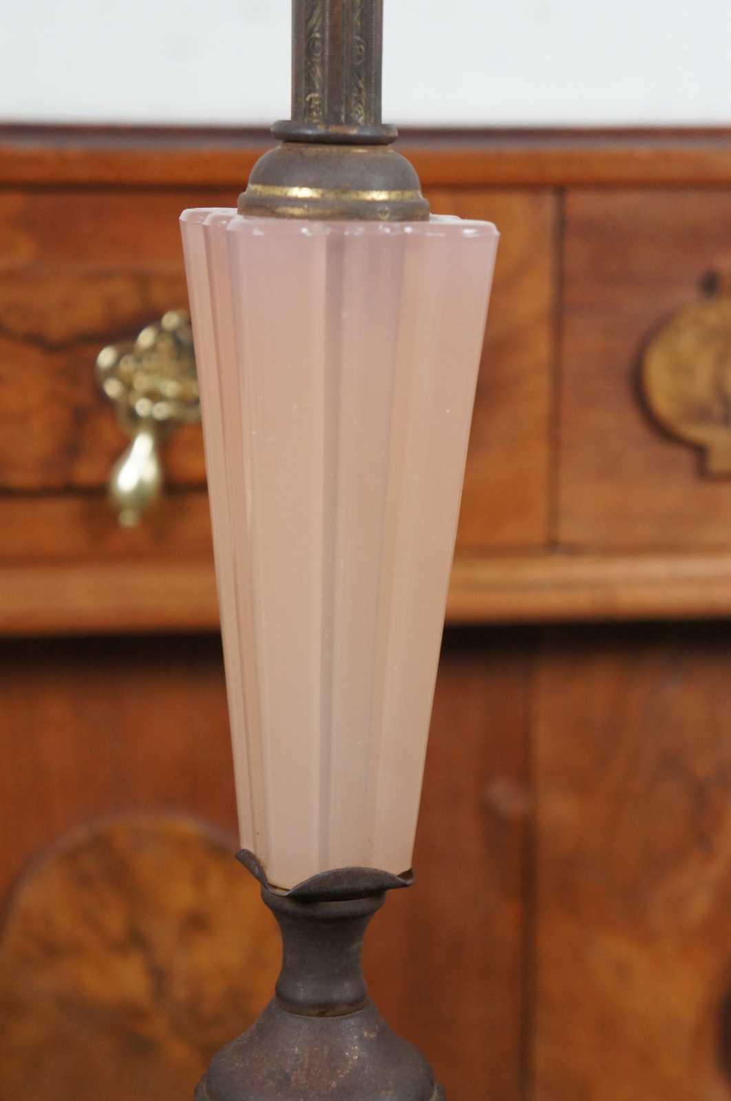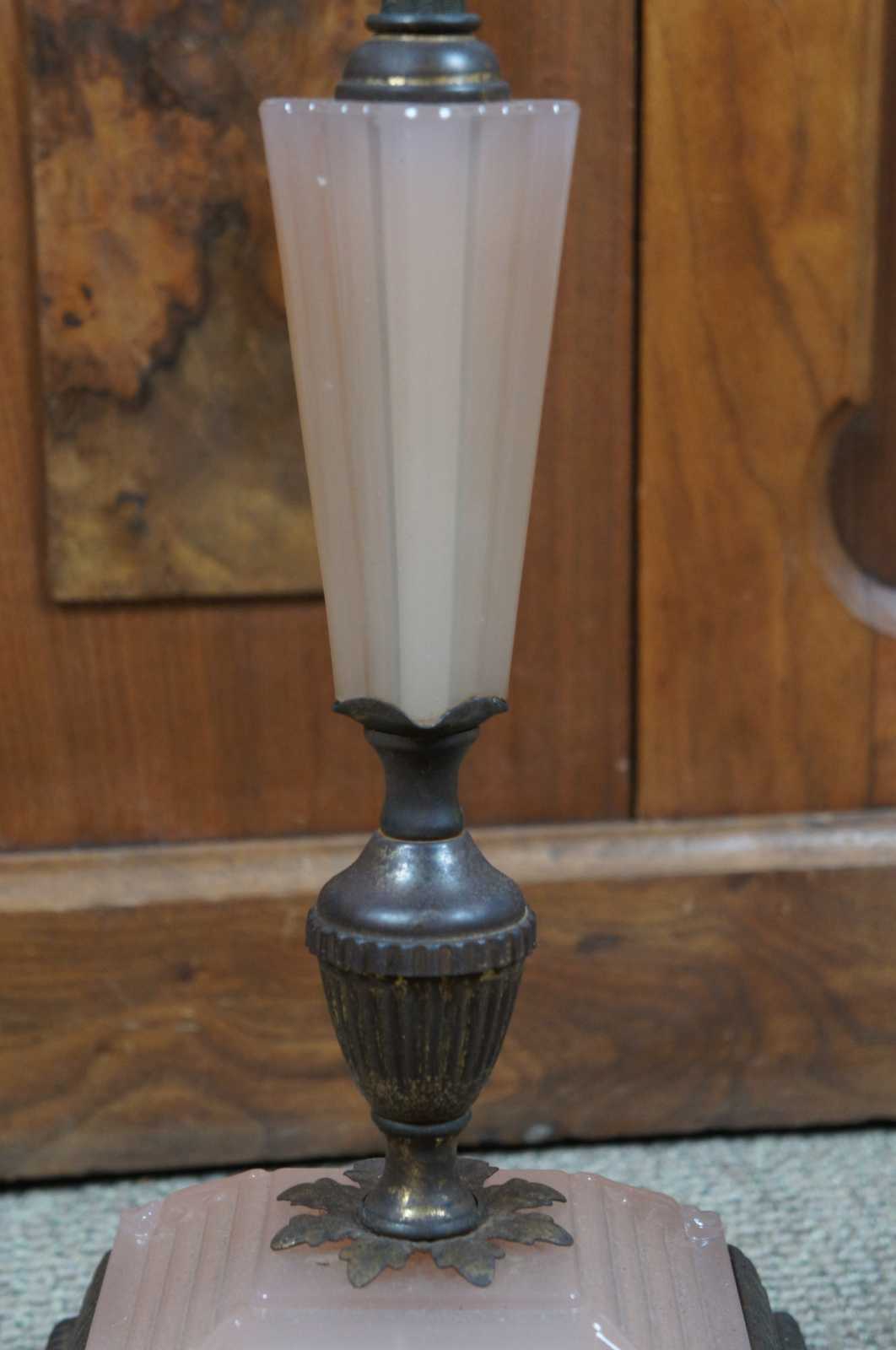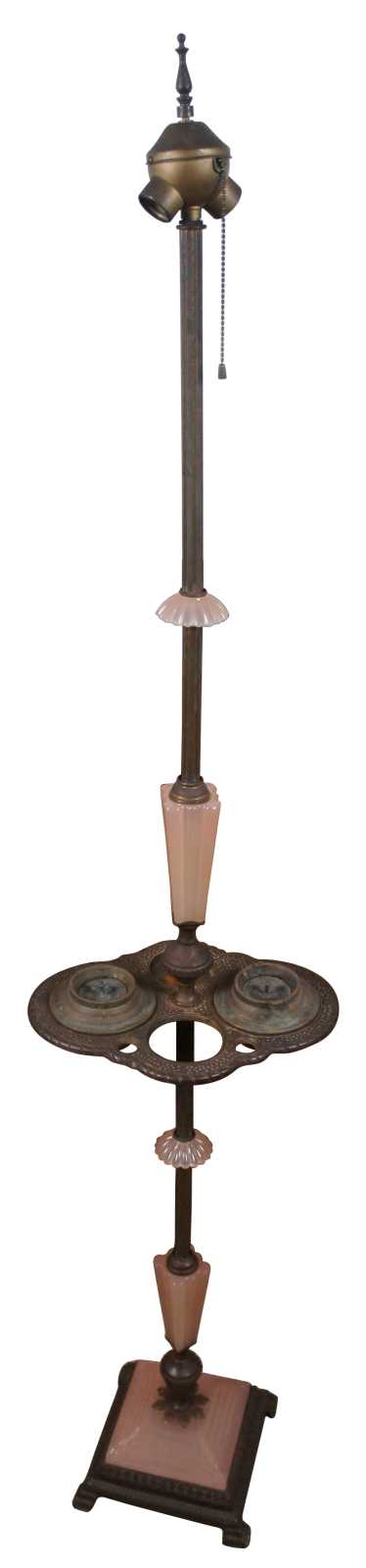 Antique Houze Glass Company pink glass and brass art deco style smoke stand / two light floor lamp; includes two ashtrays and missing the original match holder and lighter.
