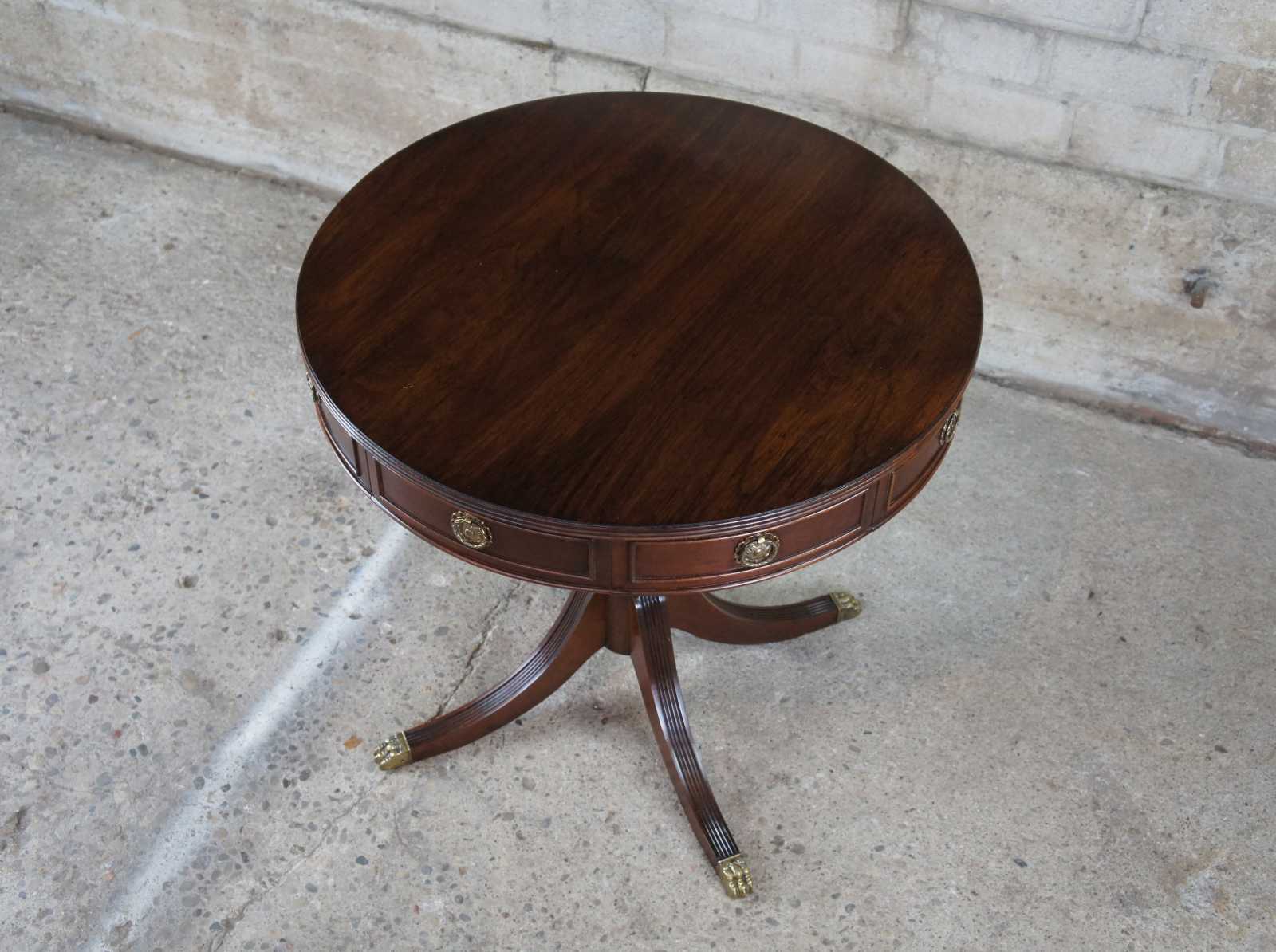 Sheraton style mid 20th century mahogany drum table. Features a round top with fluted edge and two drawers over a turned baluster base leading to four saber legs.