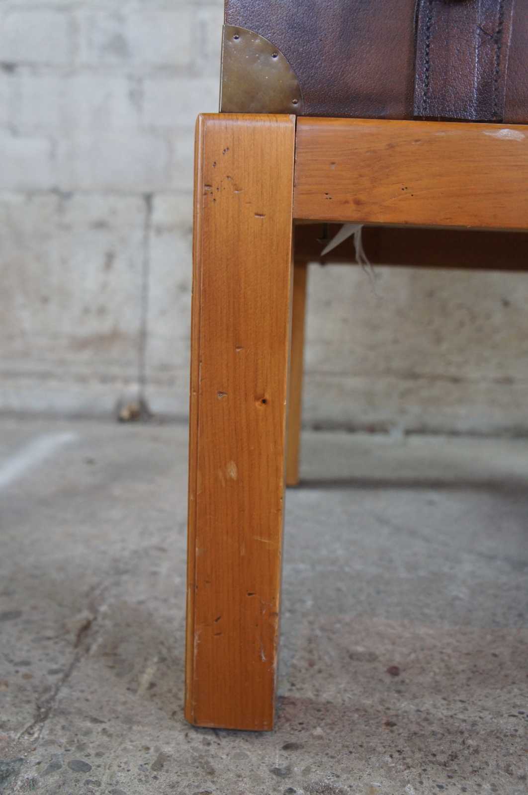 Vintage 1994 leather steam trunk on Pine stand. Features straps and brass covered corners. Trunk does not open
