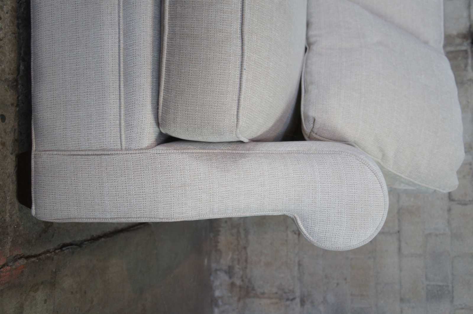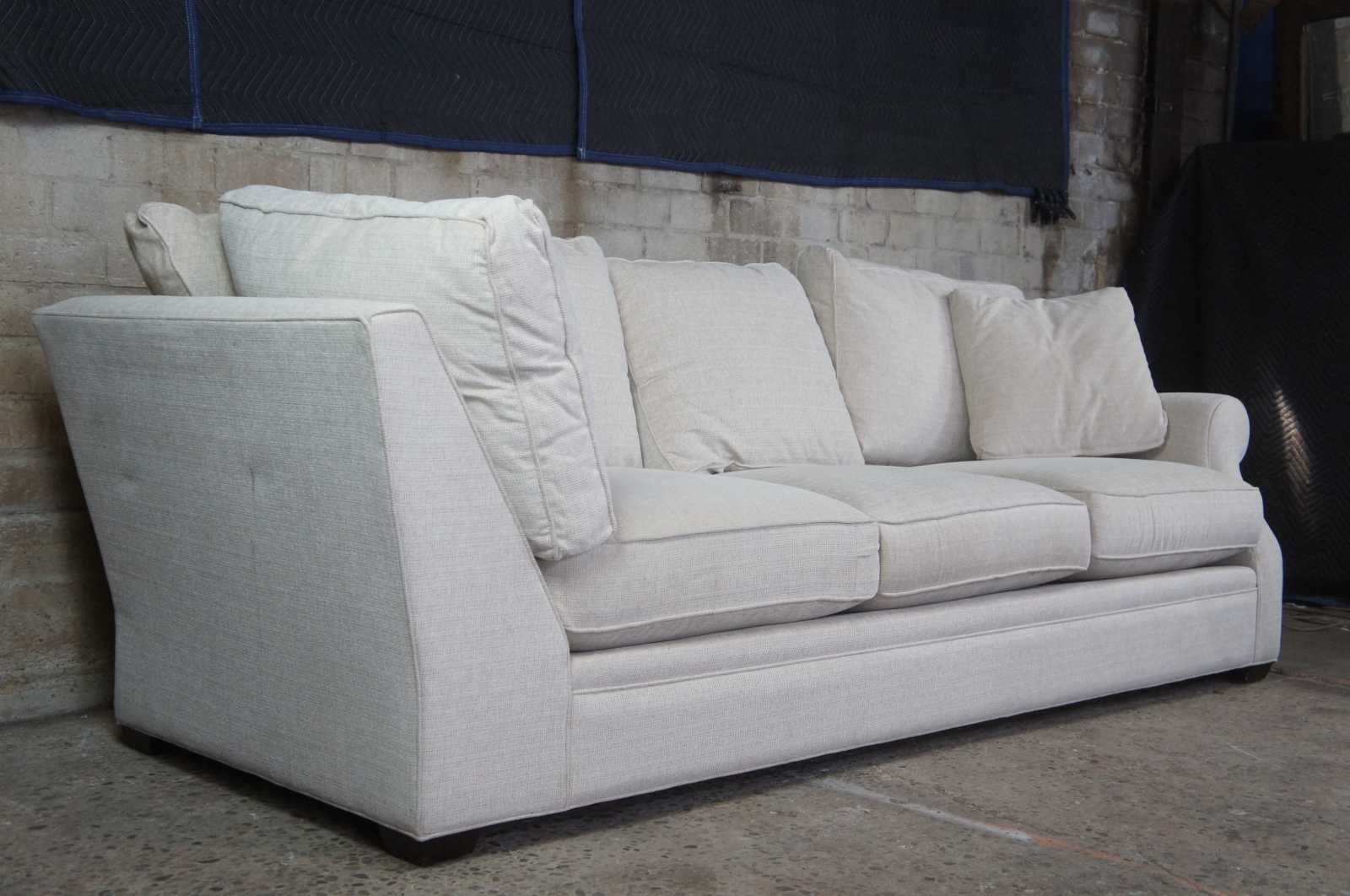 Arhaus, Landsbury Camden, two piece sofa. Strong, durable and earth-friendly, the frame is constructed entirely from wood that has been certified by the Sustainable Forest Initiative, an organization that maintains the standard in the preservation and protection of natural forests. Cushions are sustained by a steel suspension system secured with heavy-duty, 11-gauge, helical coil springs that are made of 95 percent recycled steel and aluminum. To create a sleek appearance while maintaining a comfortable feel, the seat cushions feature a 2.0-density foam core topped with an eco-friendly foam wrap consisting of more than 20 percent plant-based material and are encased in layers of soft Dacron plus an abundance of fibers, feathers and down to deliver a soft and cozy feel.