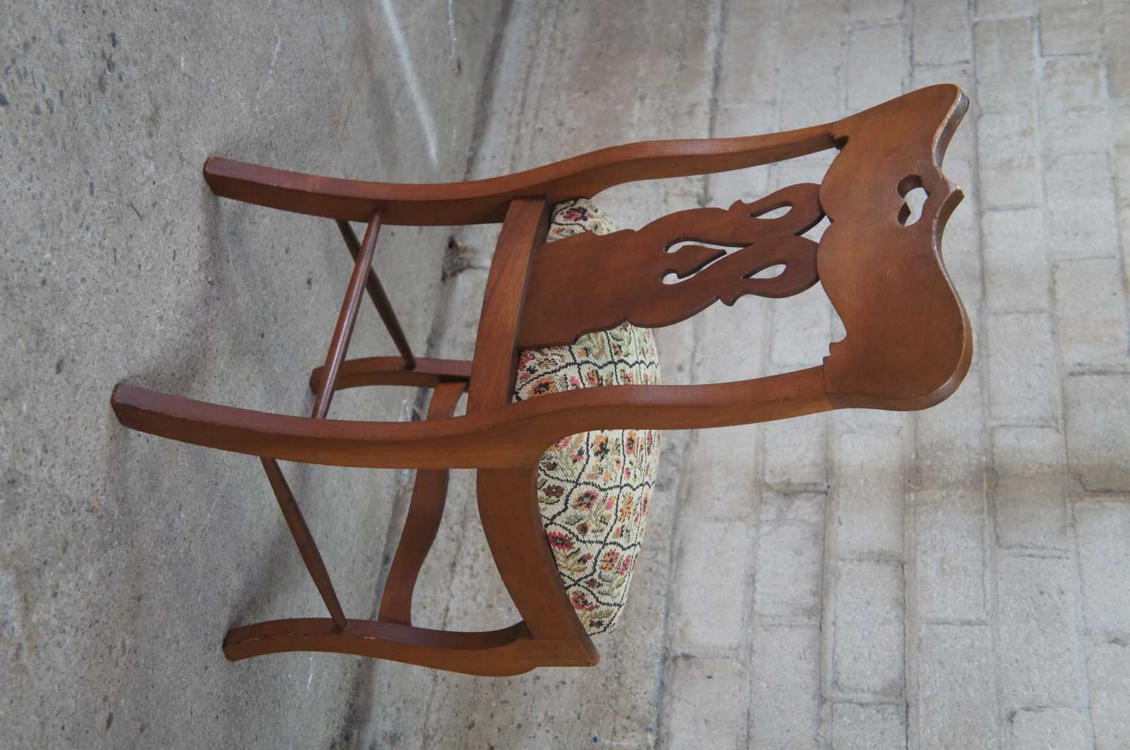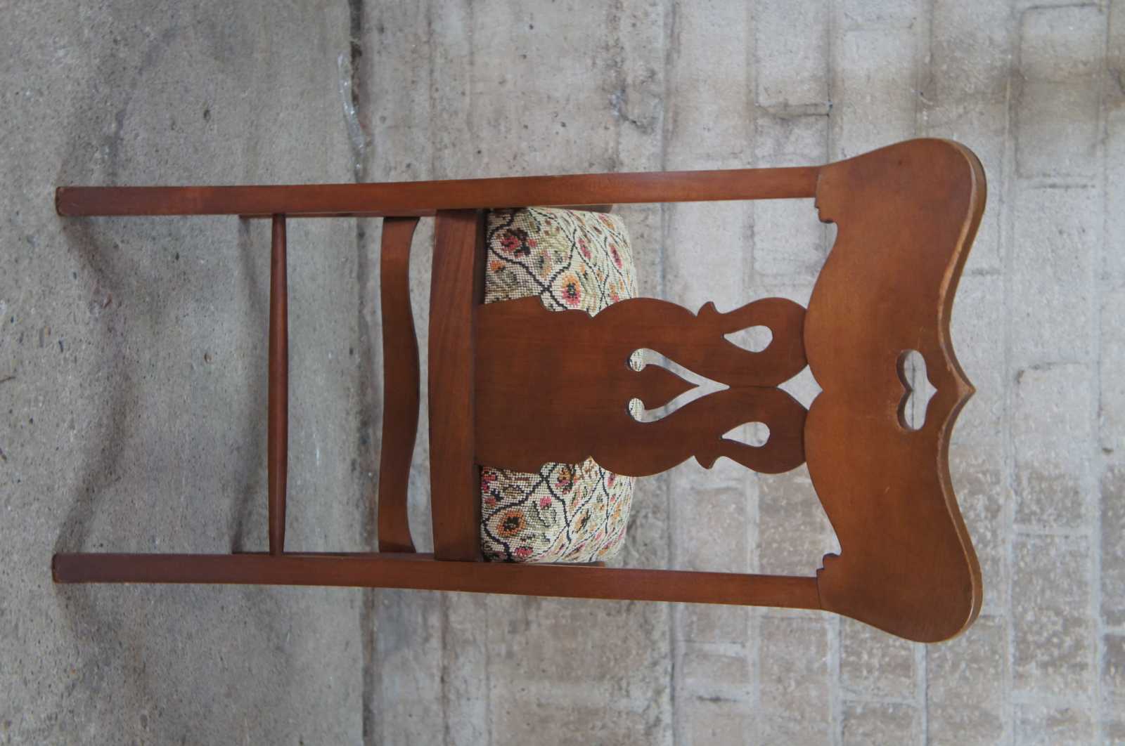 Antique 19th century American Empire side vanity chair. Made from cherry with flame mahogany veneer,serpentine form, ornate carved splat and needlepoint seat.