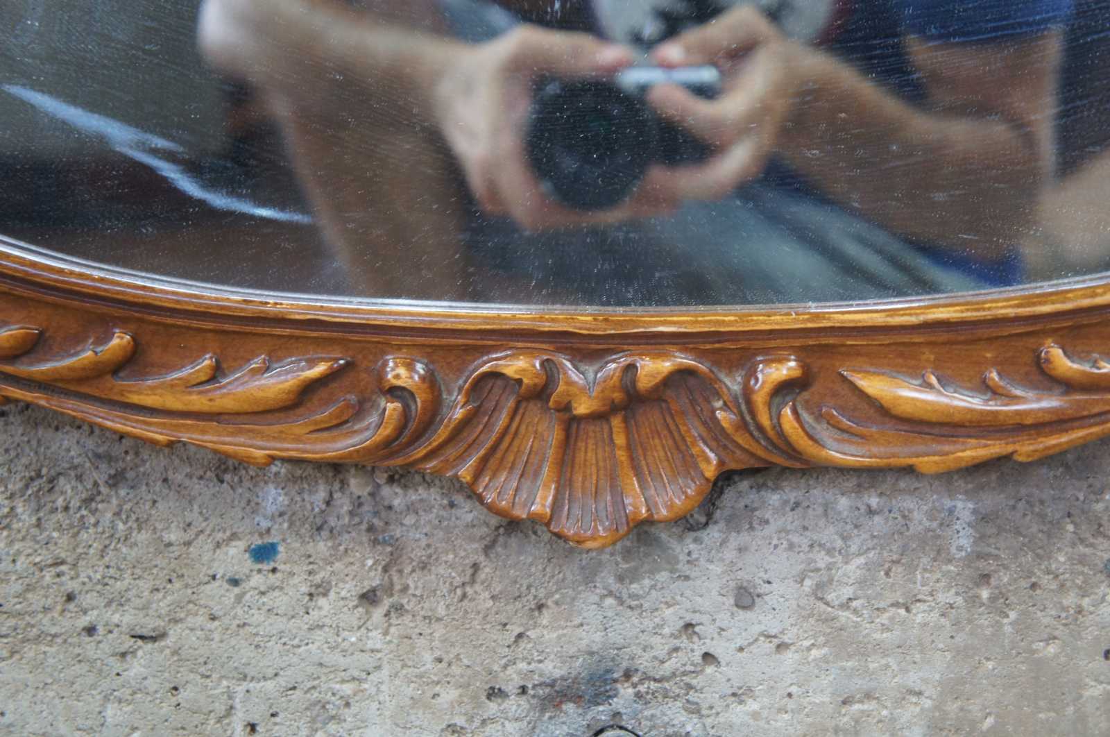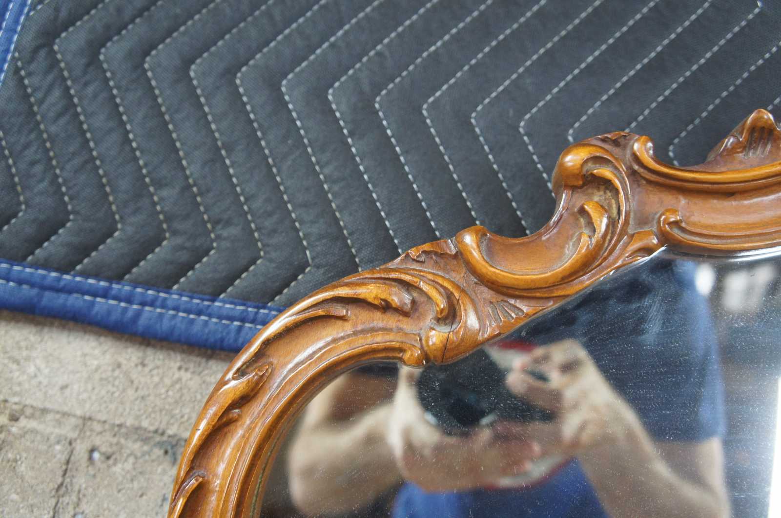 Pair of 1940s French wall mirrors. Made from walnut with ornate scalloped design.