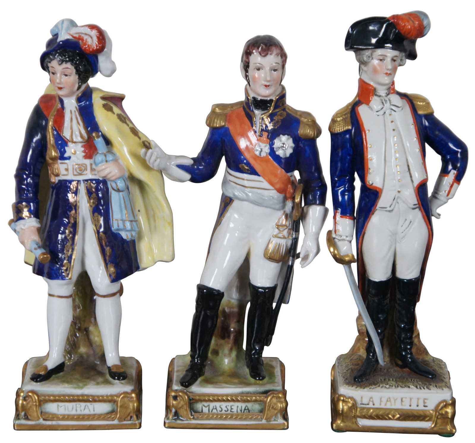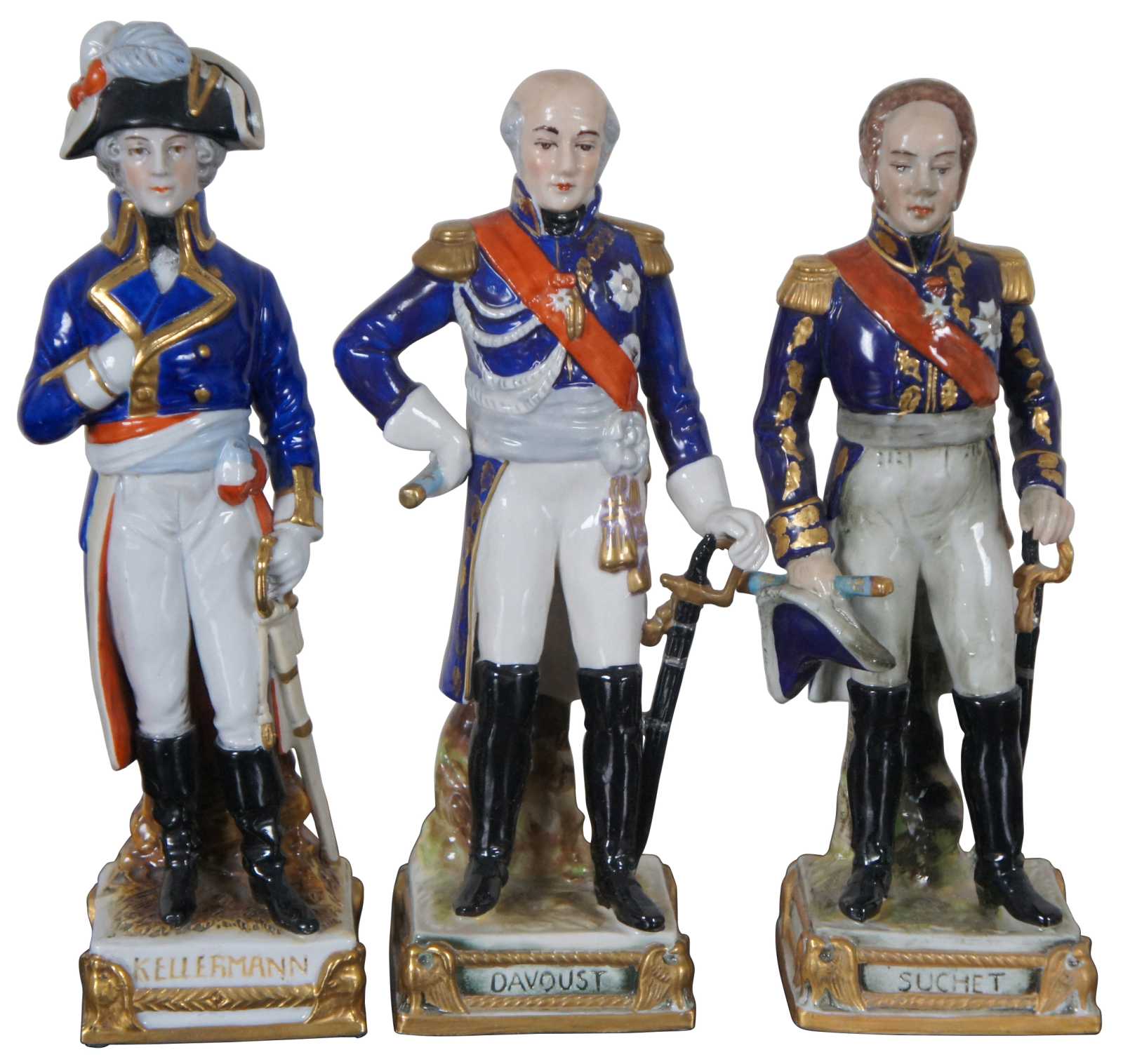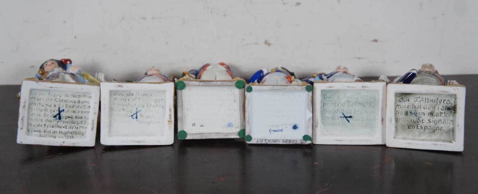 A rare and impressive lot of six Scheibe-Alsbach/ Meissen and Burdois & Bloch porcelain figurines portraying Napoleonic military commanders Joachim Murat, Andre Massena, Marquis de La Fayette, François Christophe de Kellermann, Louis-Nicolas Davout, Louis-Gabriel Suchet. 4 of the 6 figures are very difficult to acquire and rarely come up for sale.