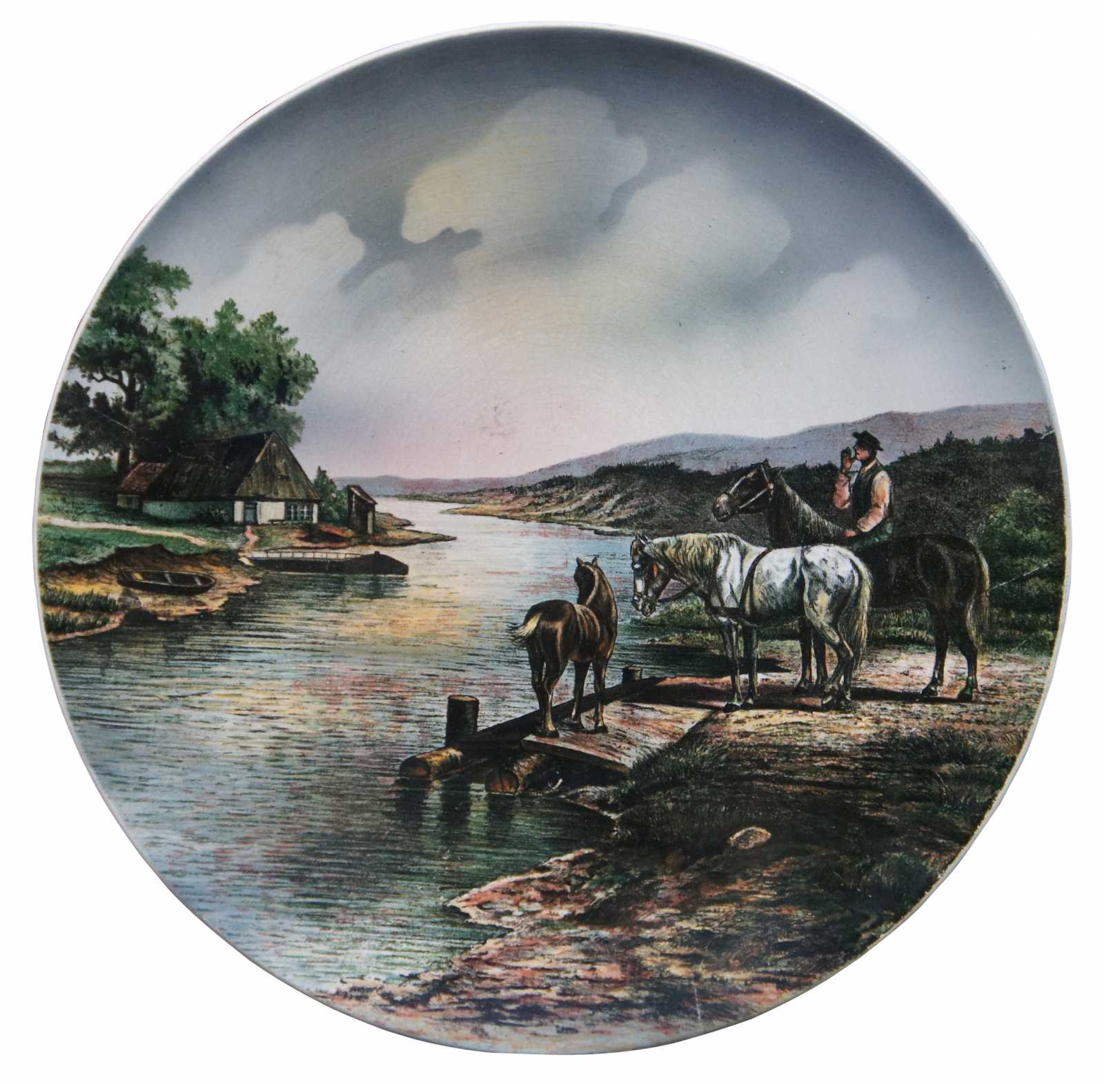 Pair of antique Villeroy & Boch decorative plates, 3191 and 3192, showing full color country riverscape or landscape with farmhouse and figures on horses.