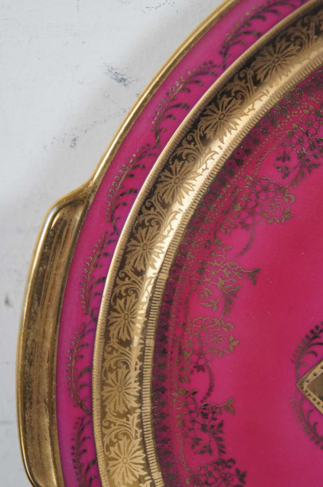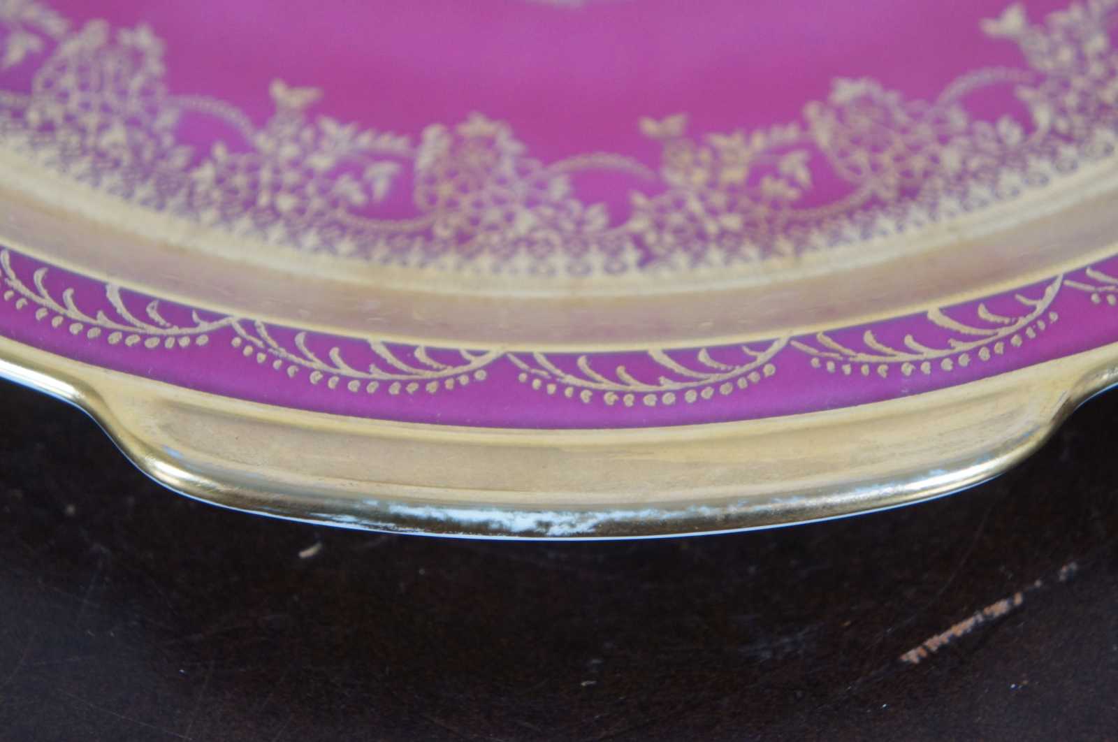 Antique Royal Bavaria Hutschenreuther Selb Privat-Decor portrait round platter / charger / plate with handles in magenta embossed with gold surrounding a scene of two lovers. by Dragonard