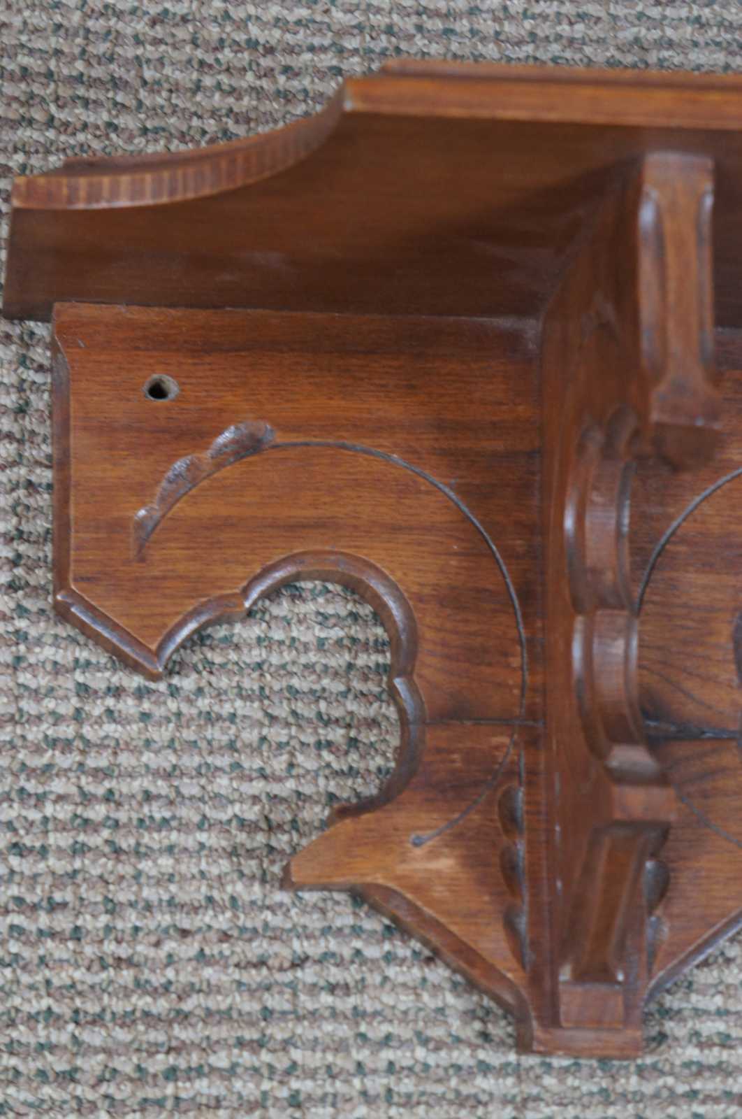 Antique Victorian walnut carved wall shelf with gothic style cut out trefoil accents and beveled edge.