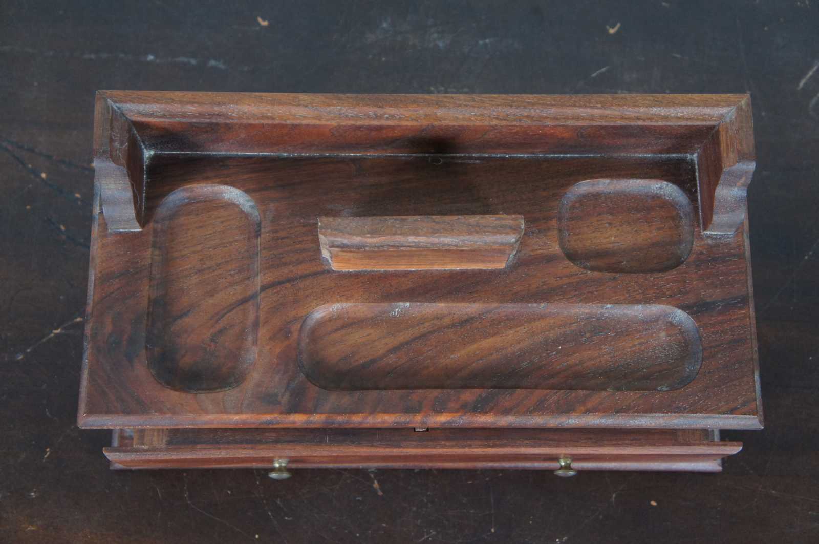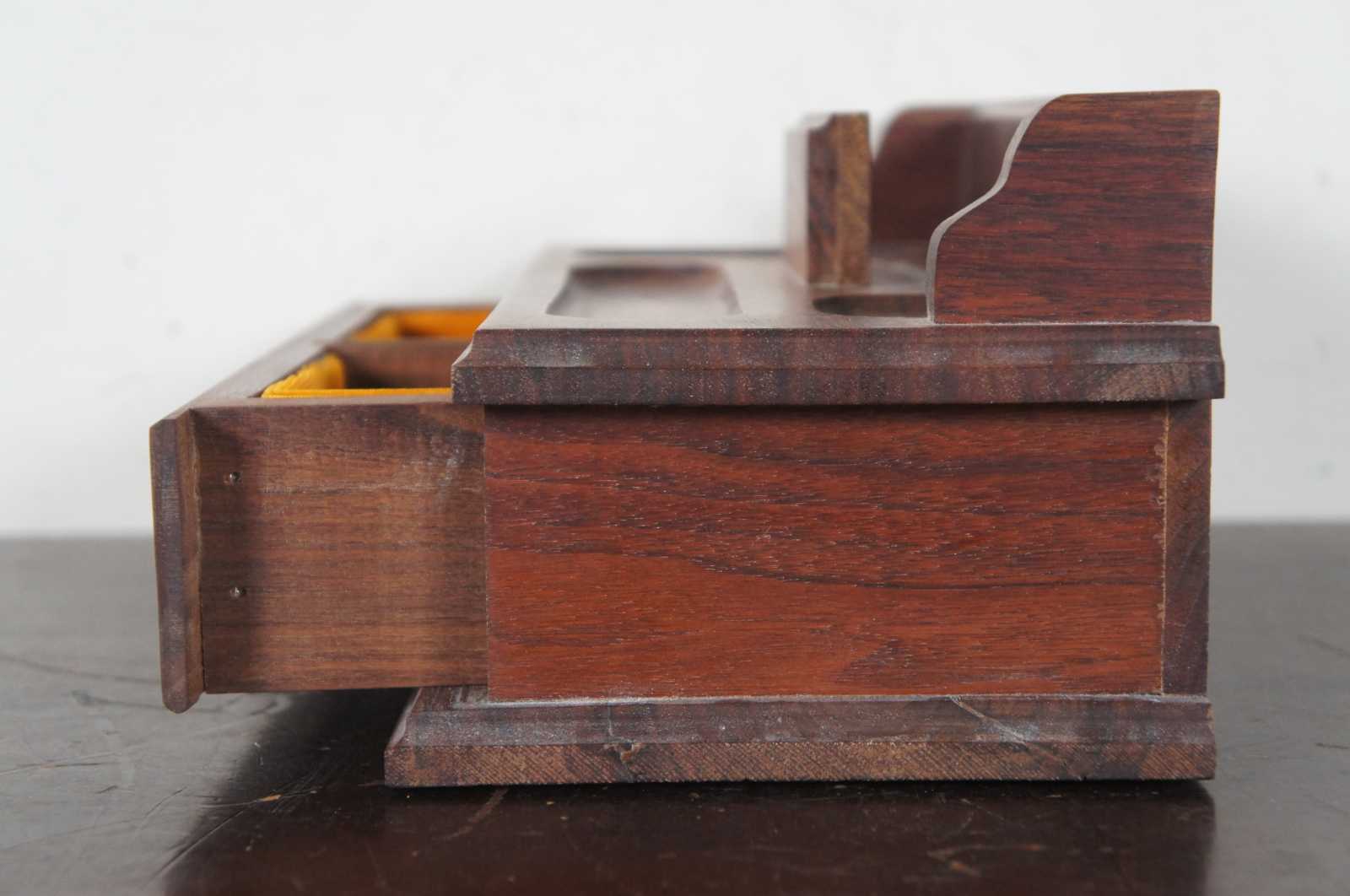 Vintage artisian or craftsman hand made walnut wood dresser top jewelry organizer with two velvet lined drawers, marked by the maker Marvin E. Nedved. Circa 1960s.