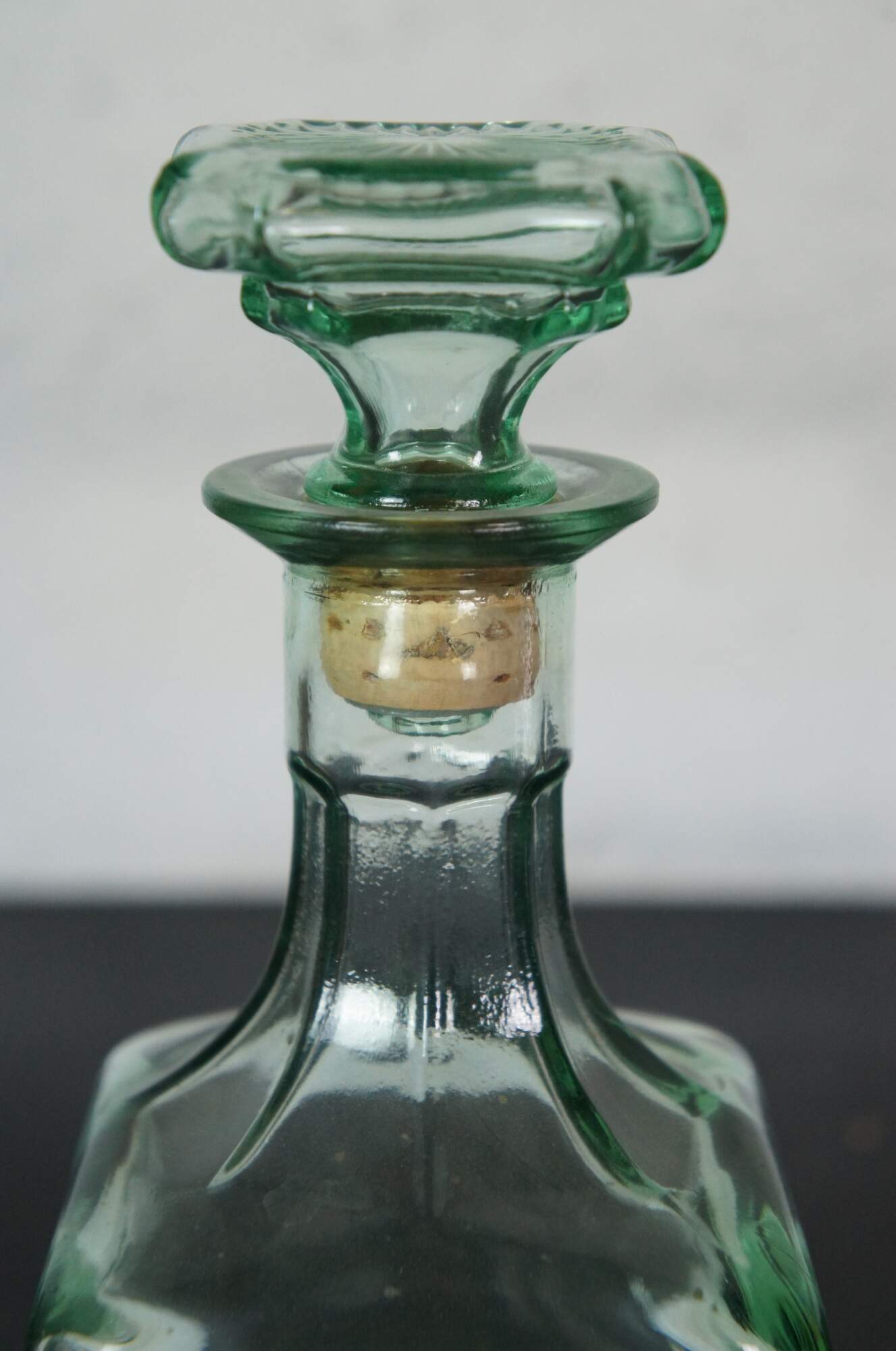 Vintage 20th century Old Fitzgerald Collection Liquor Bottle / decanter, produced by Owens-Illinois Glass Company. Pale green glass, rectangular form with pinched waist and faceted corners and cut stopper; front printed with golden foliate vines surrounding a key crossed over a red shield sporting a fleur de lis.