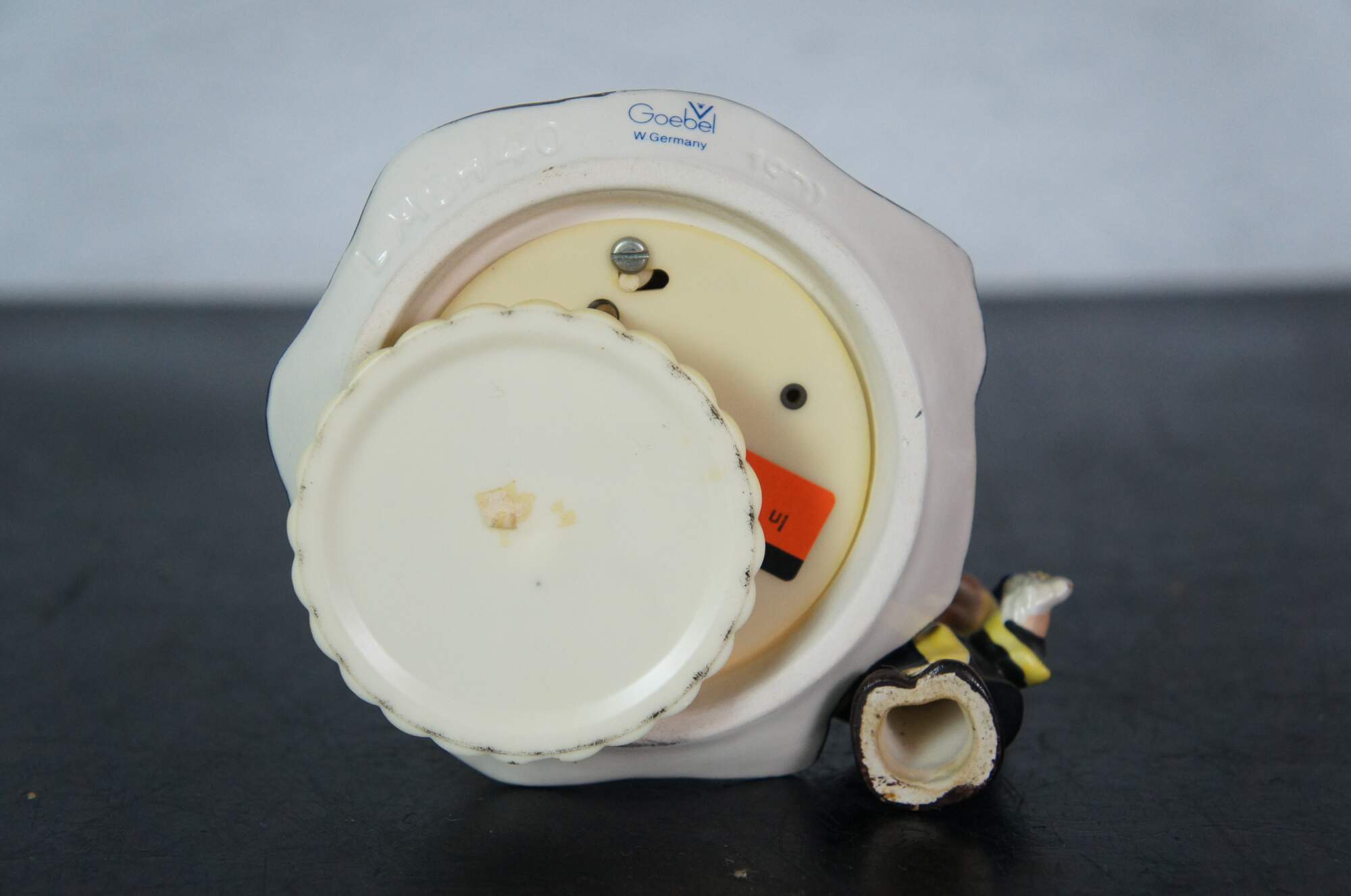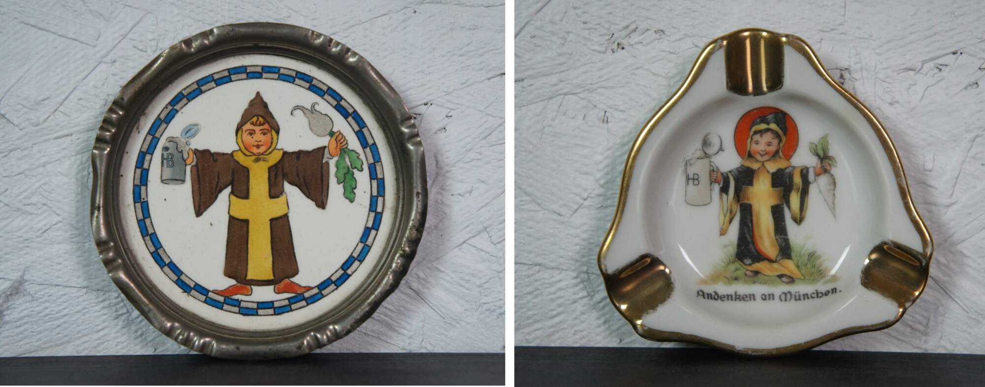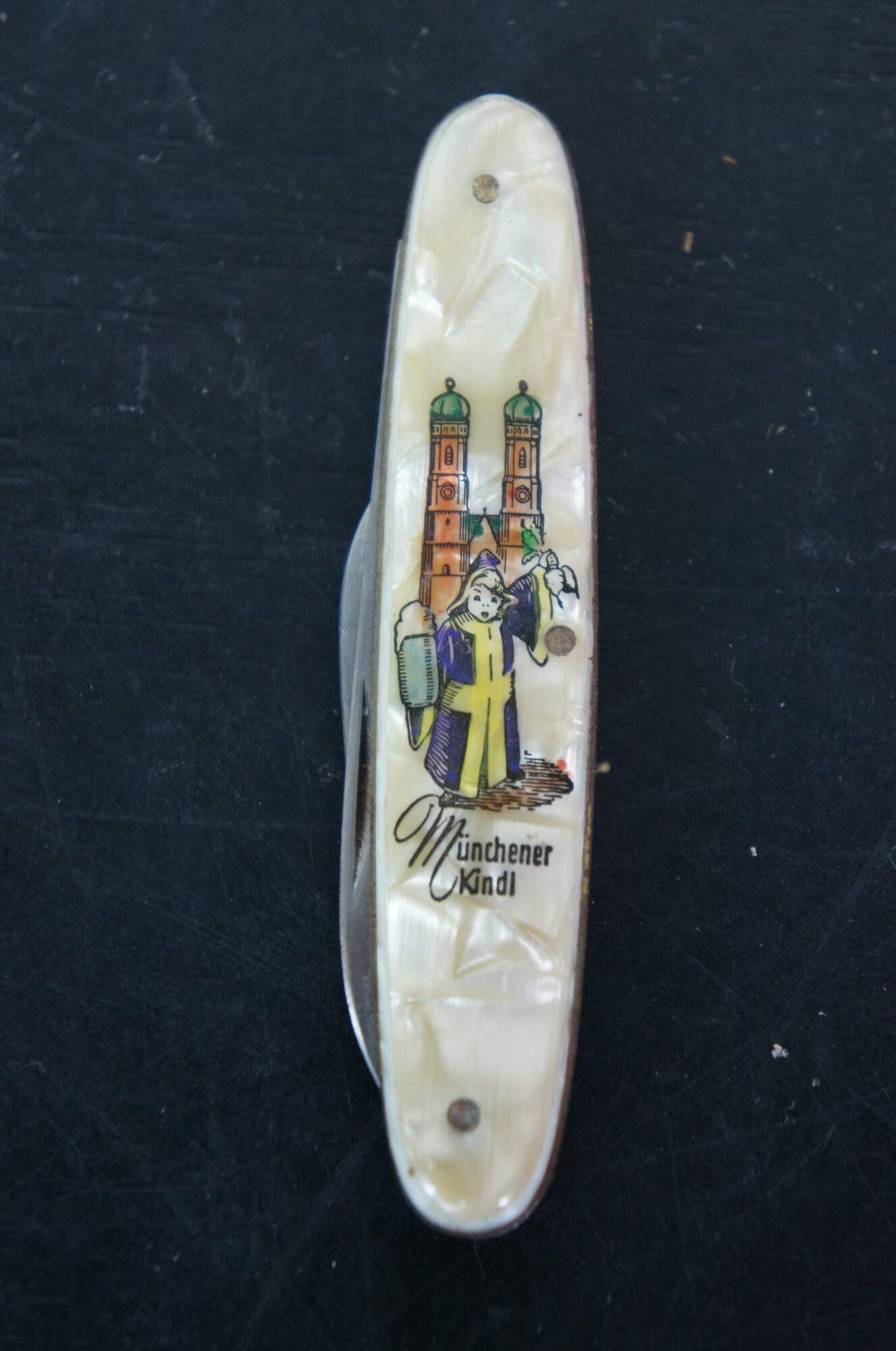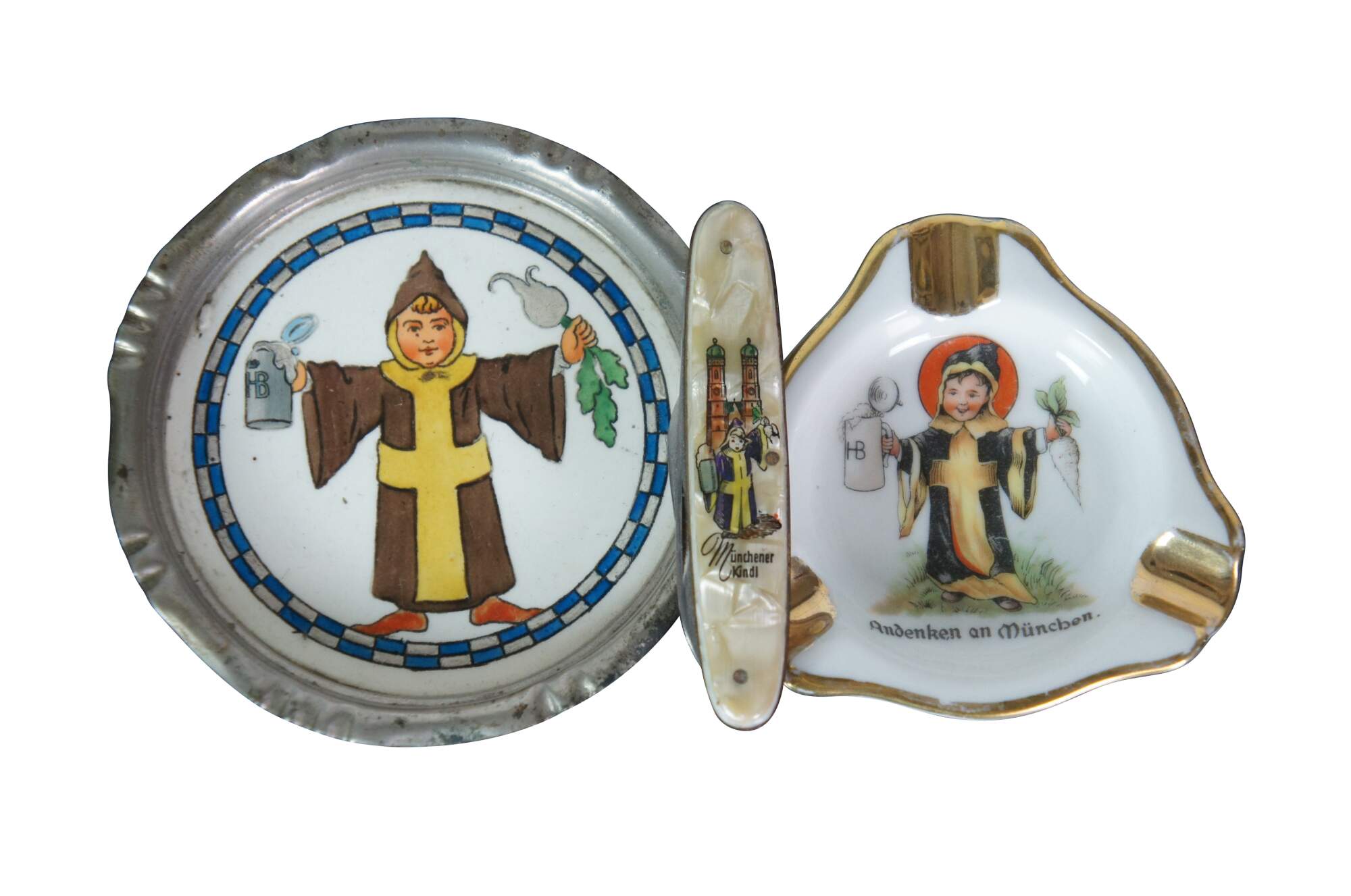 Set of 5 mid to late 20th century souvenir items from Munchen (Munich), Germany featuring the Munchner Kindl (Munich Child). Set includes: Goebel music box figurine (TMK-5 Last Bee mark - circa 1972-79) with works by Superstar Switzerland - "In Munchen steht ein Hofbrauhaus" (There is a Hofbrauhaus in Munich), small ceramic figurine / salt shaker (attributed to Goebel - unmarked), Rostfrei stainless steel and mother of pearl two blade pocket knife, triangular porcelain ashtray by Plankenhammer Bavaria, and circular ashtray with metal rim (unmarked).