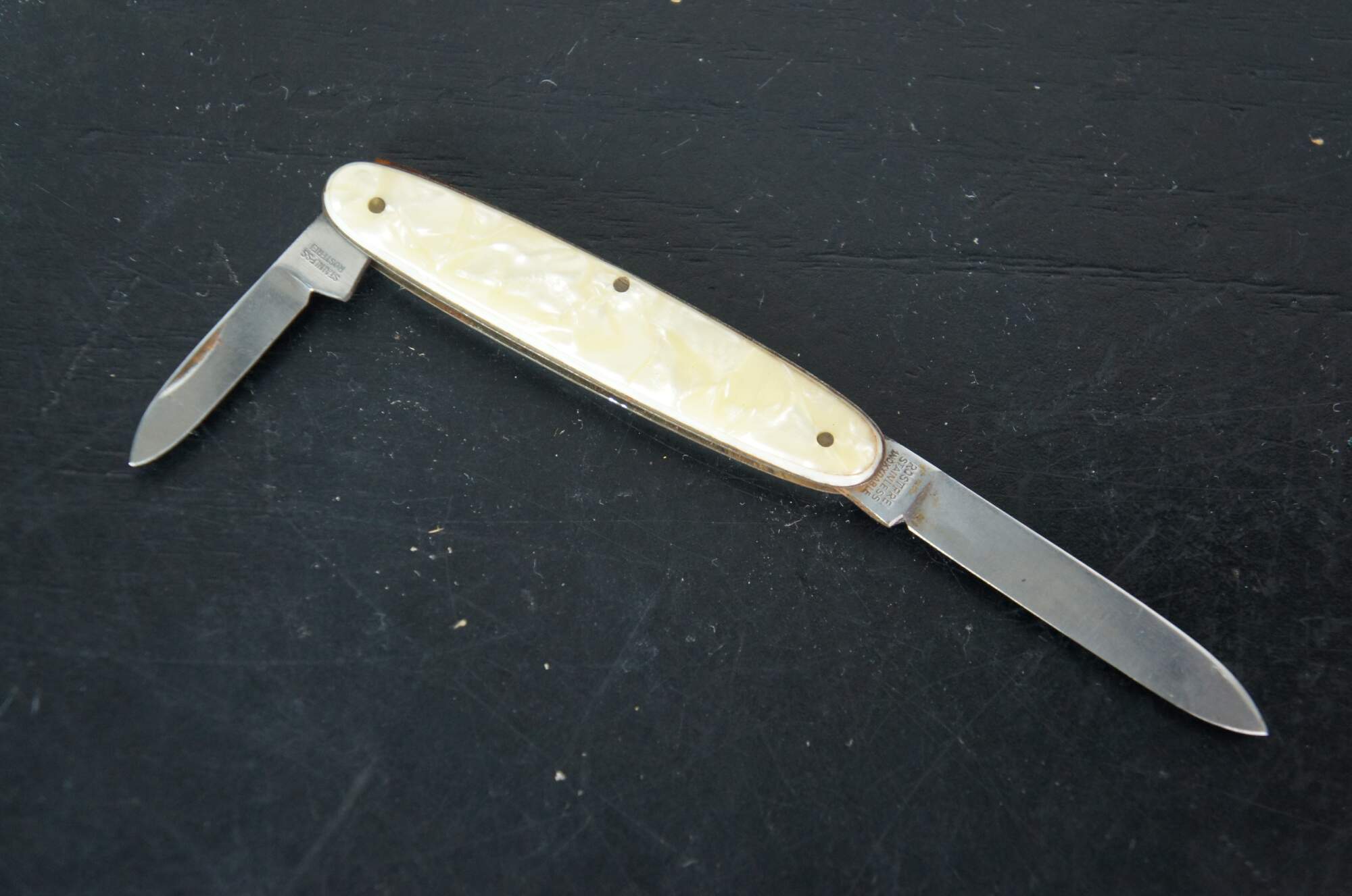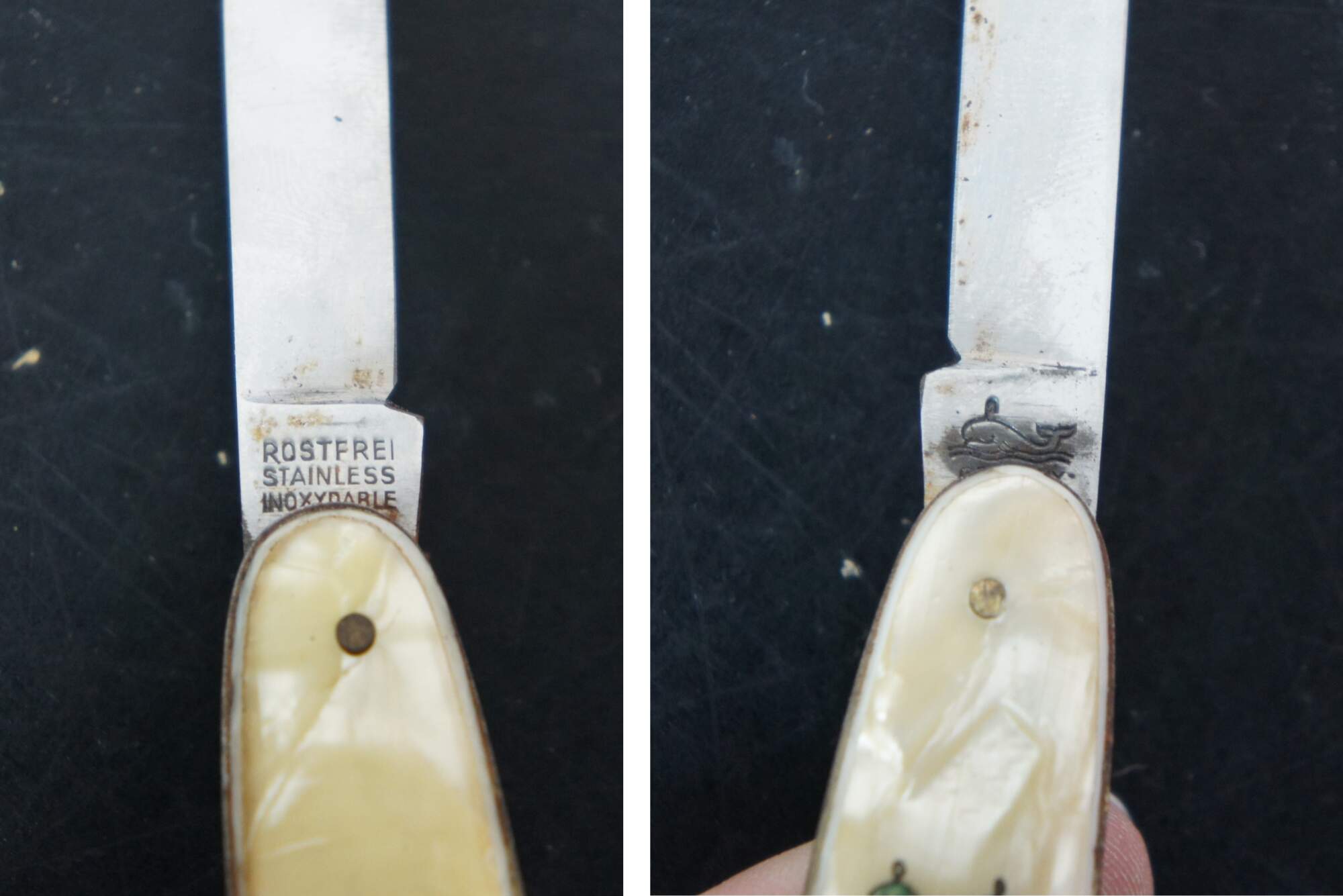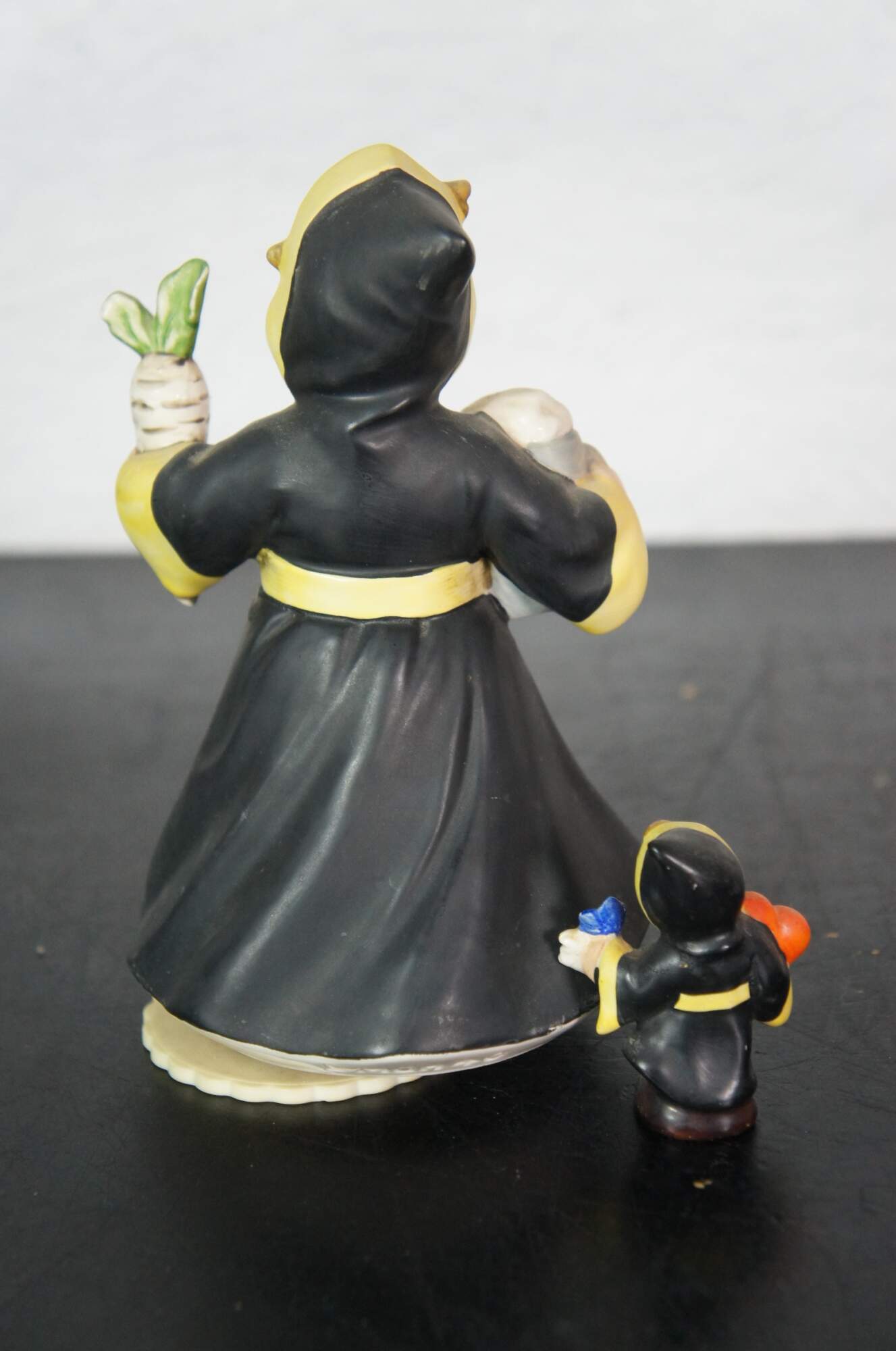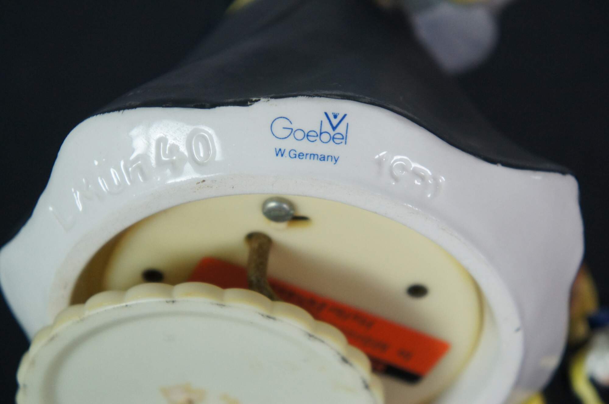 Set of 5 mid to late 20th century souvenir items from Munchen (Munich), Germany featuring the Munchner Kindl (Munich Child). Set includes: Goebel music box figurine (TMK-5 Last Bee mark - circa 1972-79) with works by Superstar Switzerland - "In Munchen steht ein Hofbrauhaus" (There is a Hofbrauhaus in Munich), small ceramic figurine / salt shaker (attributed to Goebel - unmarked), Rostfrei stainless steel and mother of pearl two blade pocket knife, triangular porcelain ashtray by Plankenhammer Bavaria, and circular ashtray with metal rim (unmarked).