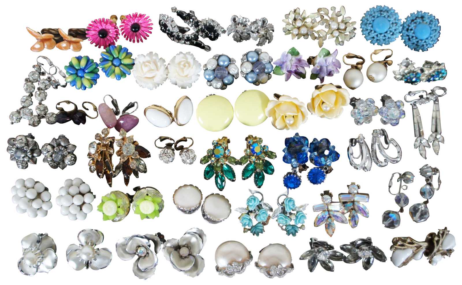 55 pair lot of vintage and antique, clip and screw back, beaded, rhinestone and ceramic costume jewelry earrings; makers/brands include Weiss, Coro, Beaujewels, and Wiesner.