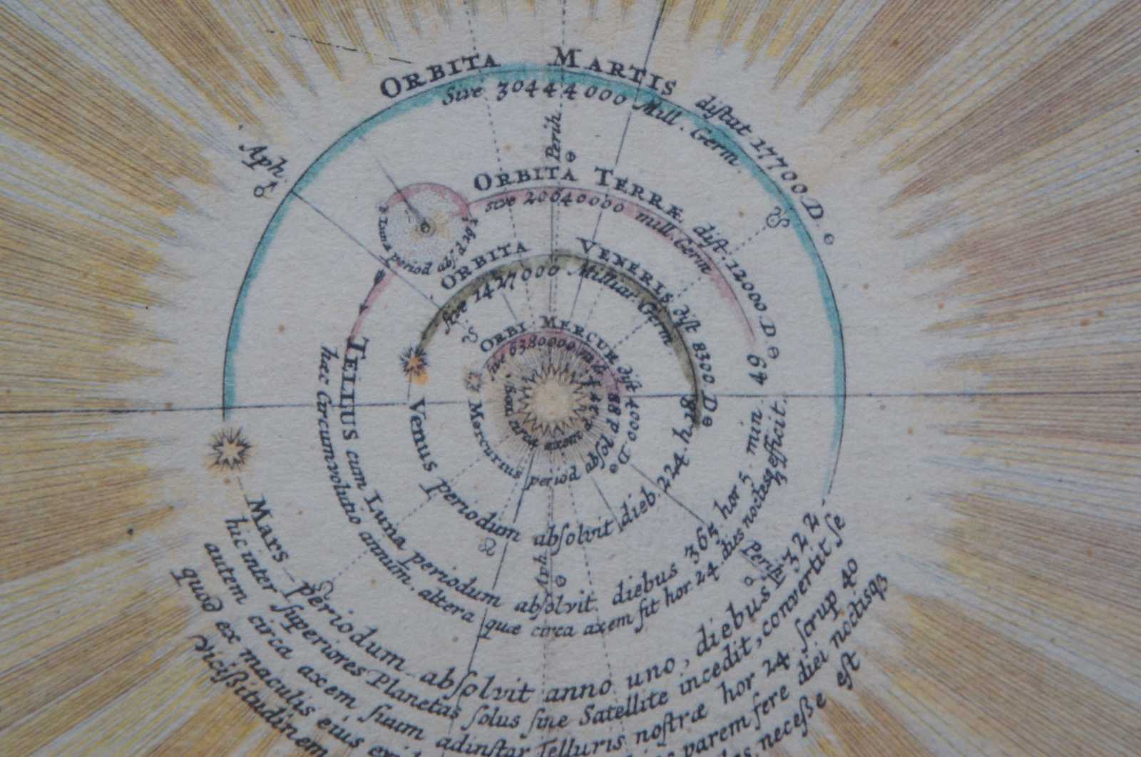Celestial atlas colored reproduction print of the “Systema Solare et Planetarium” originally designed by Johann Baptist Homann (1663-1724) in 1716. This beautifully colored and framed contemporary reproduction was produced by the Bombay Company.
