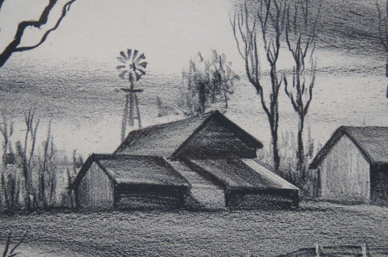 Antique country landscape print by Sanford Ross, 1936, pencil signed and numbered 7-25, titled “Willow Trees.” Sanford Ross (aka Pierre Sanford Ross - January 25, 1907 – March 1, 1954) was an American realist painter and printmaker. His urban and rural scenes of the 1930s bore the influence of Charles Burchfield and Edward Hopper. His later work focused on the landscape and rural life of Vermont where he lived at the time of his death.