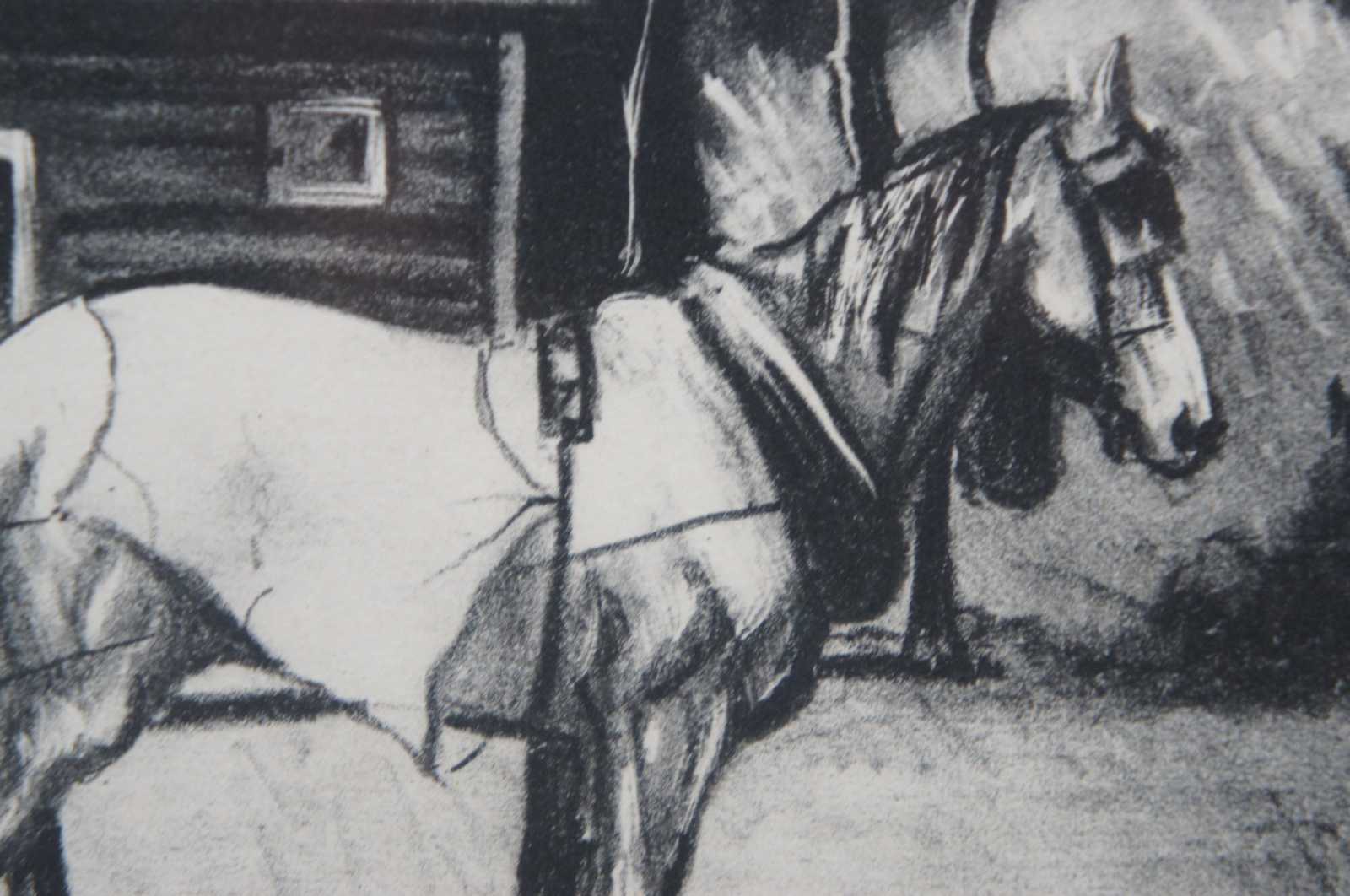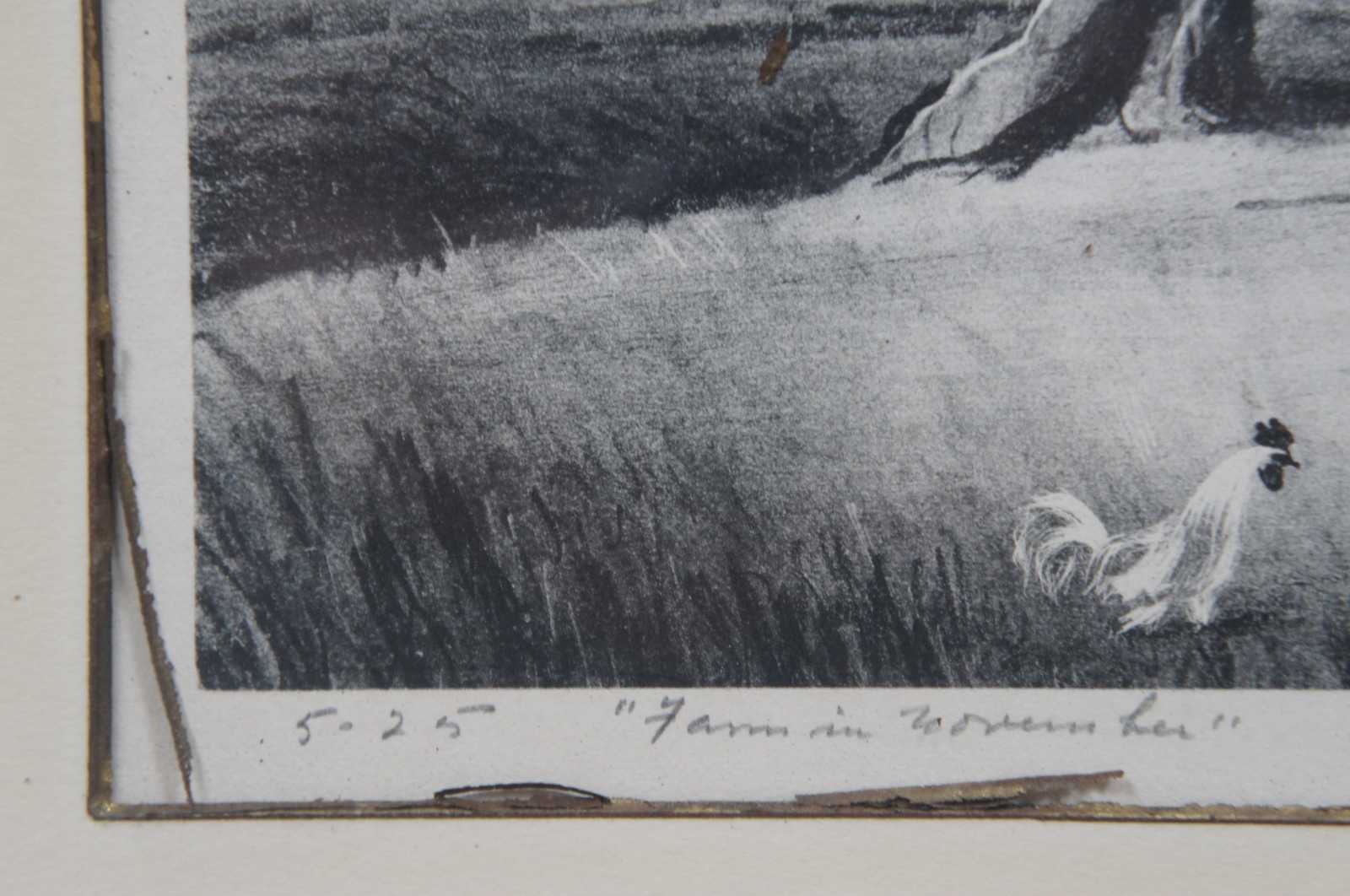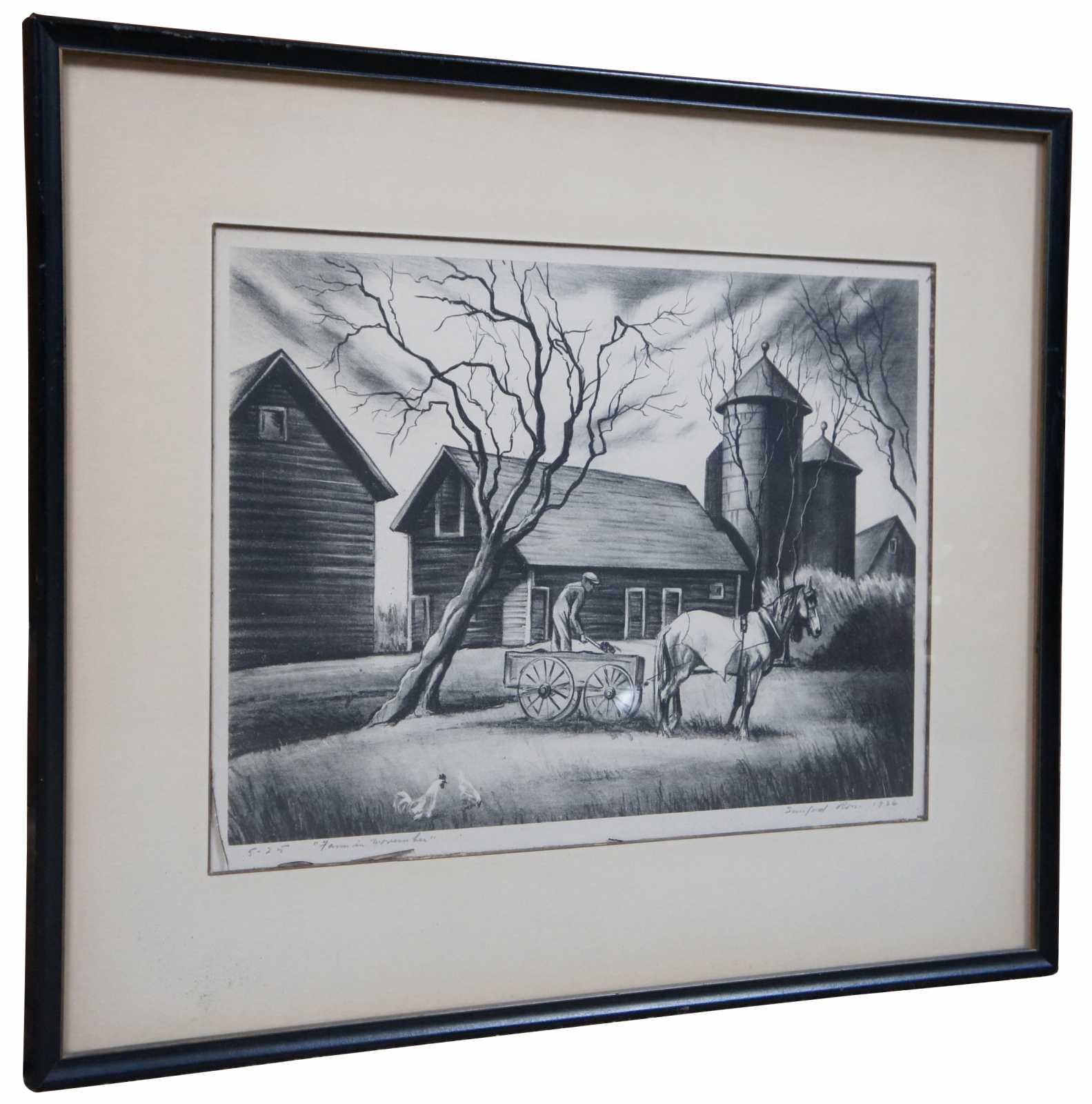 Antique farmyard landscape print by Sanford Ross, 1936, pencil signed and numbered 5-25, titled “Farm in November.” Sanford Ross (aka Pierre Sanford Ross - January 25, 1907 – March 1, 1954) was an American realist painter and printmaker. His urban and rural scenes of the 1930s bore the influence of Charles Burchfield and Edward Hopper. His later work focused on the landscape and rural life of Vermont where he lived at the time of his death.