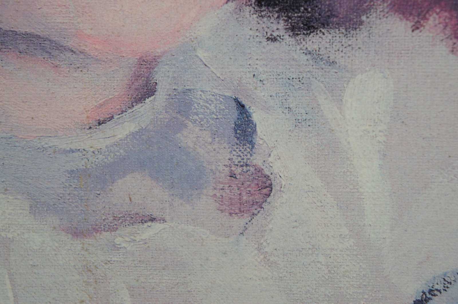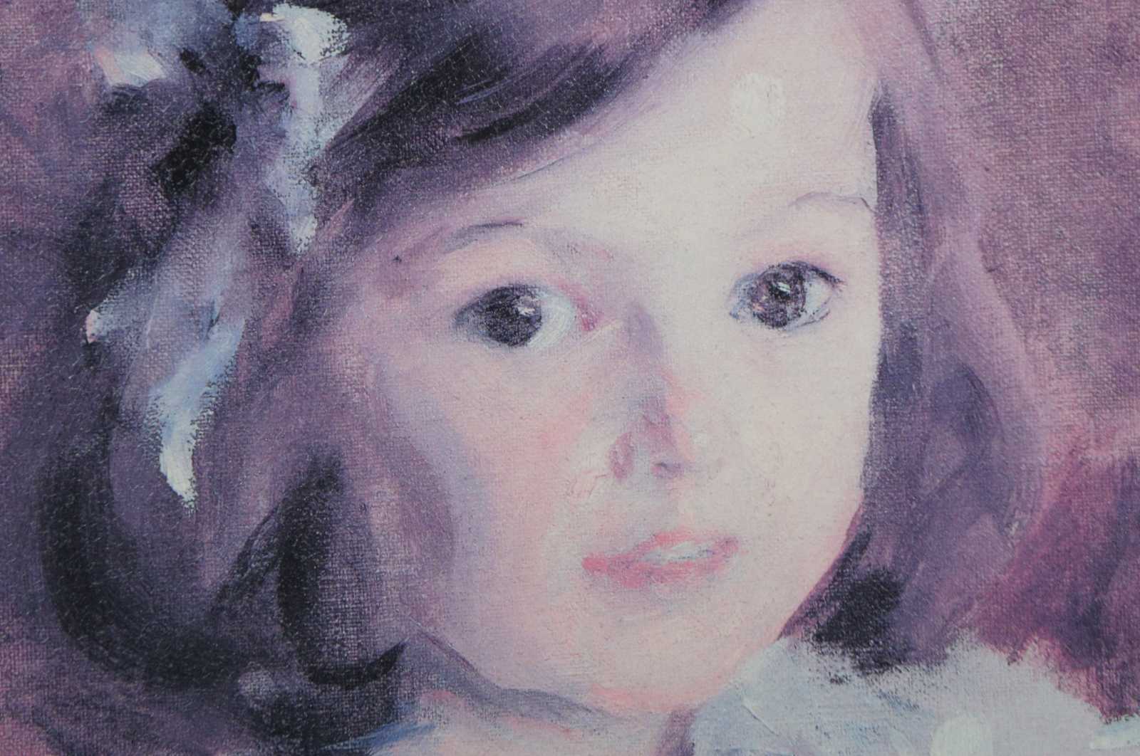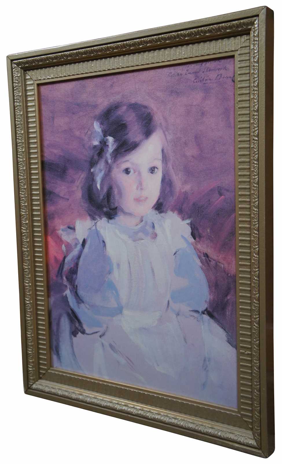 Vintage print on stretched linen showing a semi-impressionist portrait of a young girl dressed in blue and white.
