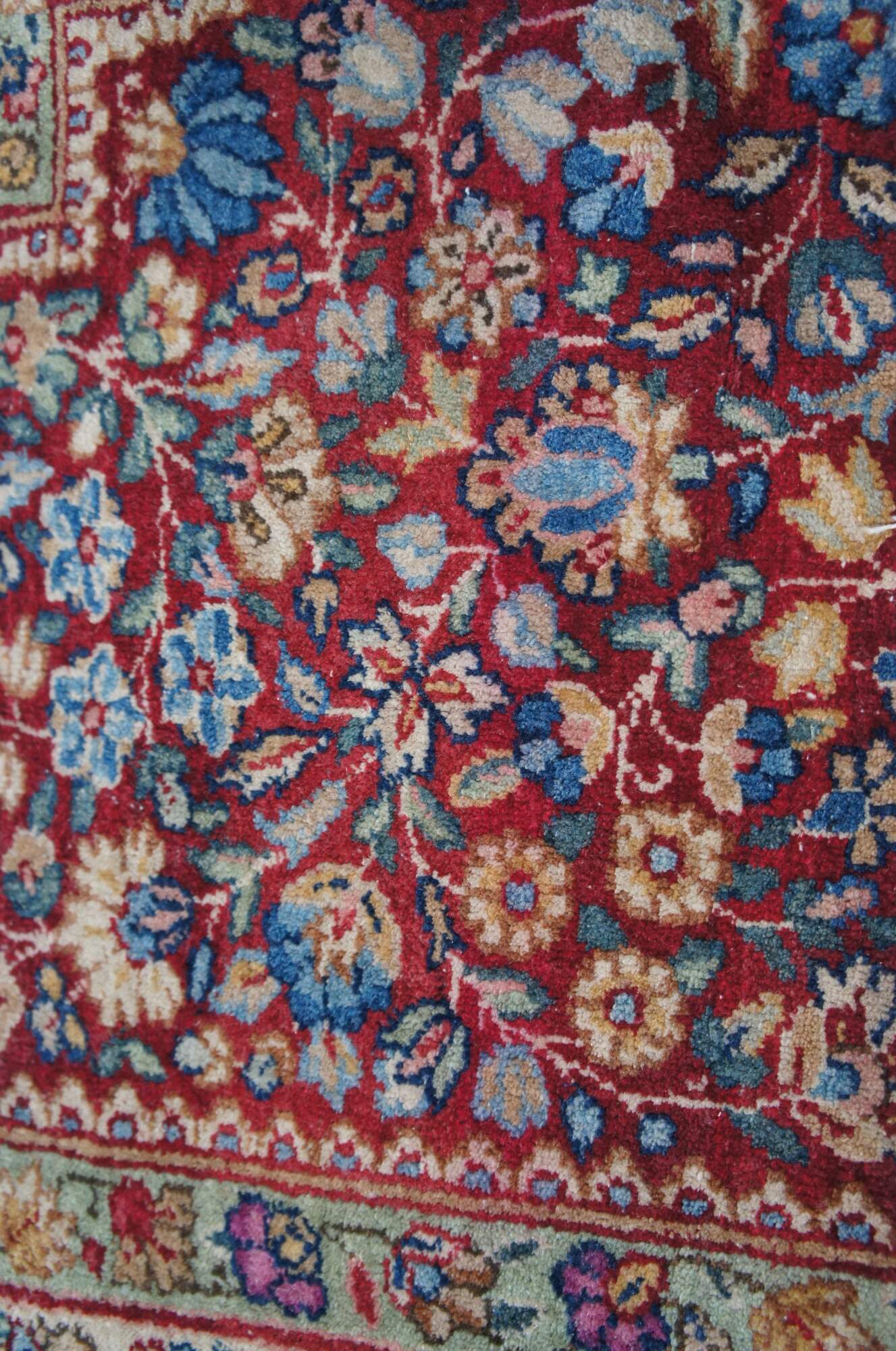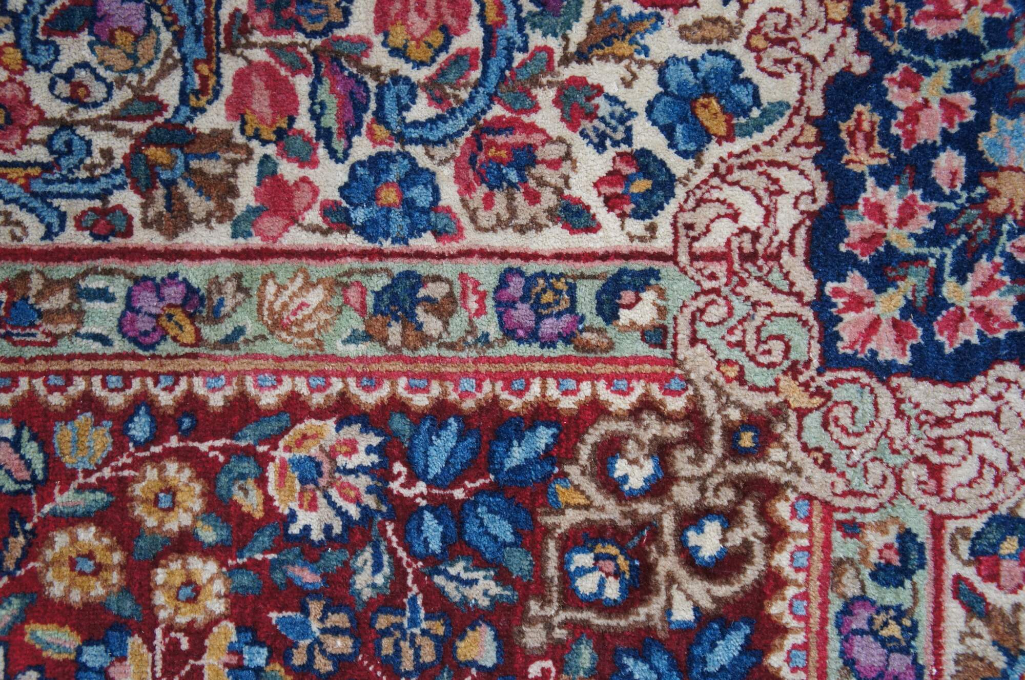 An amazing handmade area rug,circa 1940-50s. Features a red base with a colorful geometric field of flowers. Includes a boquet along each straight flanked by pendeloques along the corners. The color combinations combined with the amazing intricate detail creates a true masterpiece of the weaver's art, a rug that will bring harmony and style to a room. 196 knots per square inch