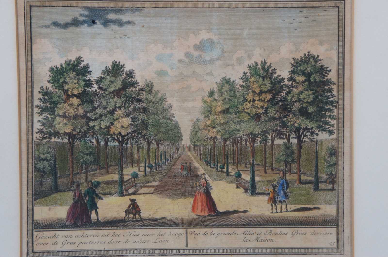 Pair of 19th cenutyr colored engravings showing scenes and ground plans for the Mansion and Gardens of Waterlant and the Villa de Beverwyk, labeled in French and German.
