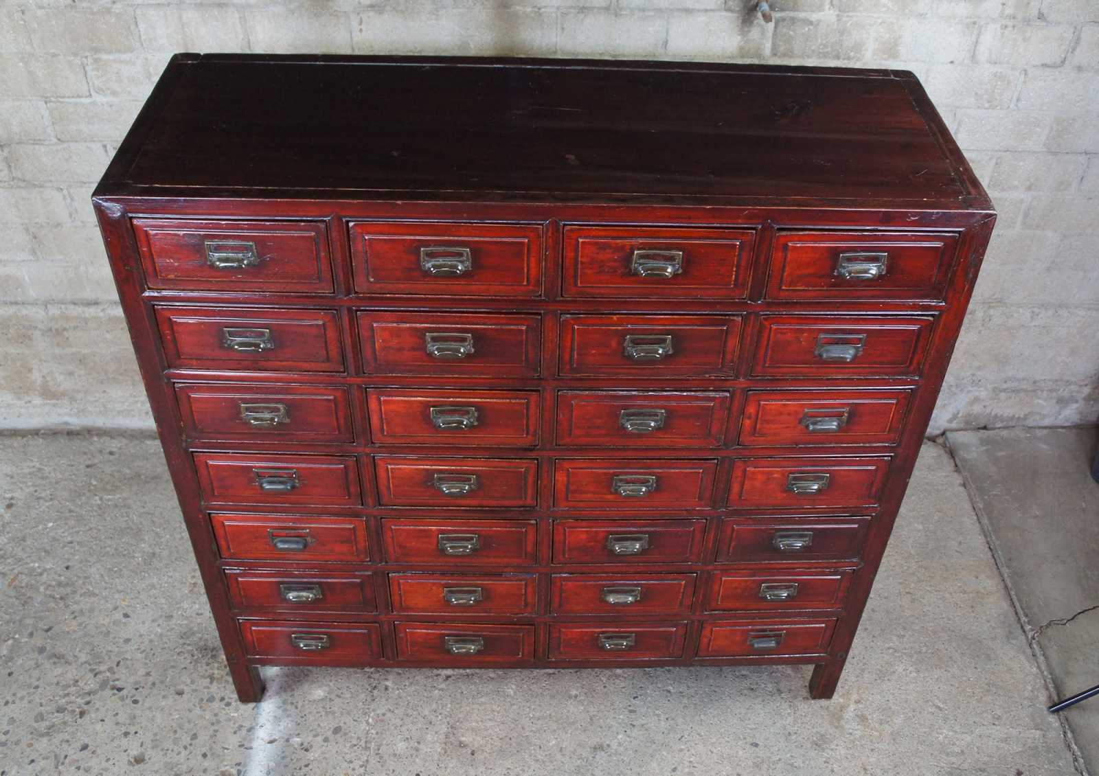 Chinese apothecary, pharmacy or medicine chest, circa 19th century. Made from lacquered elm with mortise and tenon construction. Features 28 partioned drawers with metal hardware.