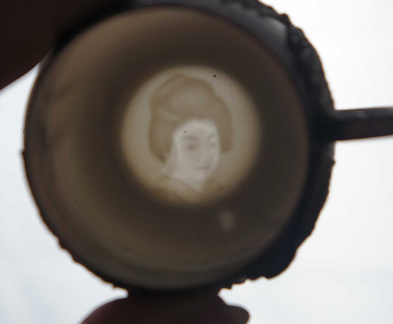 Lot of seven assorted vintage porcelain demitasse cups and saucers, including on satsuma style cup with a lithopane portrait of a geisha or Japanese woman in the bottom. Marked Nippon, RS Germany, Bavaria and Japan.